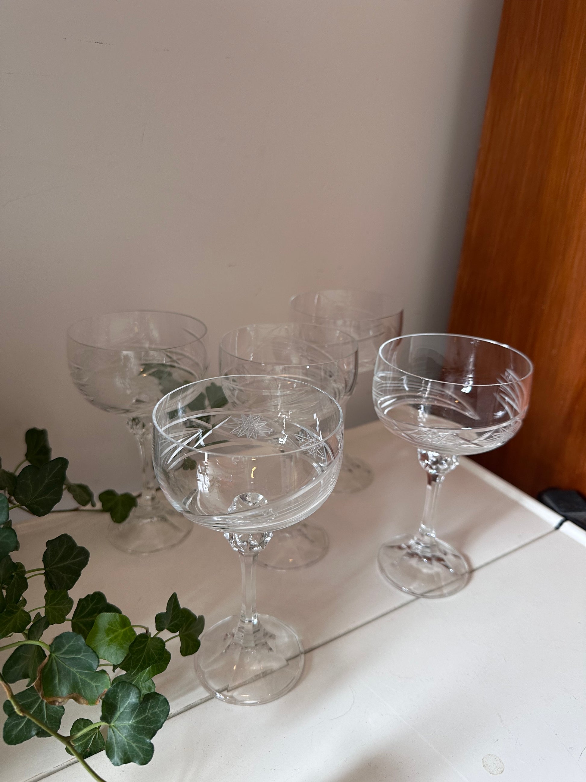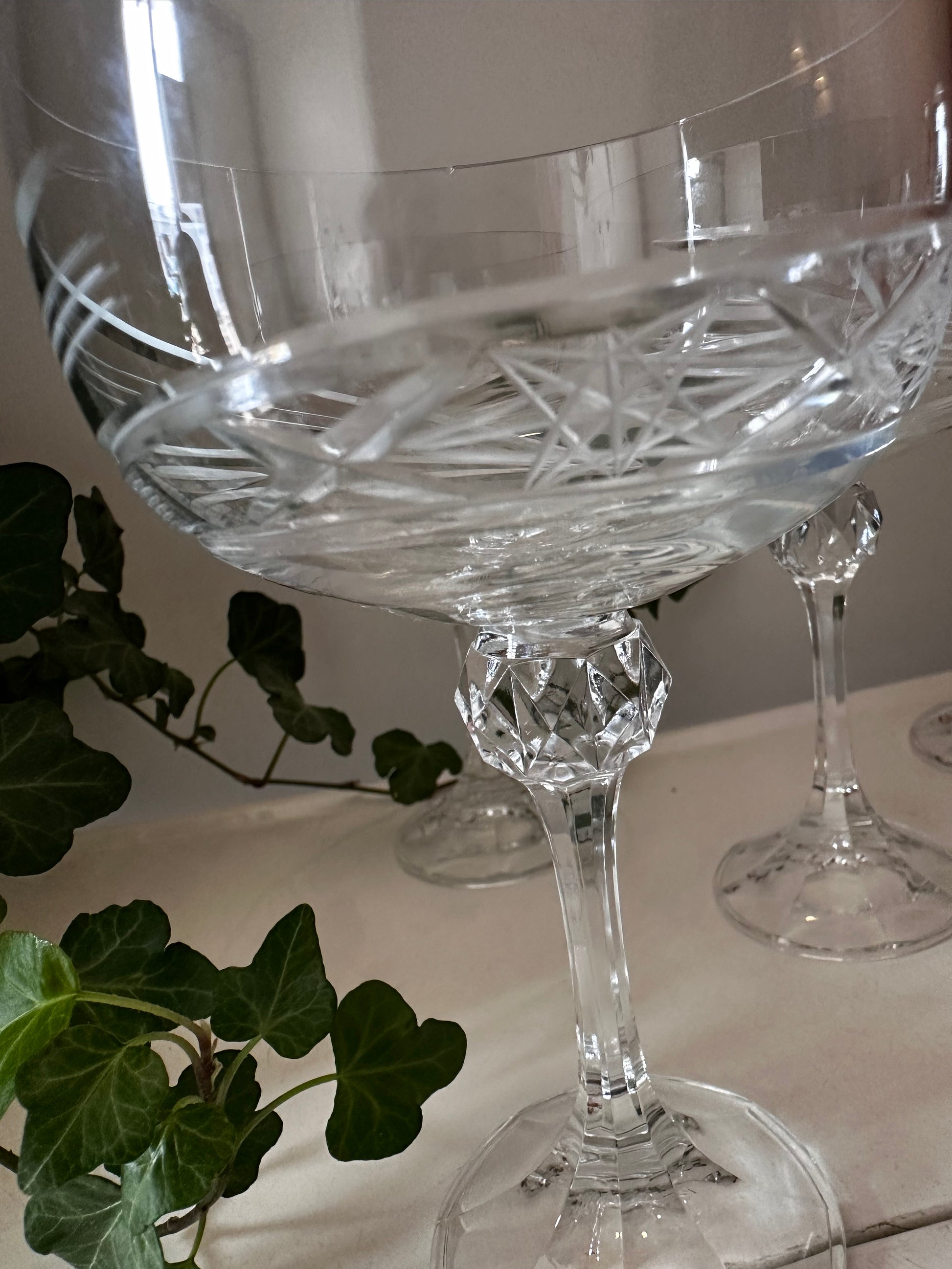 Geslaagd?! Of misschien een ander feestje? Hoe leuk om champagne te drinken uit deze fantastisch mooie coupe champagne glazen. Prachtig uitgeslepen design. Glazen zijn van kristal en dateren jaren 70. Q38