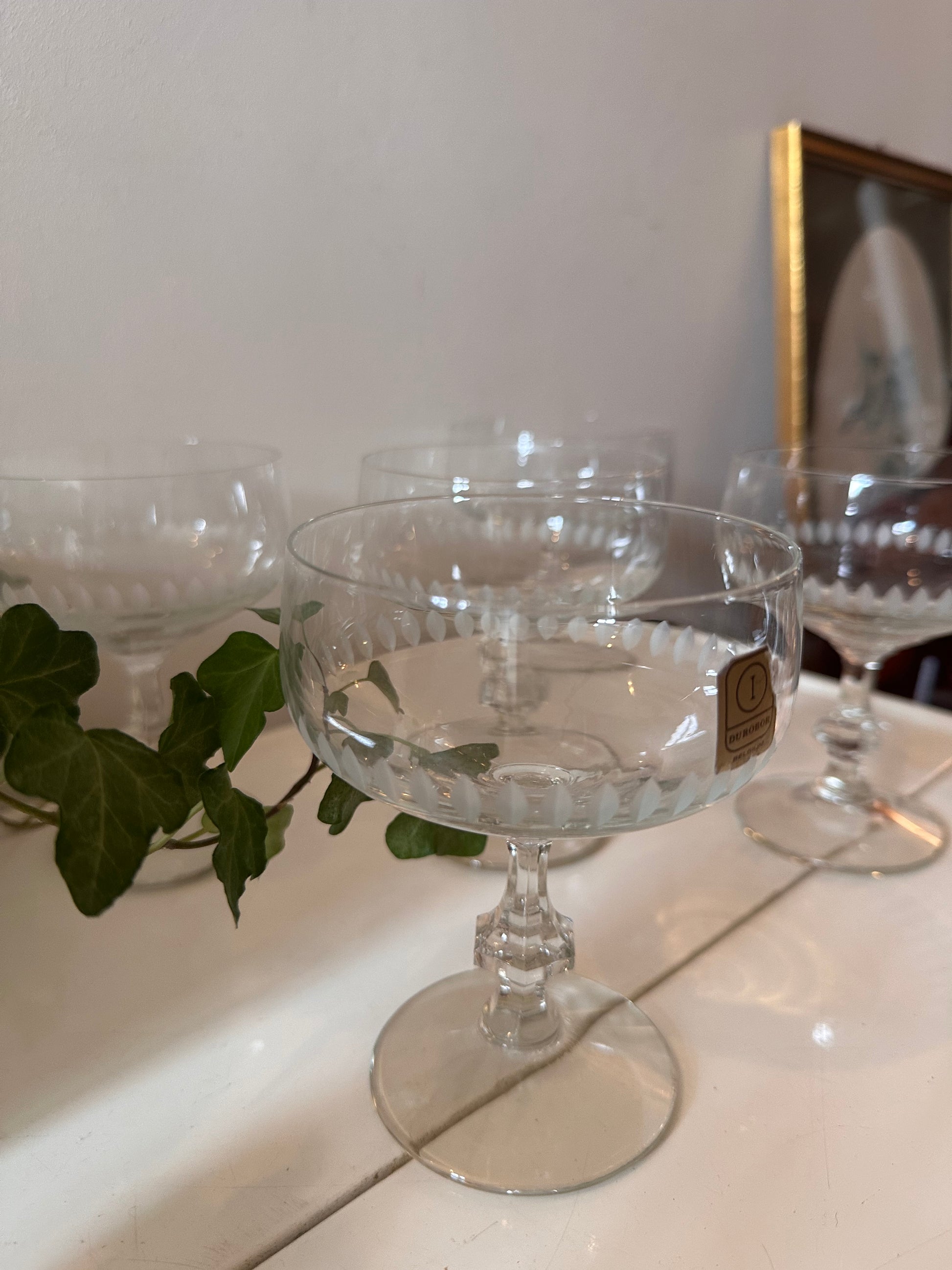 Hoe stijlvol zijn deze! Mooie vintage coupes van het Belgische merk Durobor, met geslepen bladmotief en een chique geslepen voet. Perfect voor champagne of feestelijke cocktails, en ze staan ook prachtig als dessertglas op tafel. Helemaal in een mooie vintage staat. Q34