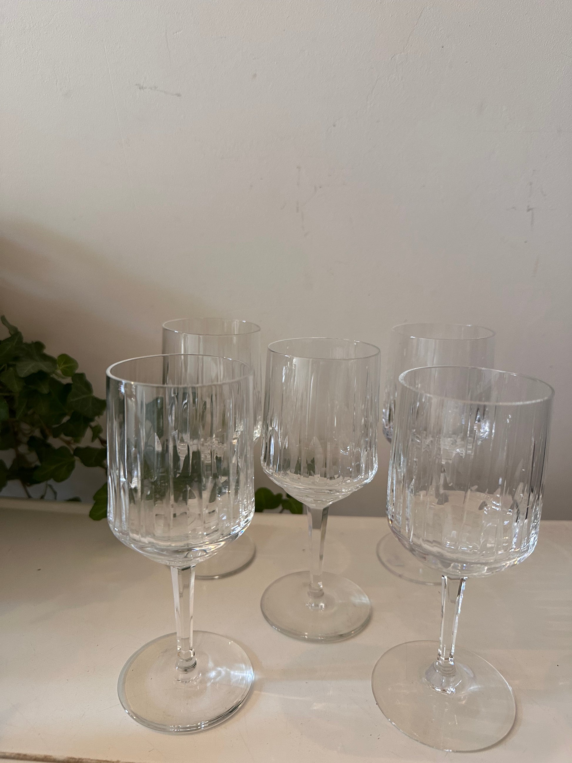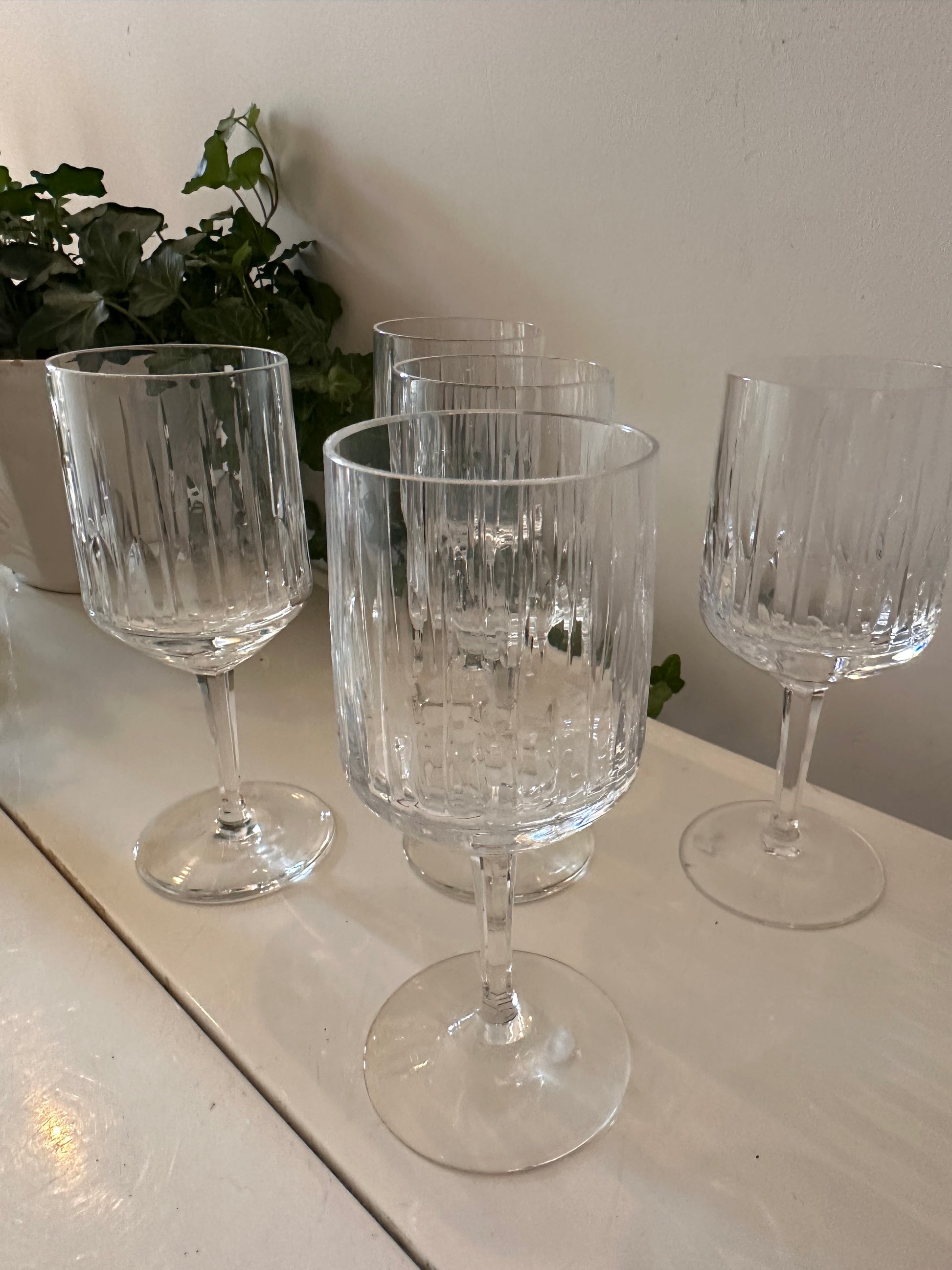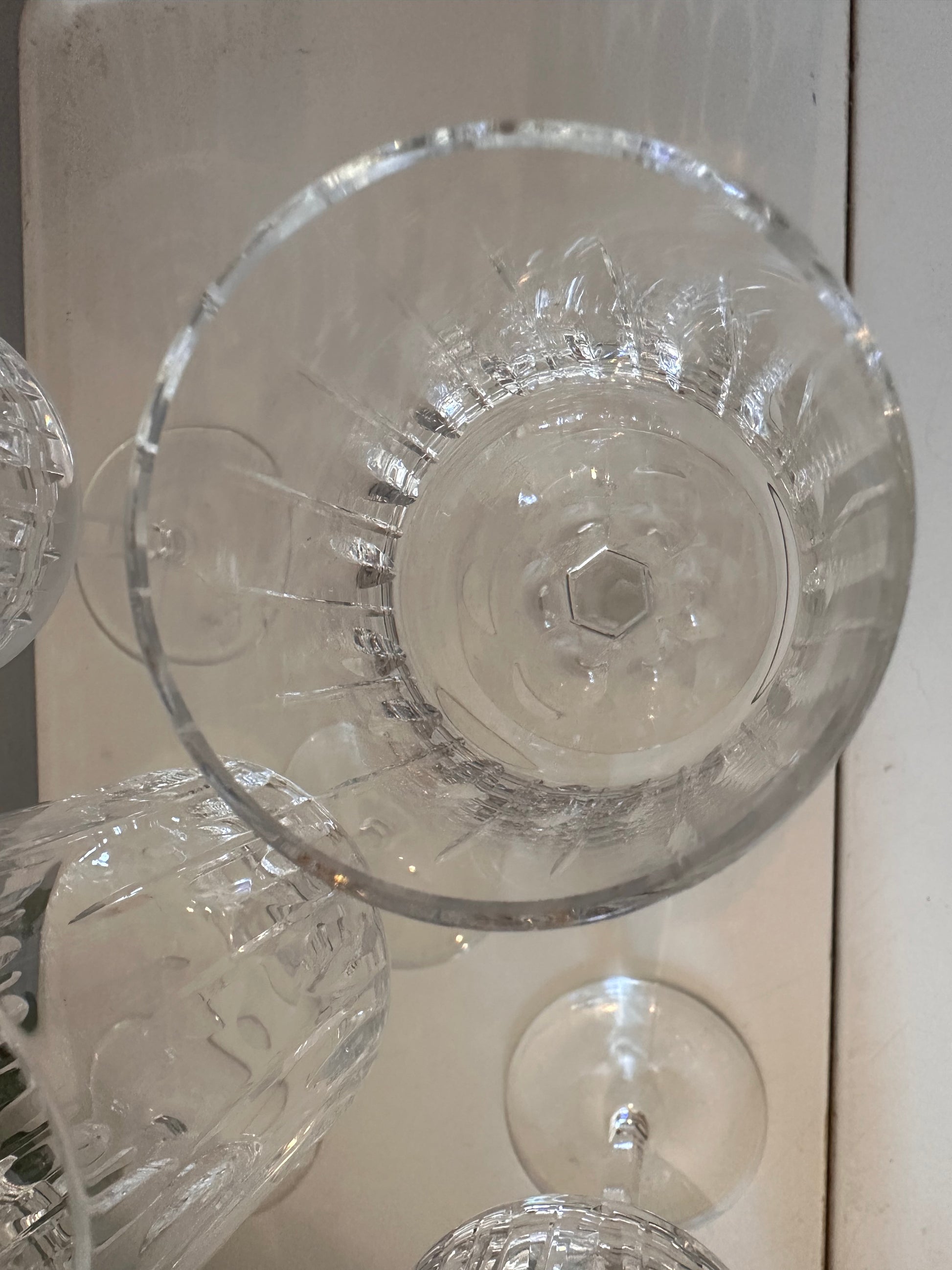 Toffe set uit de jaren 60 met een strak geslepen patroon in het glas – klassiek, maar met die geweldige midcentury stijl. De glazen hebben een fijne helderheid en liggen lekker in de hand, ideaal voor wijn of een mooi mixdrankje. Q392