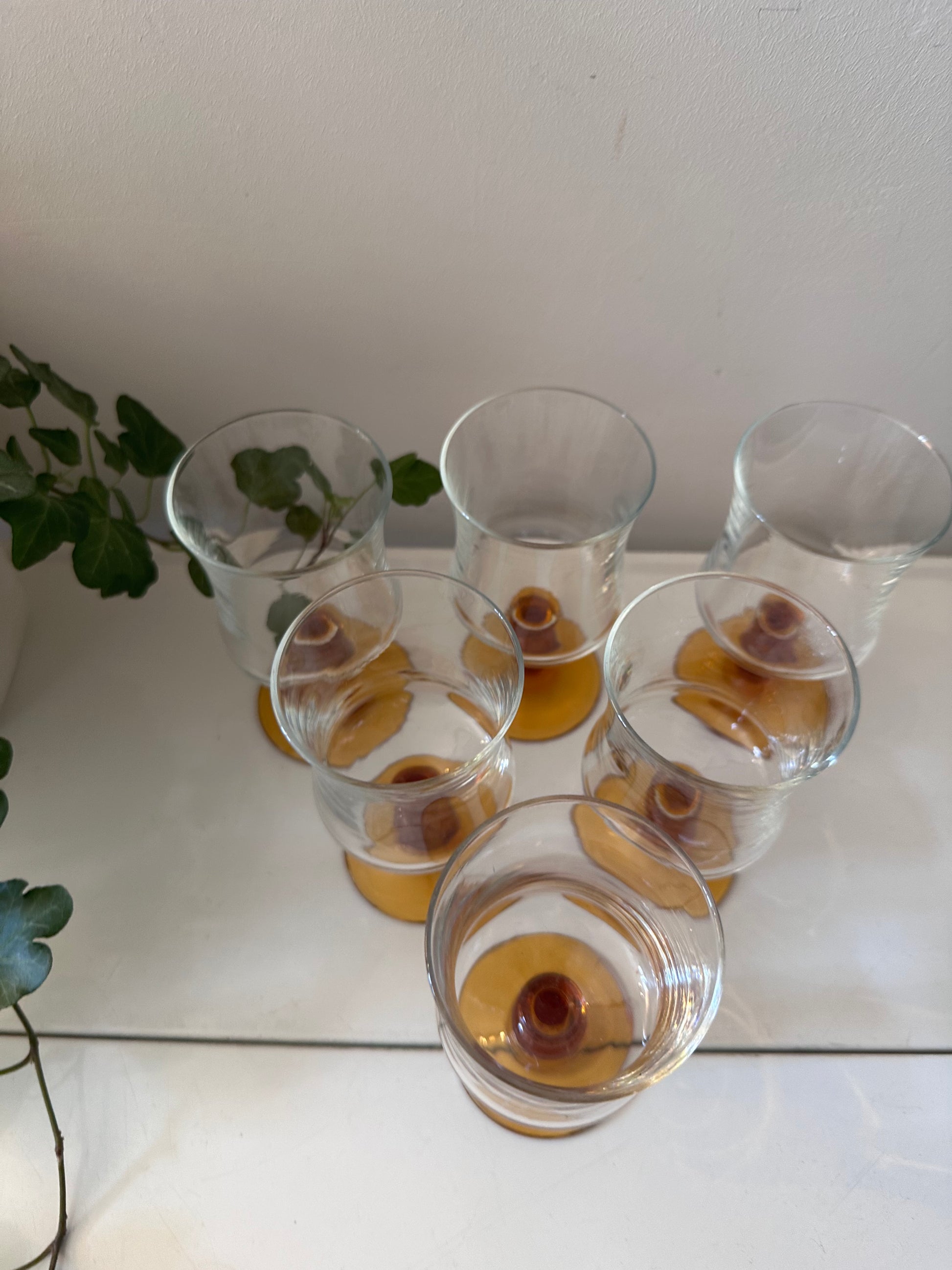 Top set vintage wijnglazen met een amberkleurige voet en een mooi gevormde kelk. Deze glazen zijn Mid Century en in een supermooie vintage staat. Afmetingen hoog 13 cm breed 6 cm. Q761