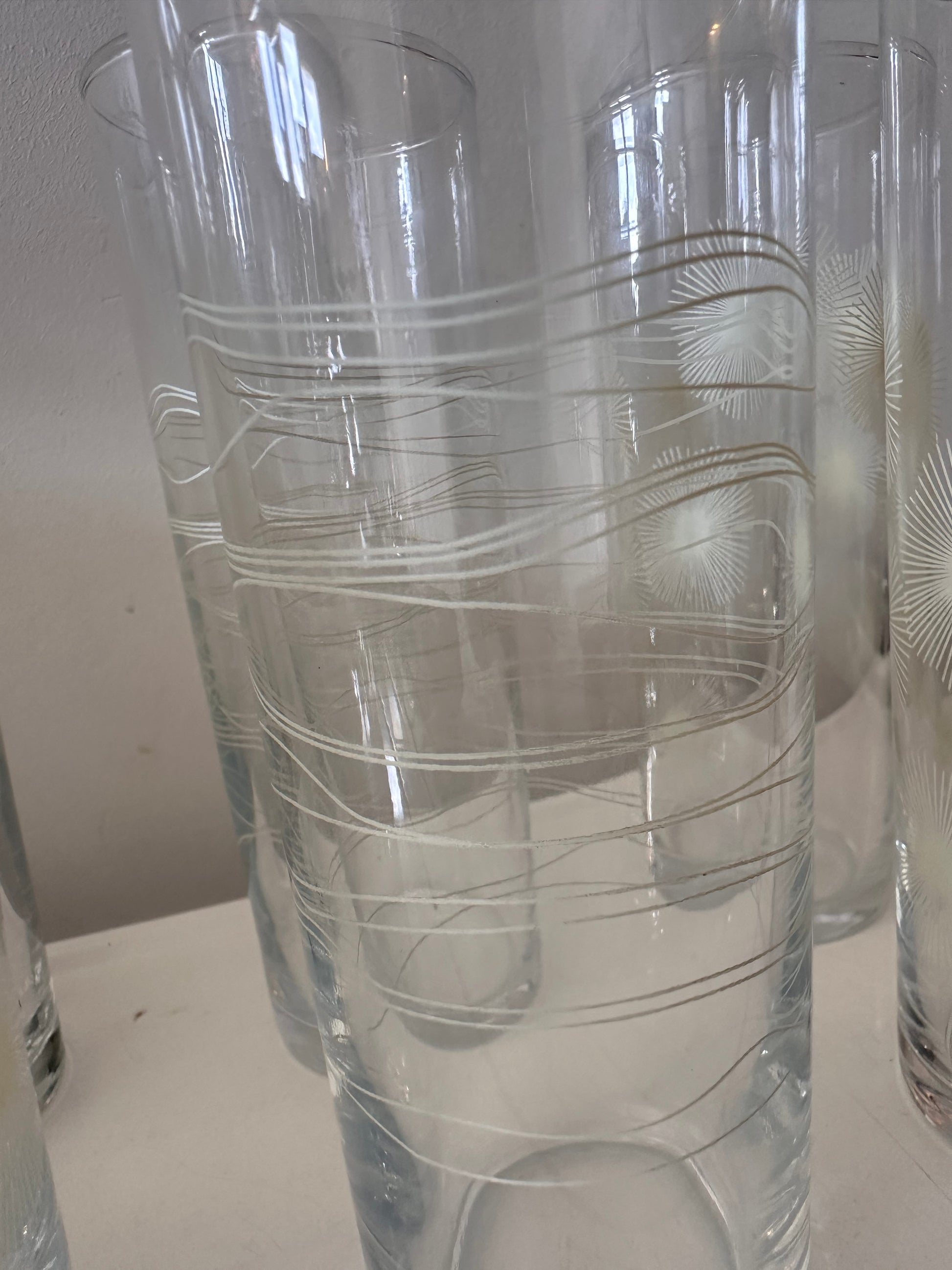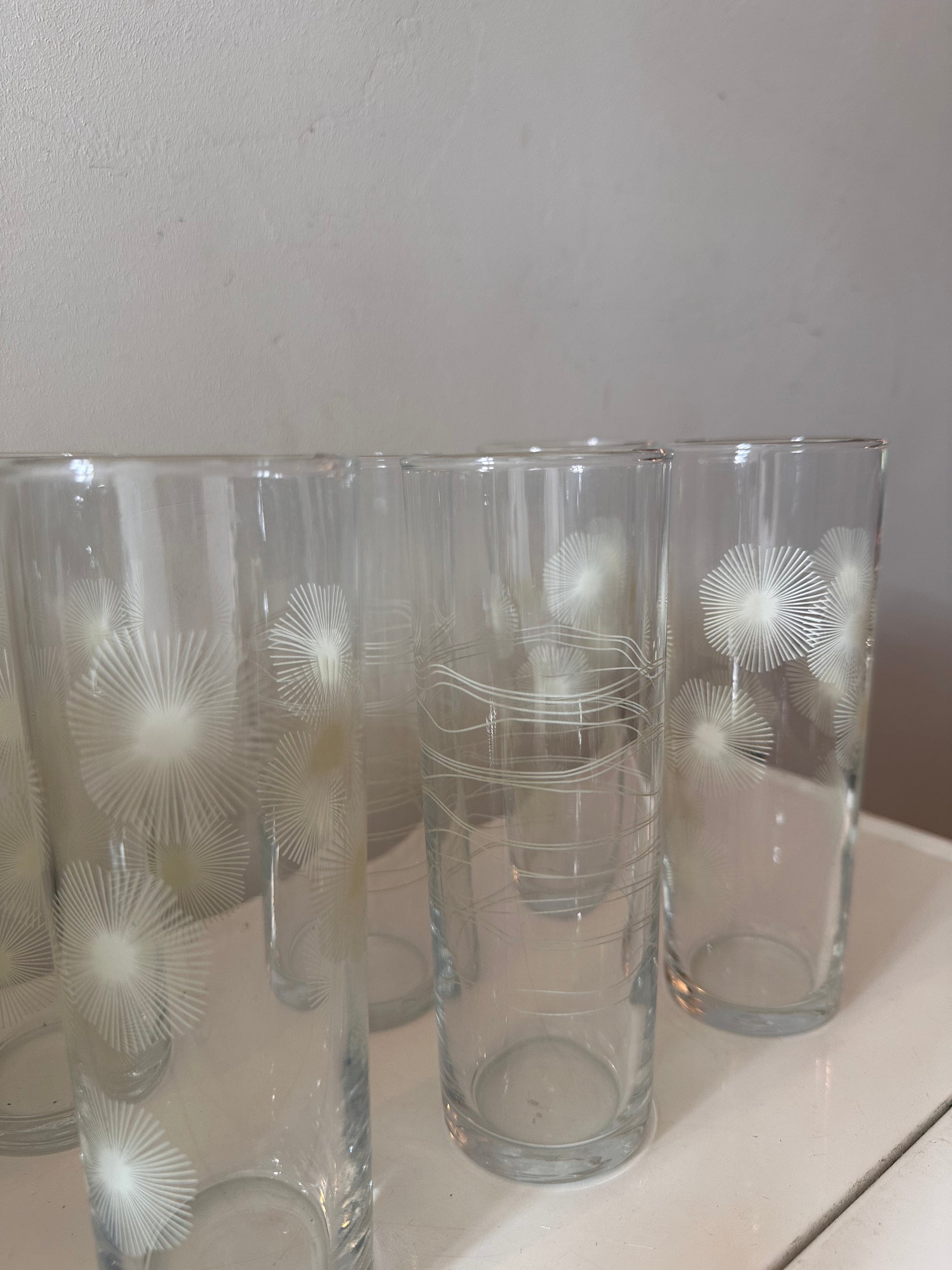 Strakke retro vibe! Set van zes longdrinkglazen met geëtste patronen: grafische lijnen en zonnestraal-achtige motieven. Echt typisch seventies glaswerk dat je niet vaak meer tegenkomt. Perfect voor fris, mixdrankjes of gewoon water, maar stiekem ook leuk in een vitrine.