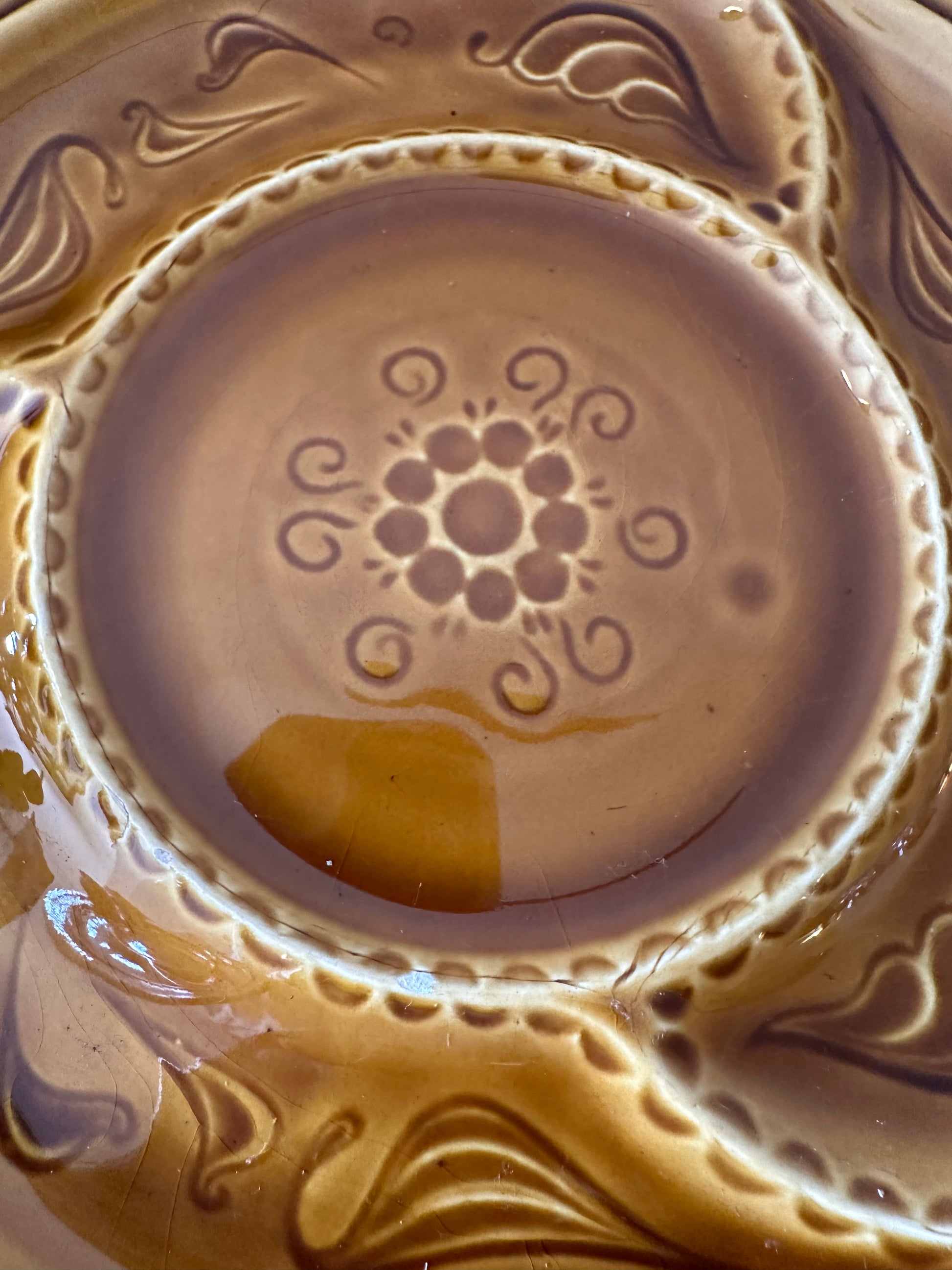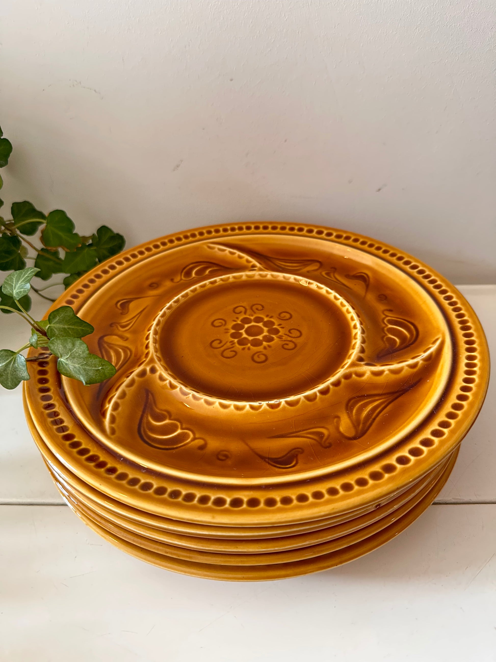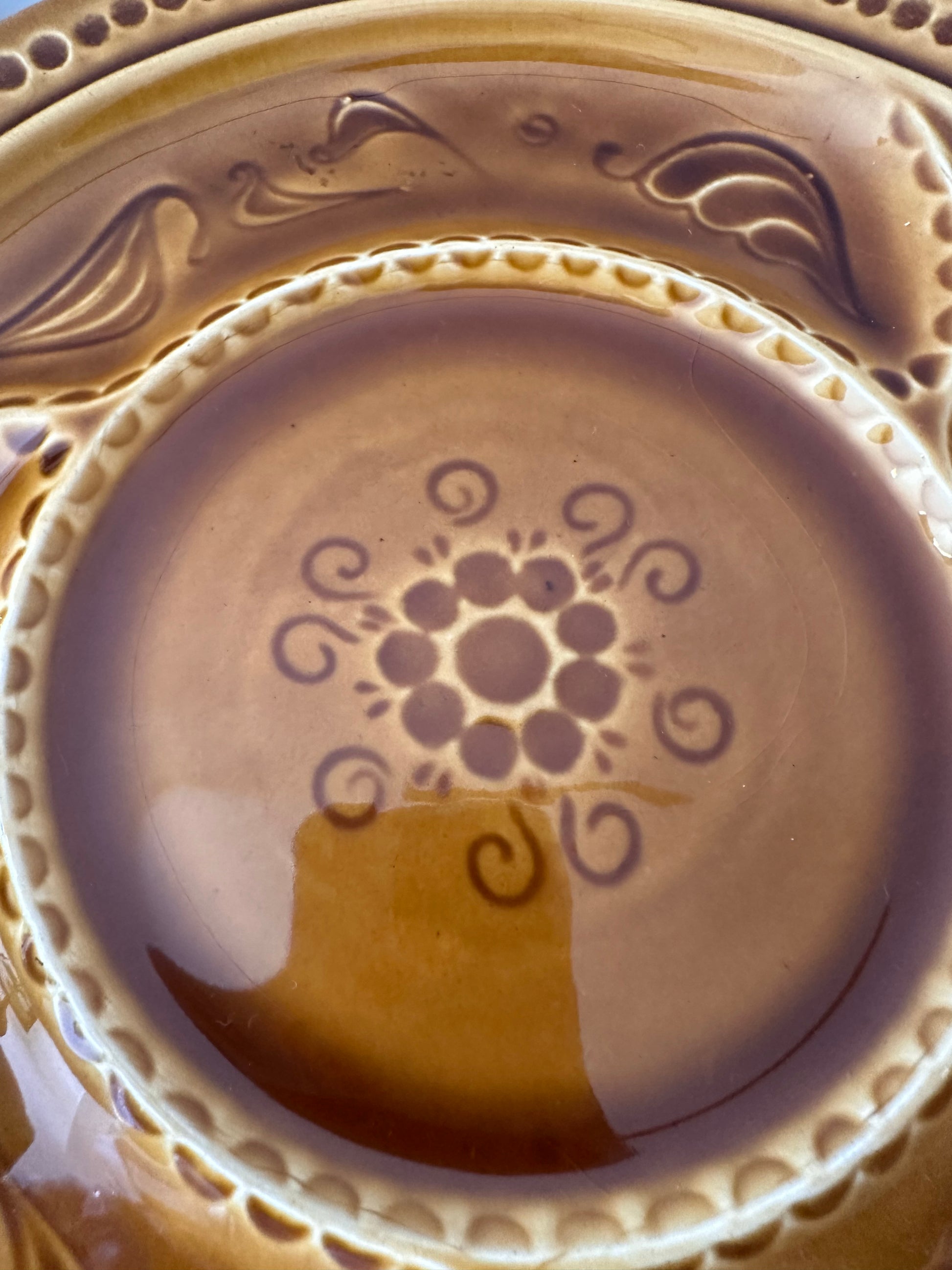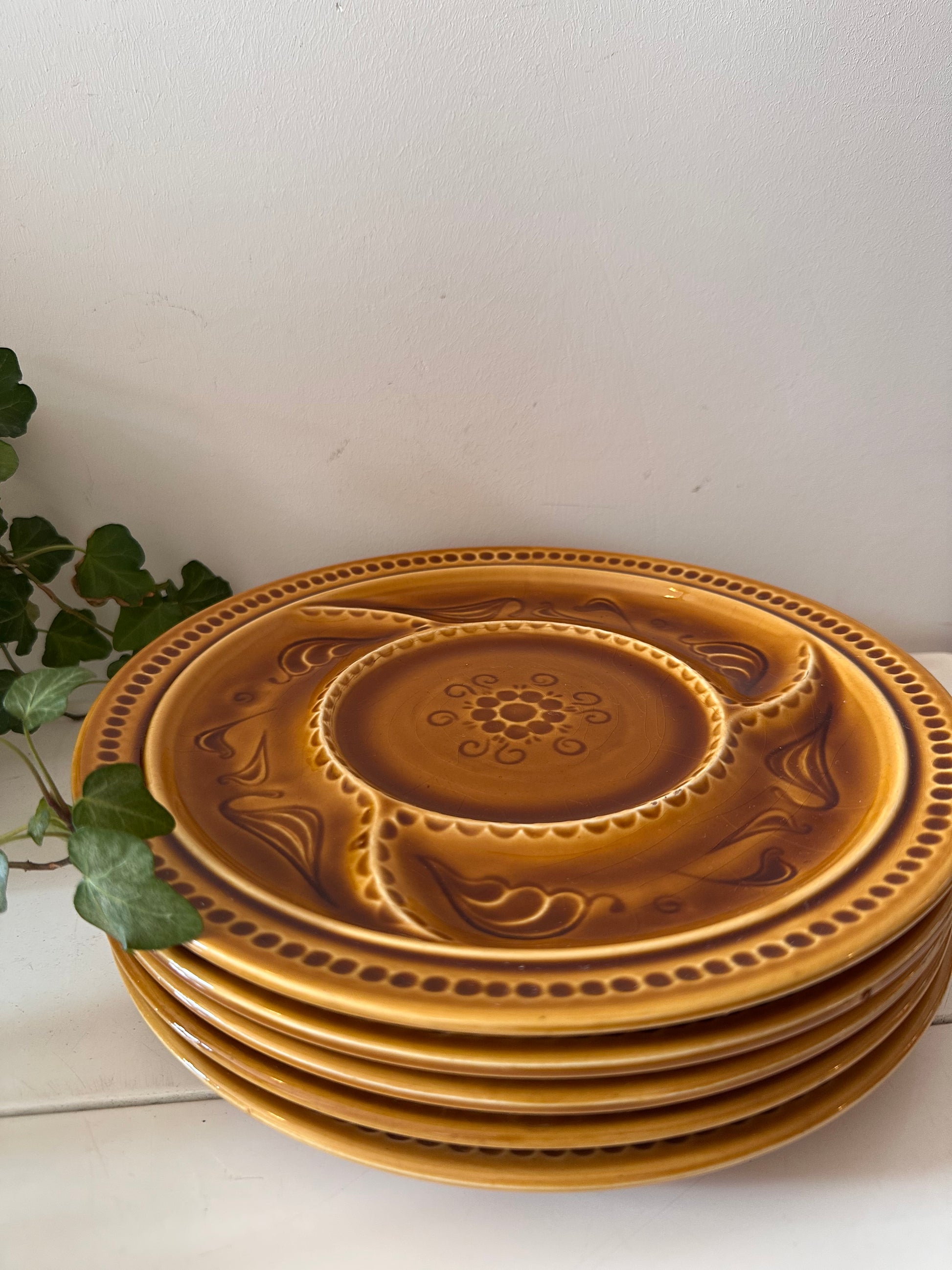 Hoe retro wil je het hebben? Deze keramieken borden knallen in dat warme karameltintje! Met een sierlijk reliëfpatroon, lekker zwaar en robuust. Perfect voor een vintage gedekte tafel of gewoon om je servieskast wat meer karakter te geven. Eén bord heeft een klein chipje/beschadiging aan het reliëf (zie foto), verder in prima vintage staat. Q227