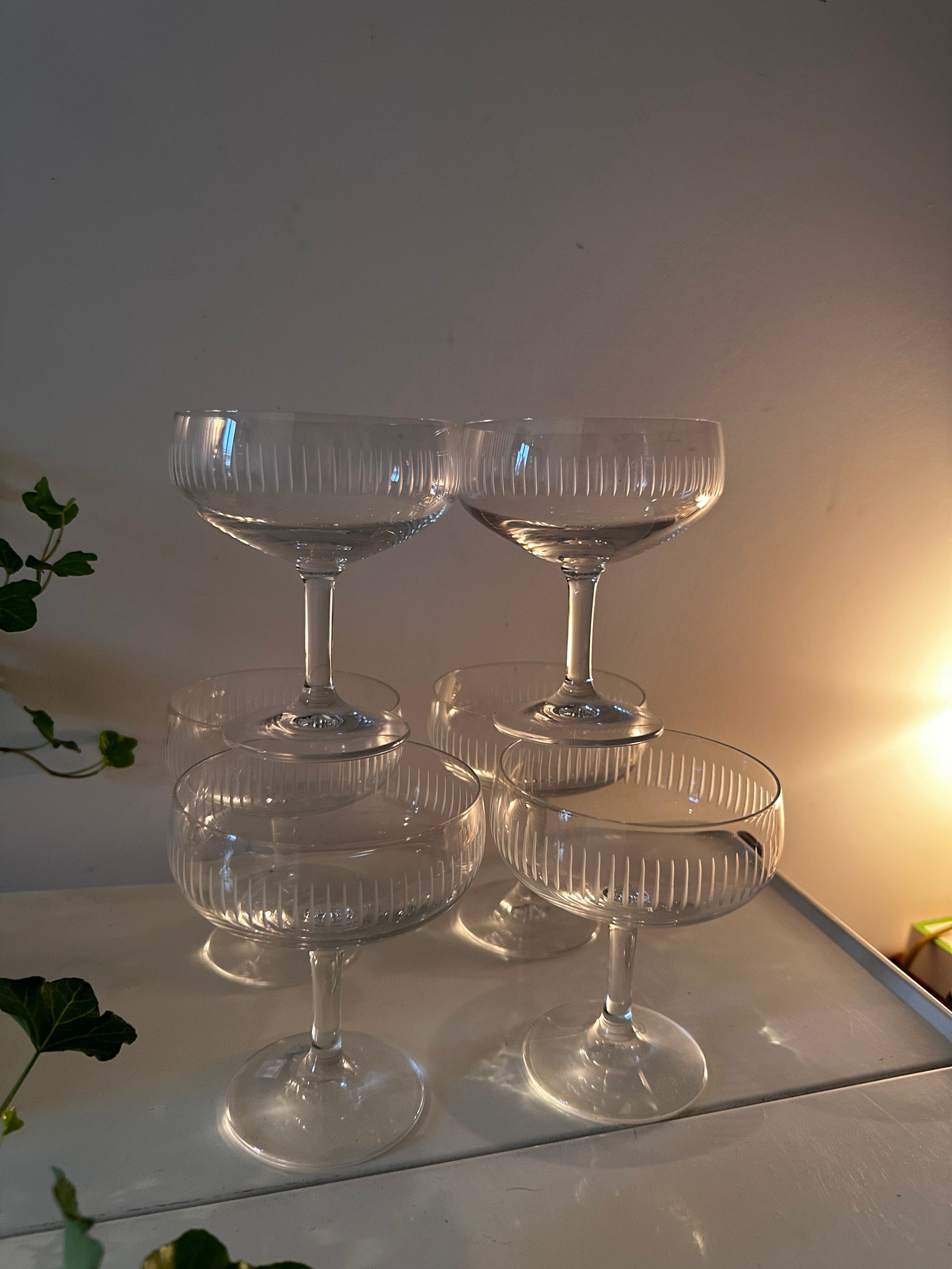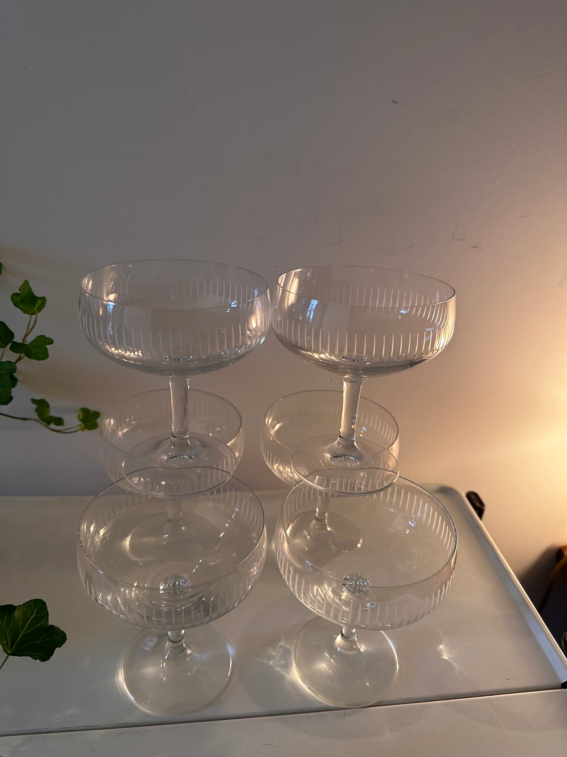 Set van 6 prachtige kristallen coupe champagne glazen. Glazen zijn in een mooie vintage staat. Ze zijn van dun kristal met een gegraveerd decoratief streepje onder aan het glas. Glazen dateren jaren 60 en zijn afkomstig uit Duitsland
