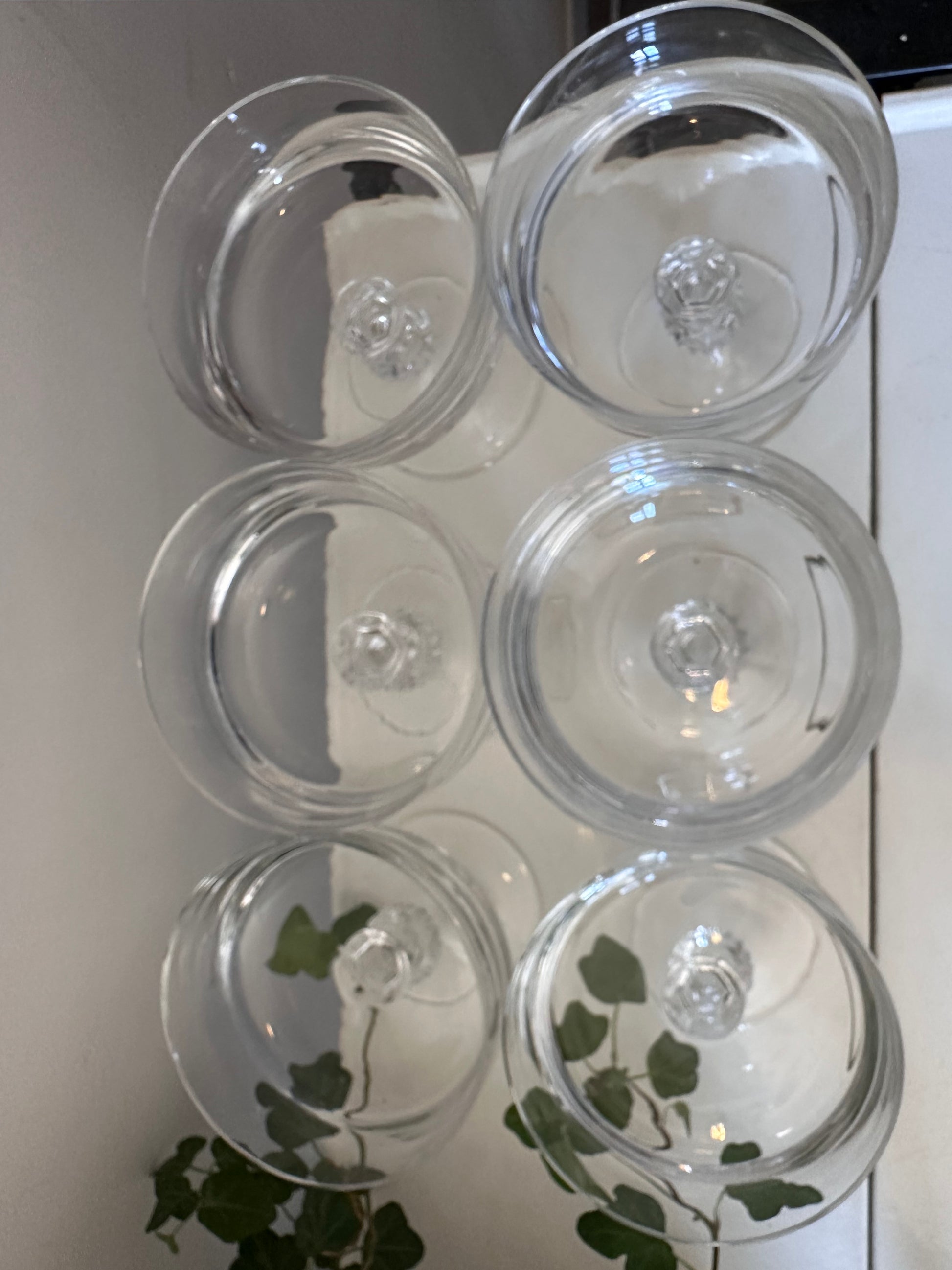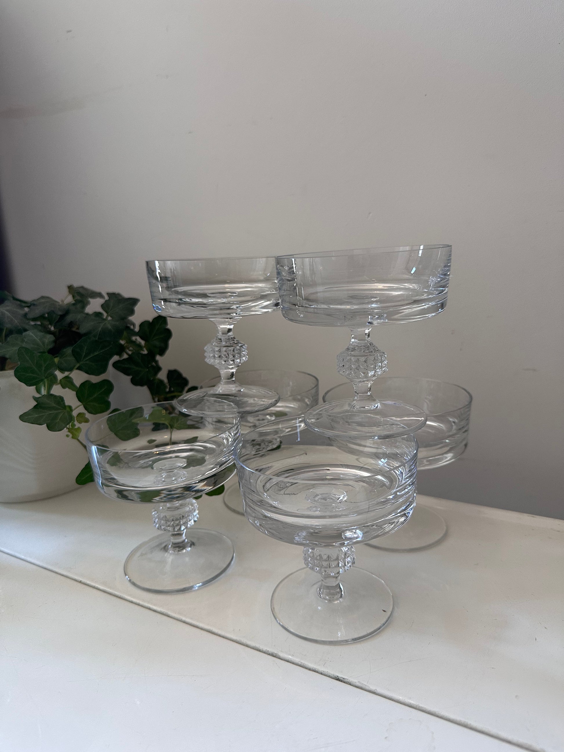 Prachtige set van zes kristallen coupes met een brede kelk en een opvallend geslepen bol in de steel. Ideaal voor champagne, dessert of een feestelijk drankje. Ze hebben een elegante, klassieke uitstraling met een mooie glans. In supermooie vintage staat. Q52