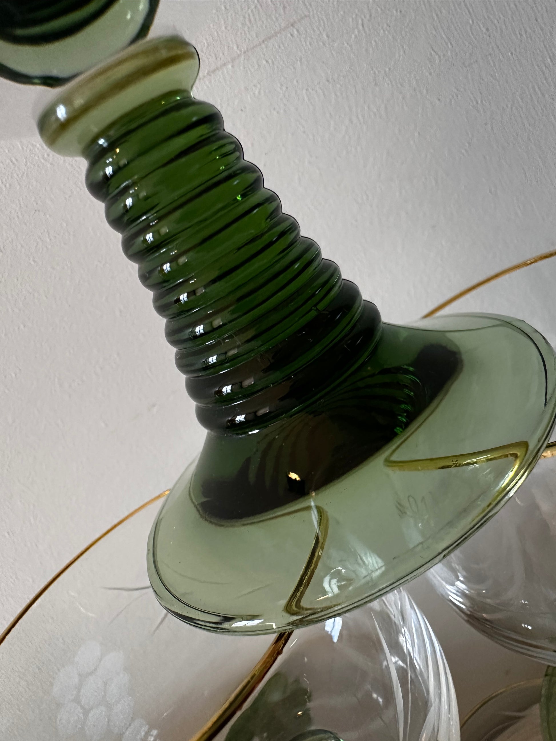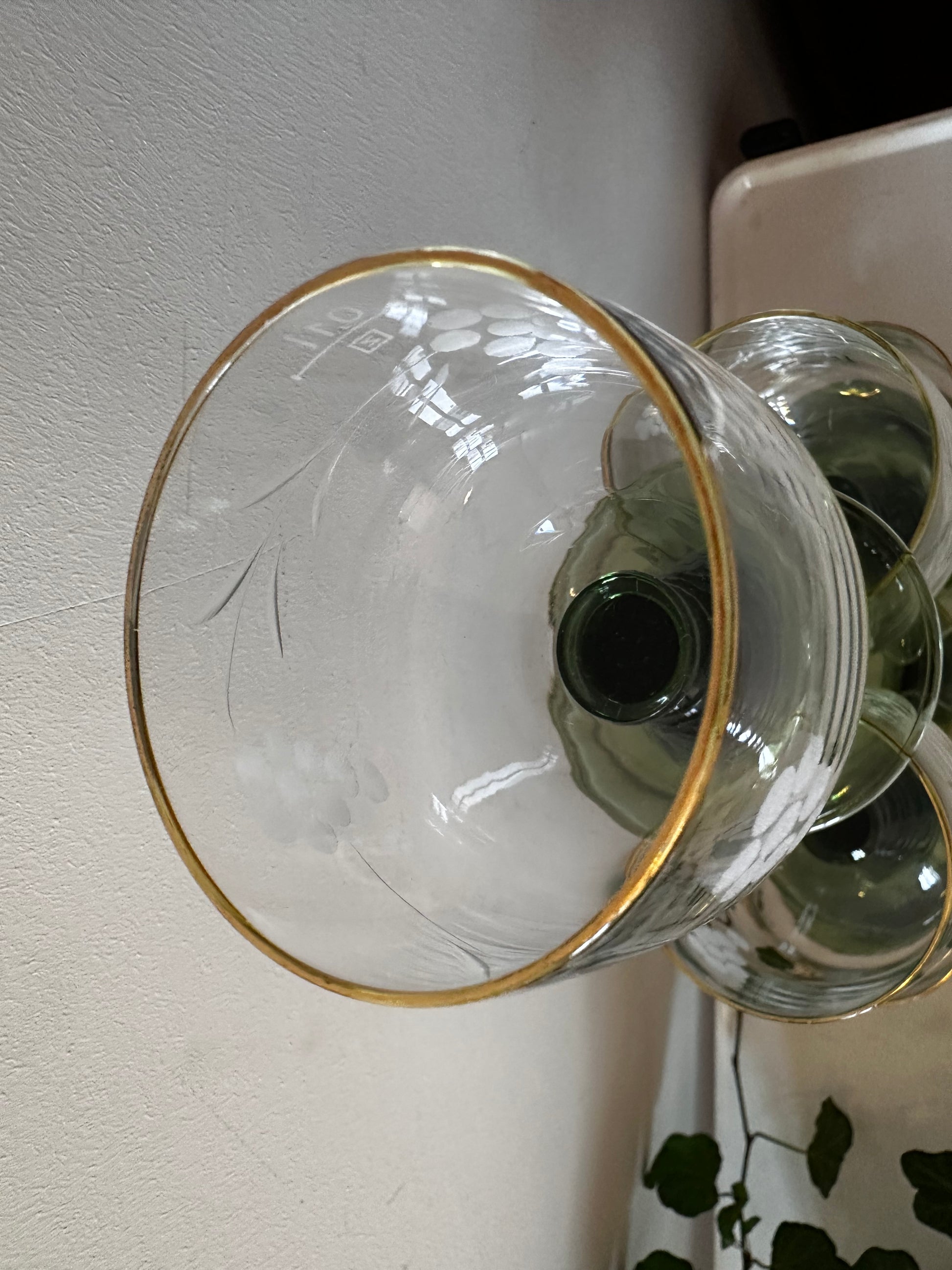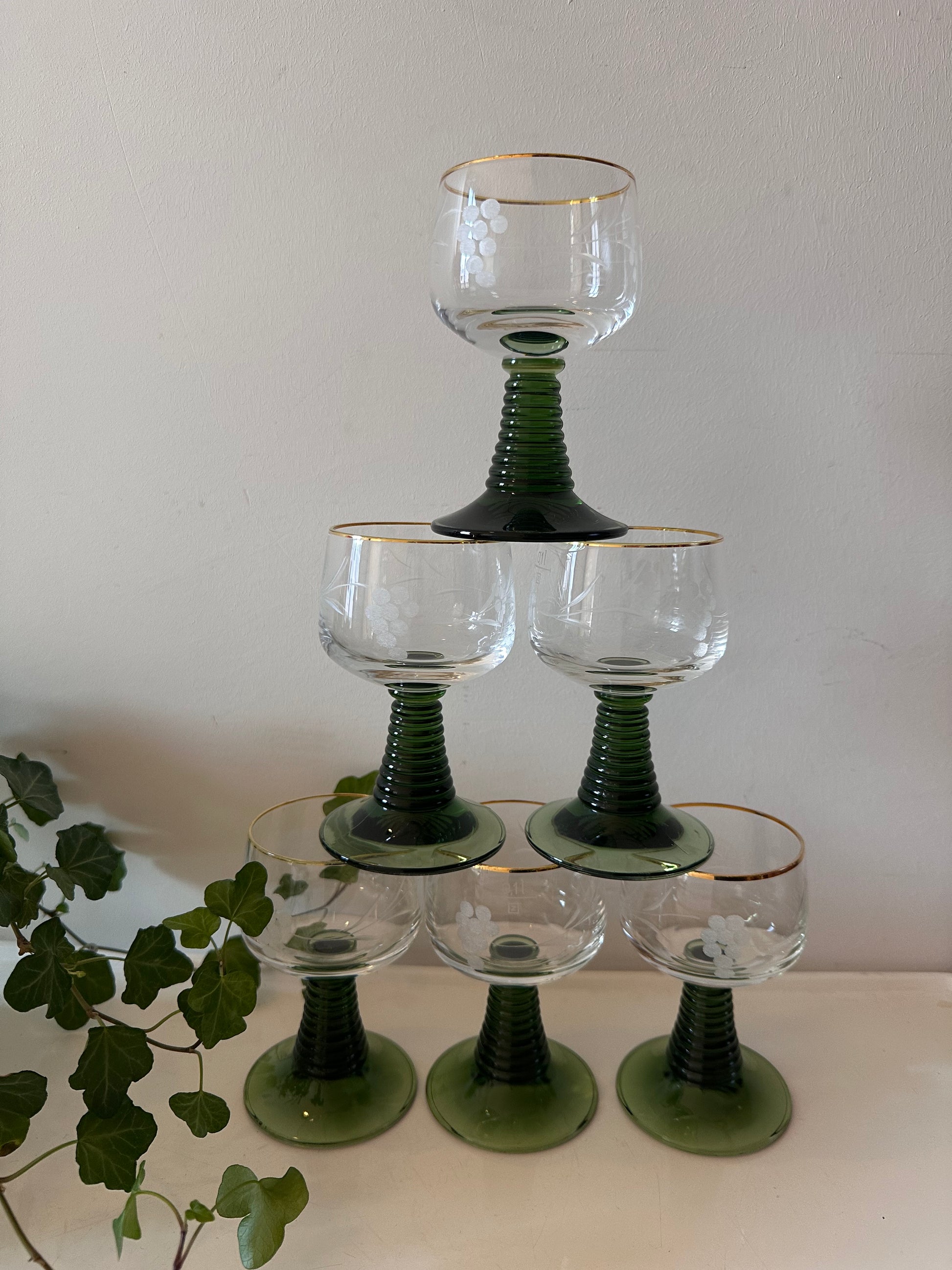 Deze prachtige vintage Roemer Moezel glazen hebben een elegante groene ribbelvoet en een subtiel gegraveerd druivenmotief, afgewerkt met een fijne goudrand. Inhoud 0,1 ltr