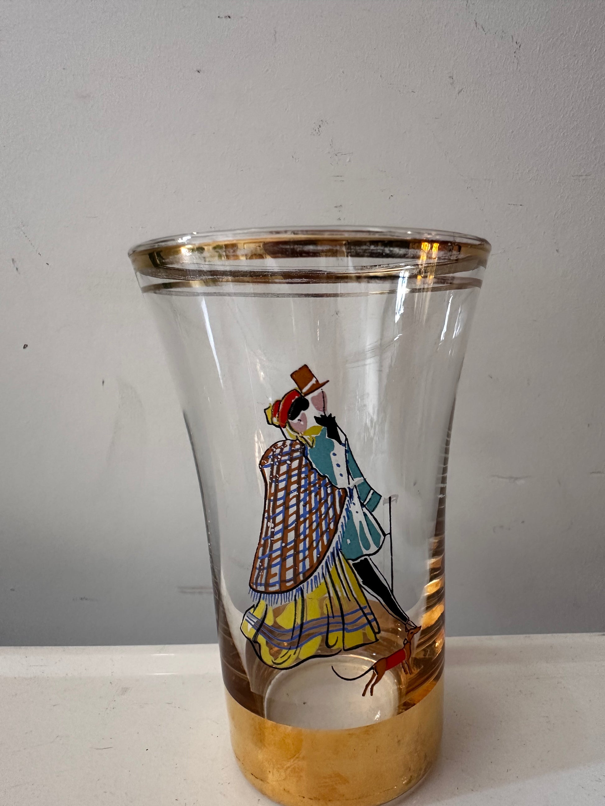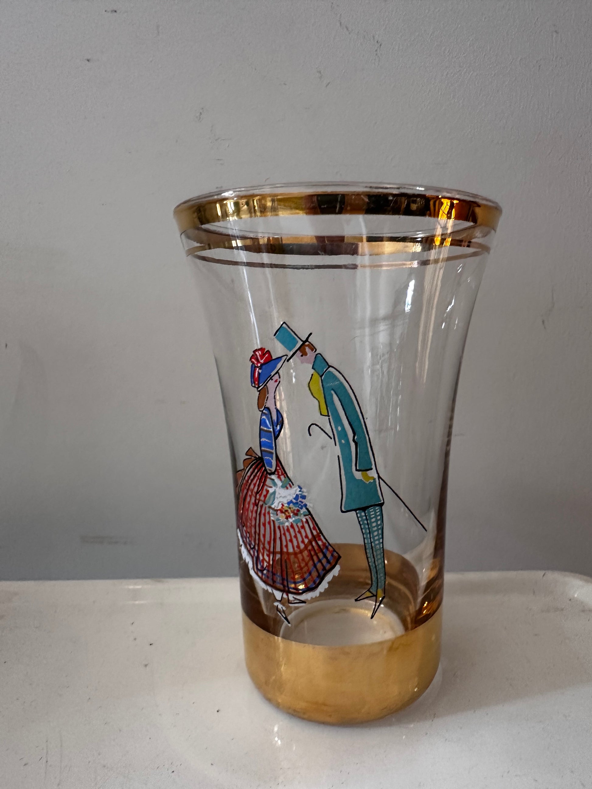 Supergave set van 6 tumbler glazen afkomstig uit Amerika. Glazen dateren jaren 50/60 en hebben een Hollywood regency stijl. Op elk glas is een ander tafereeltje beschilderd.