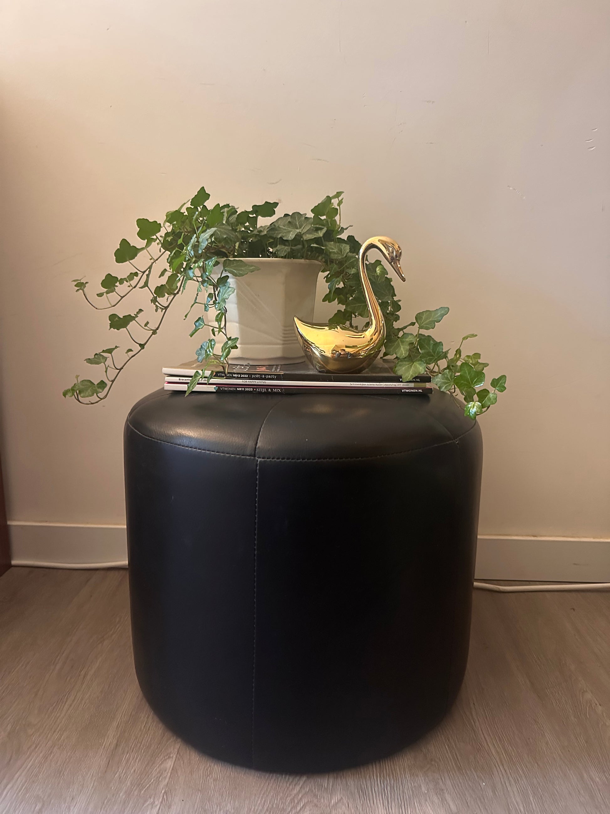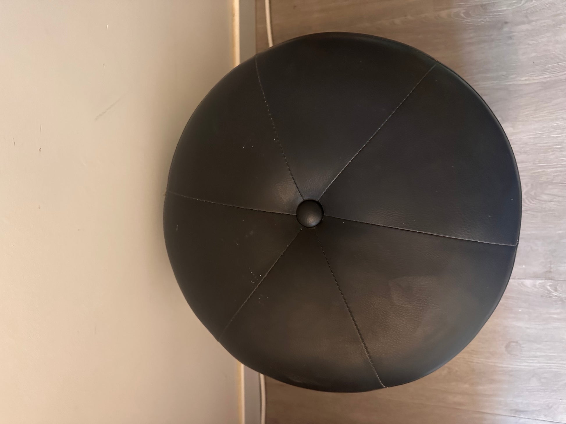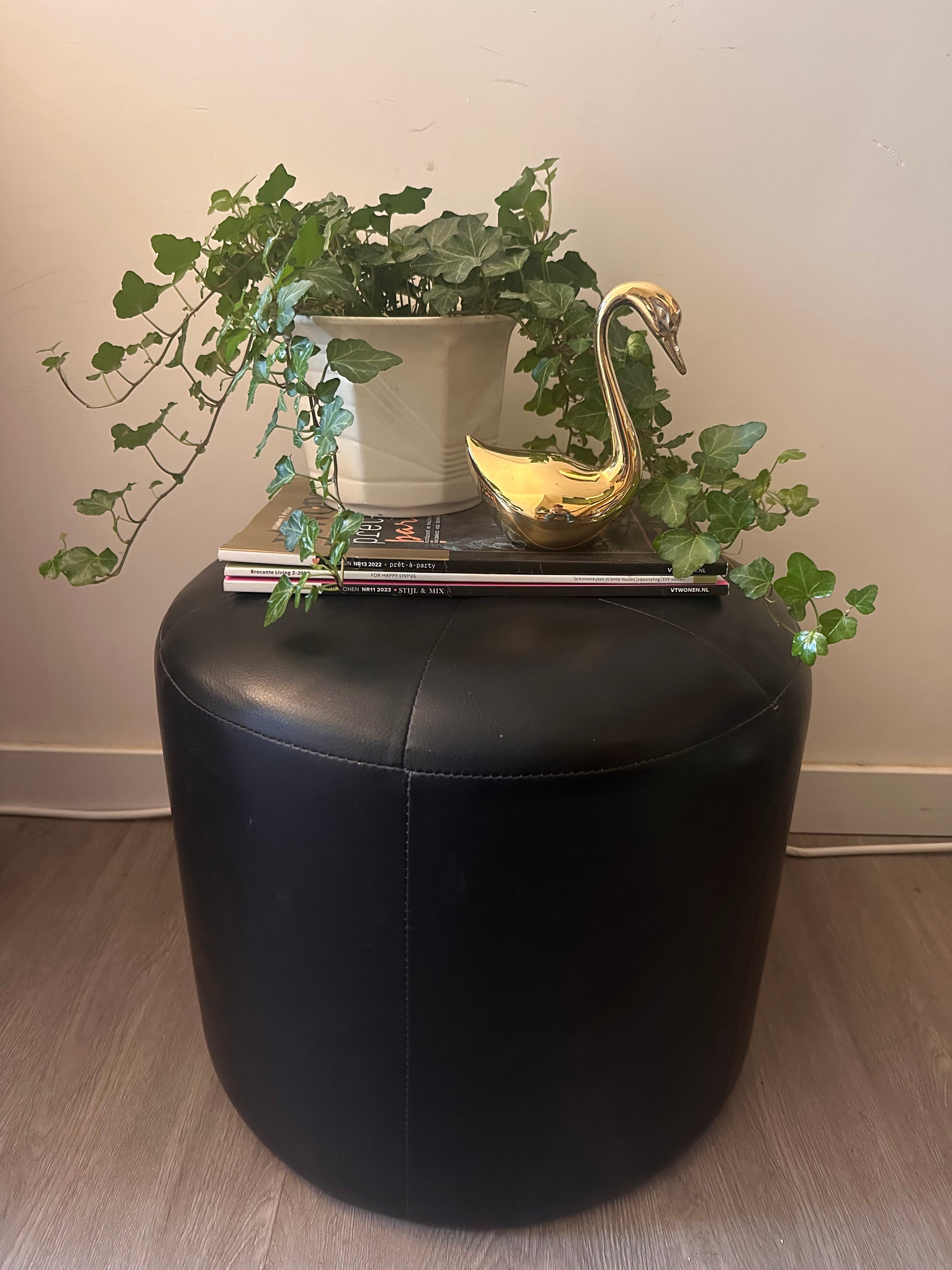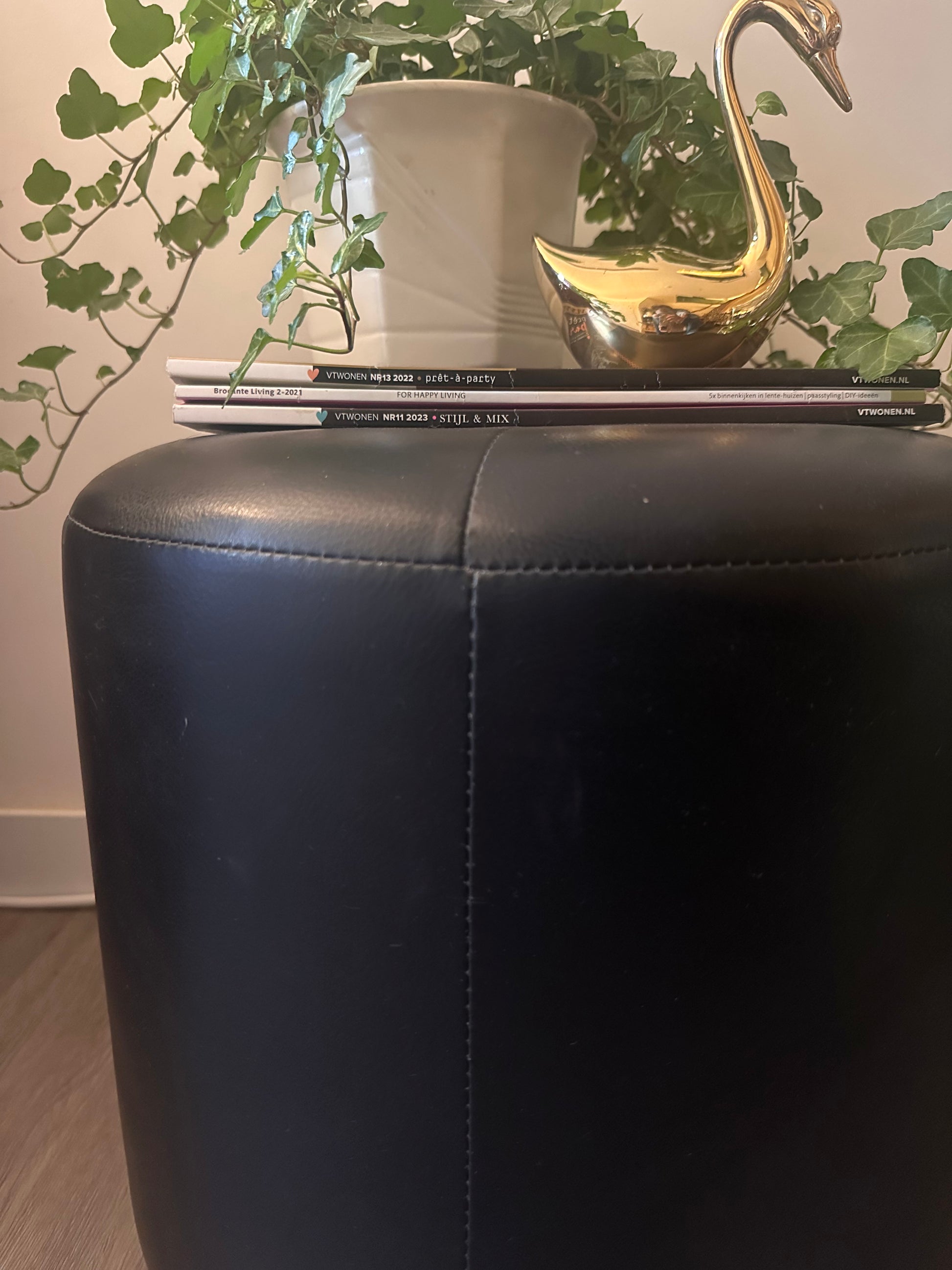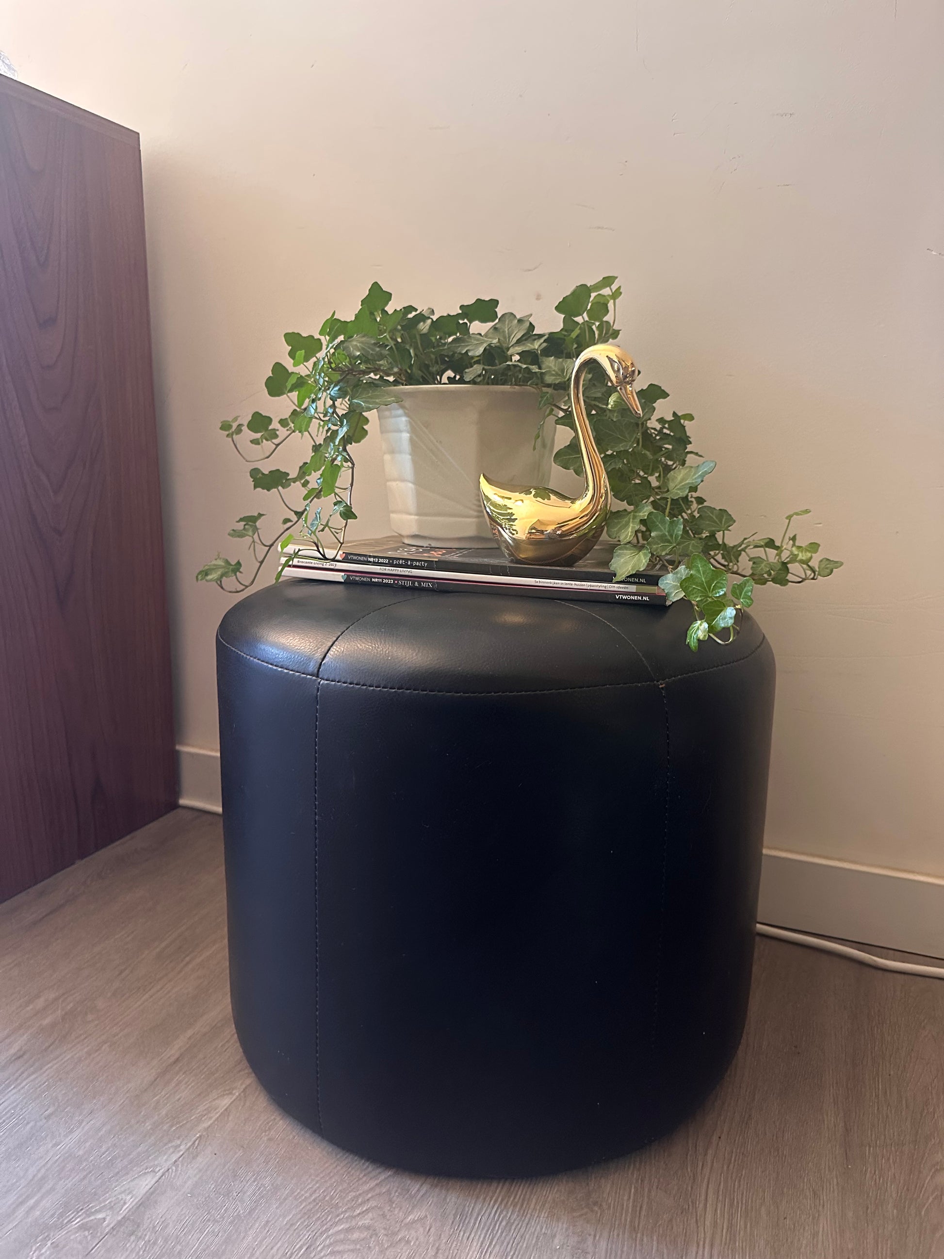 Strakke ronde poef bekleed met zwart skai-leer โ lichtgewicht en daardoor makkelijk te verplaatsen. Leuk als extra zitplek, bijzettafeltje of gewoon als stylingobject met een plant of stapel tijdschriften erop.