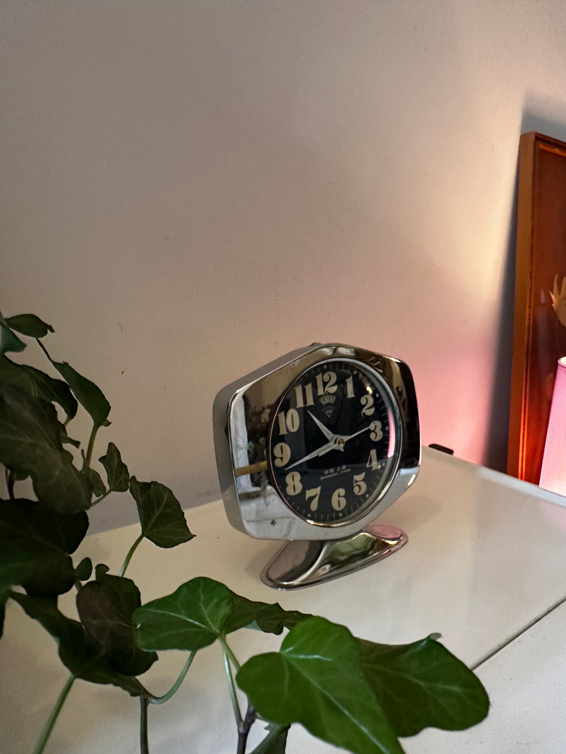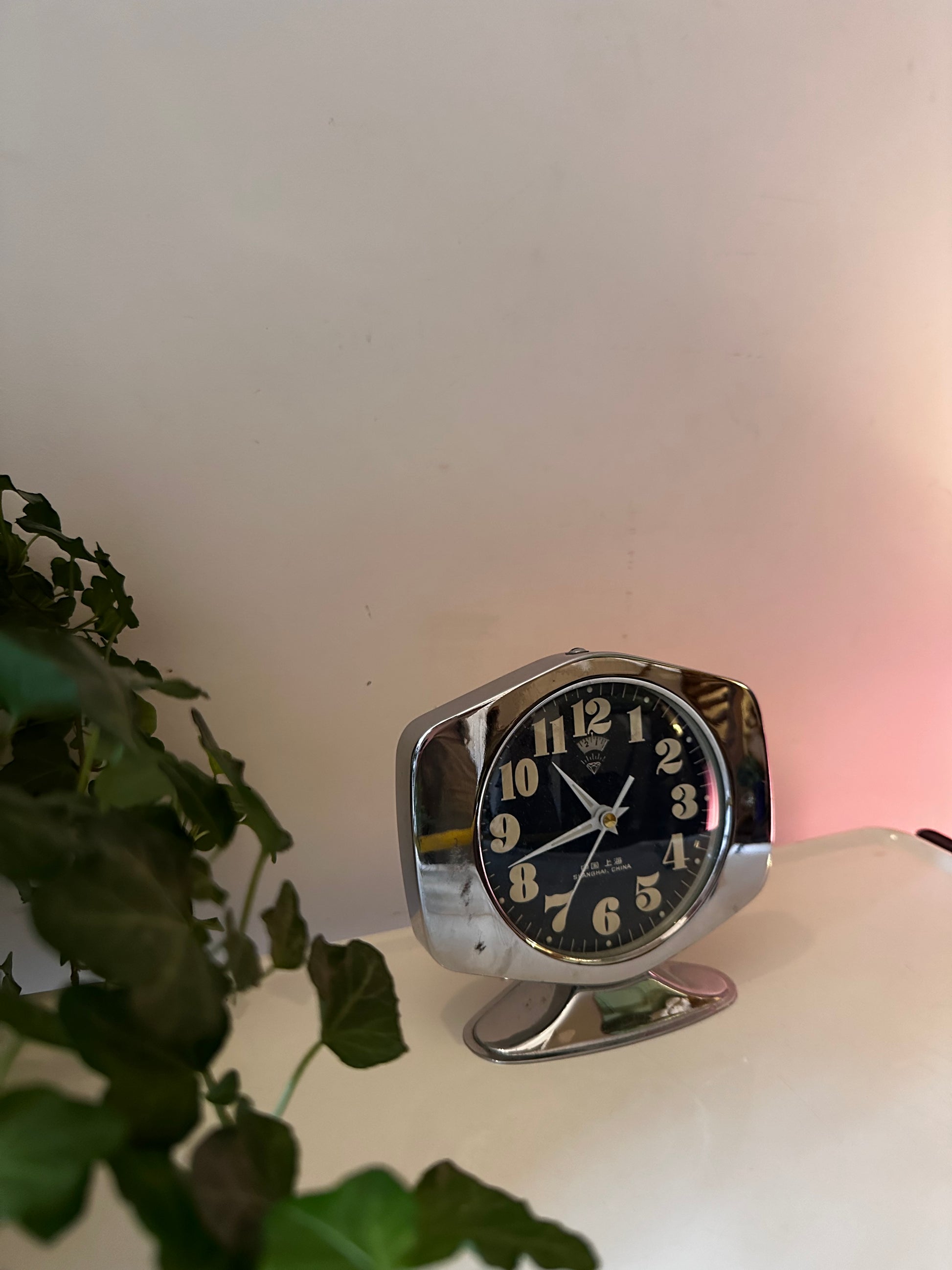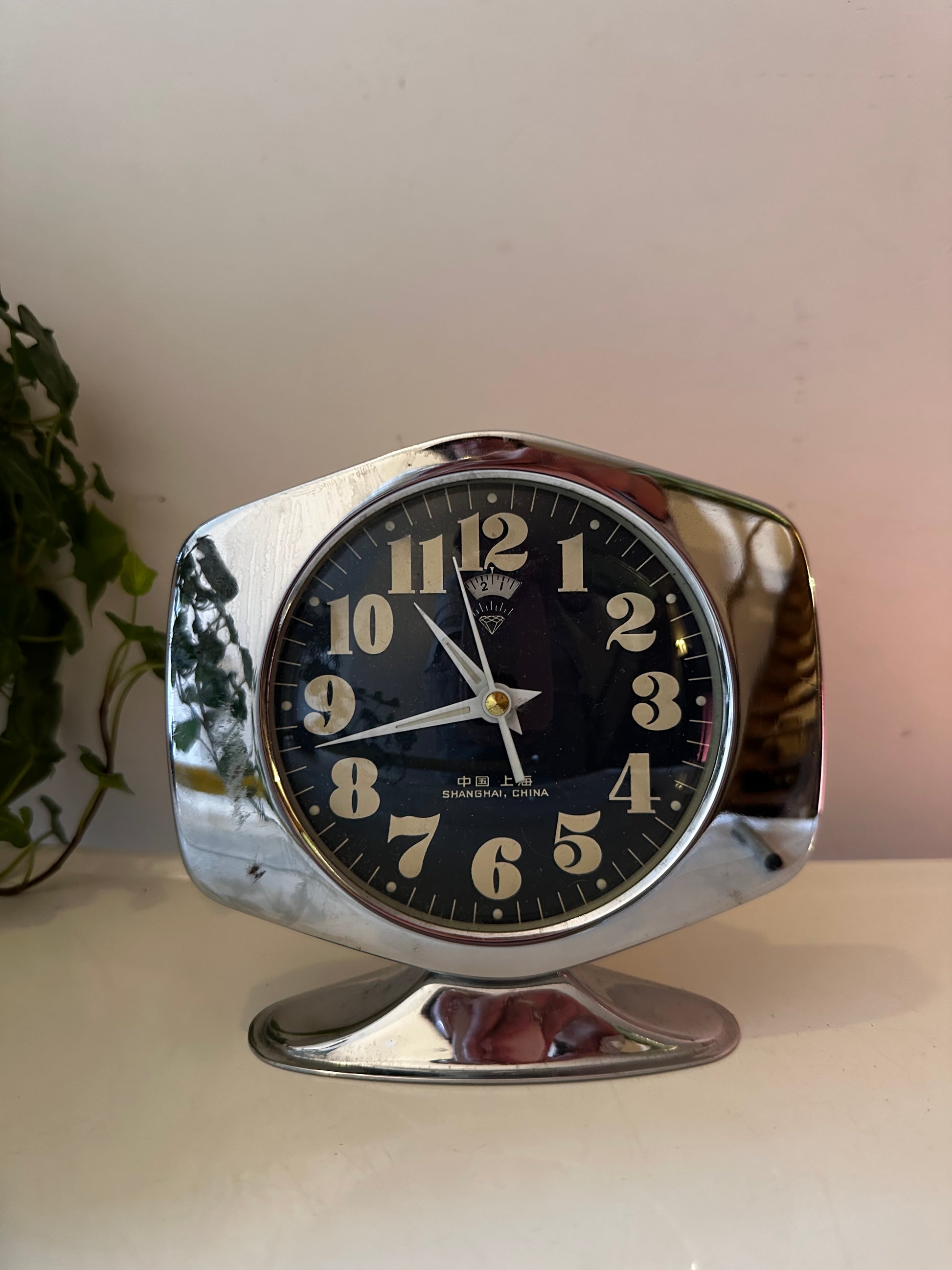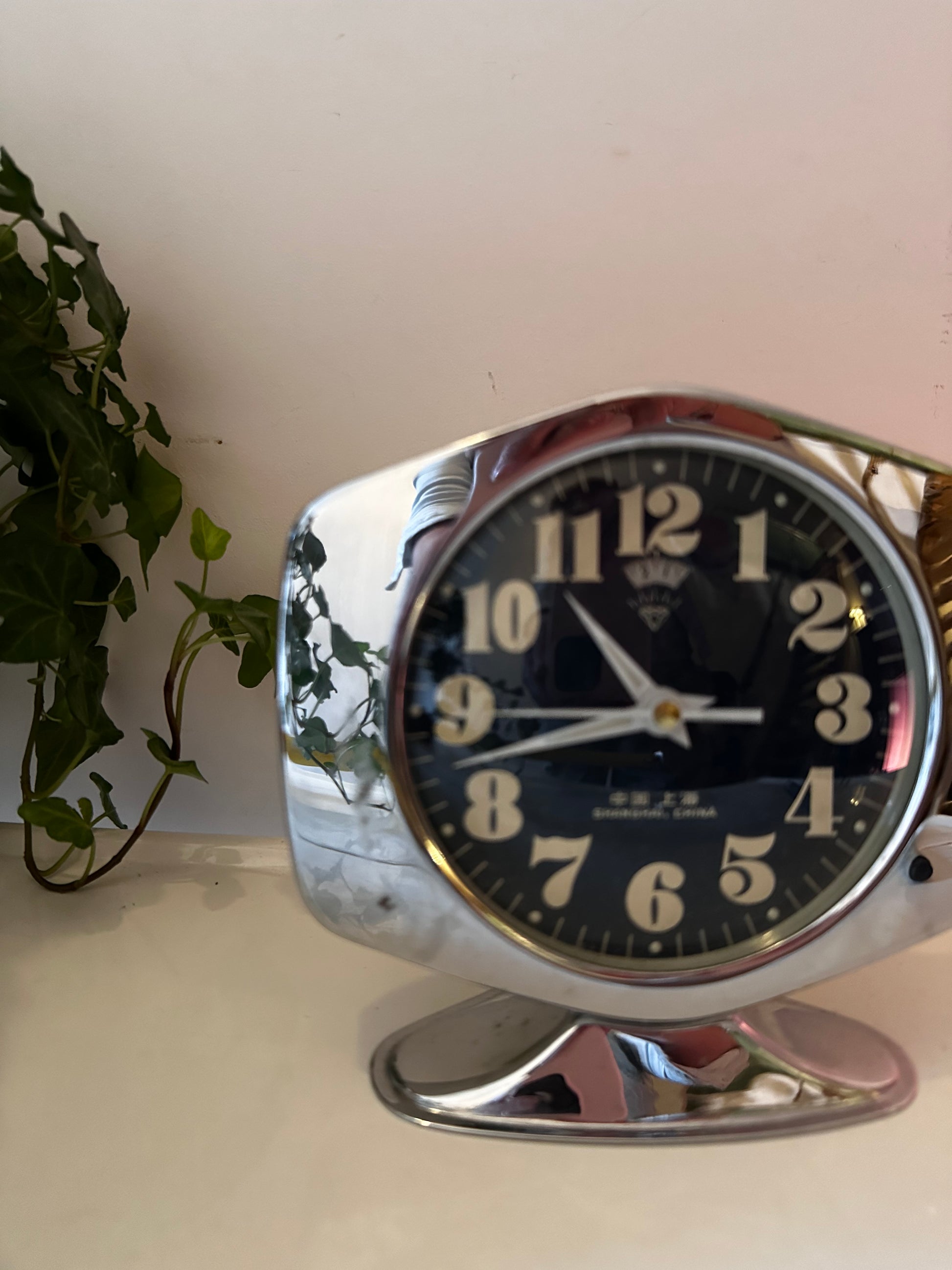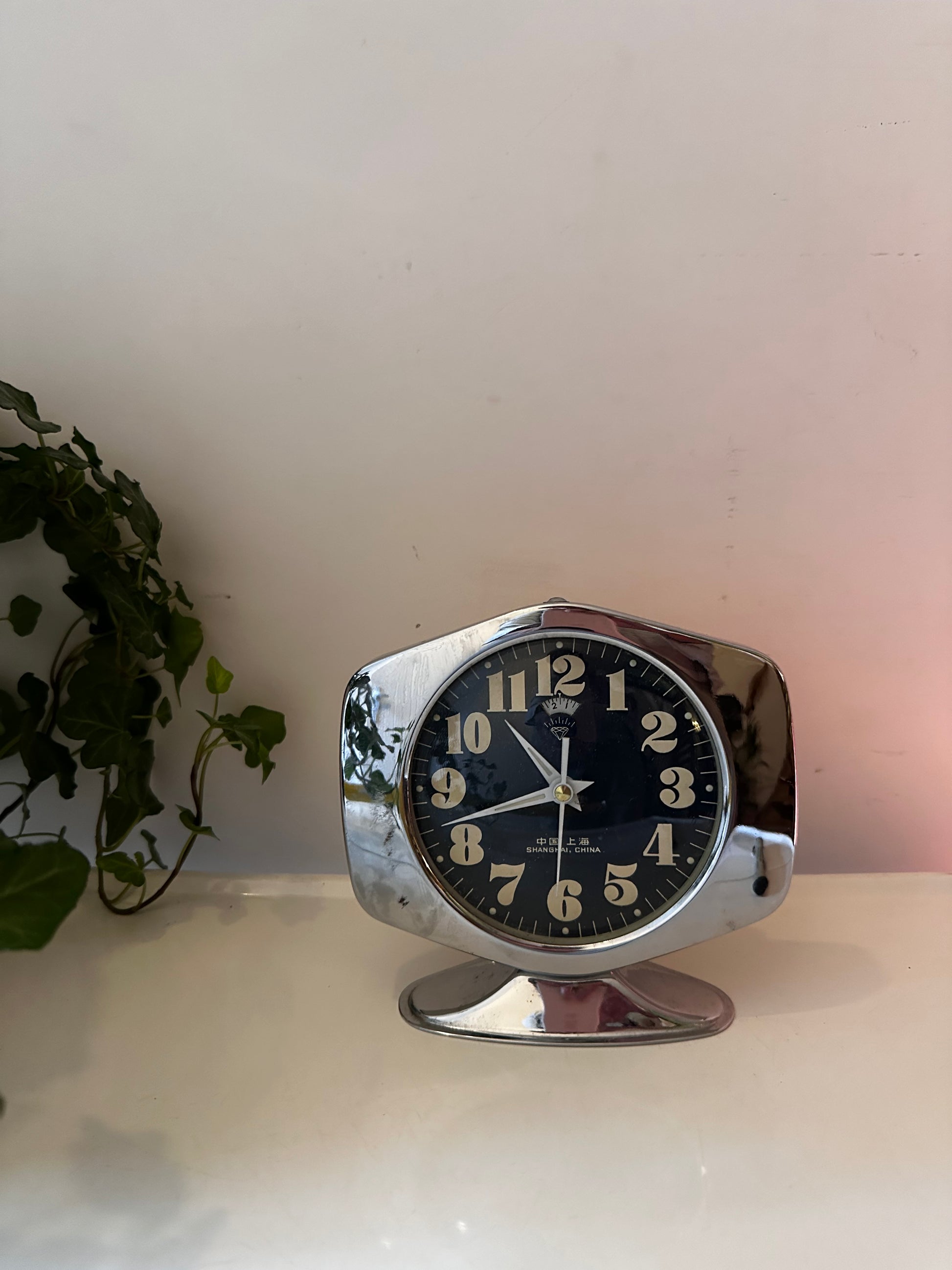 Vintage jaren 60 tafelklok met die kenmerkende space age uitstraling. Chroomglanzend frame, zwarte wijzerplaat met grote cijfers en gemaakt door Shanghai Diamond Clock.