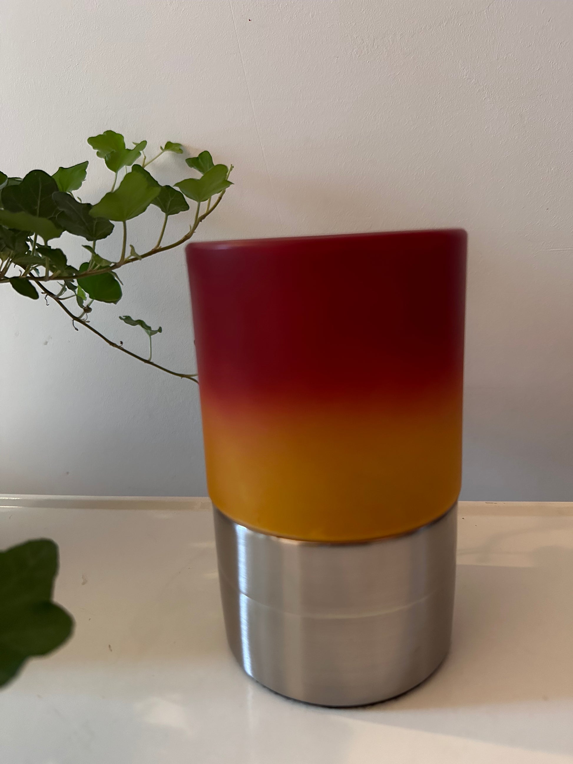 Een te gek space age lampje. In een supermooie vintage staat. Lampje gaat aan door aanraking aan het chroom gedeelte en heeft die standen. De kap is van glas met een rood oranje kleur. Onderkant is metaal.