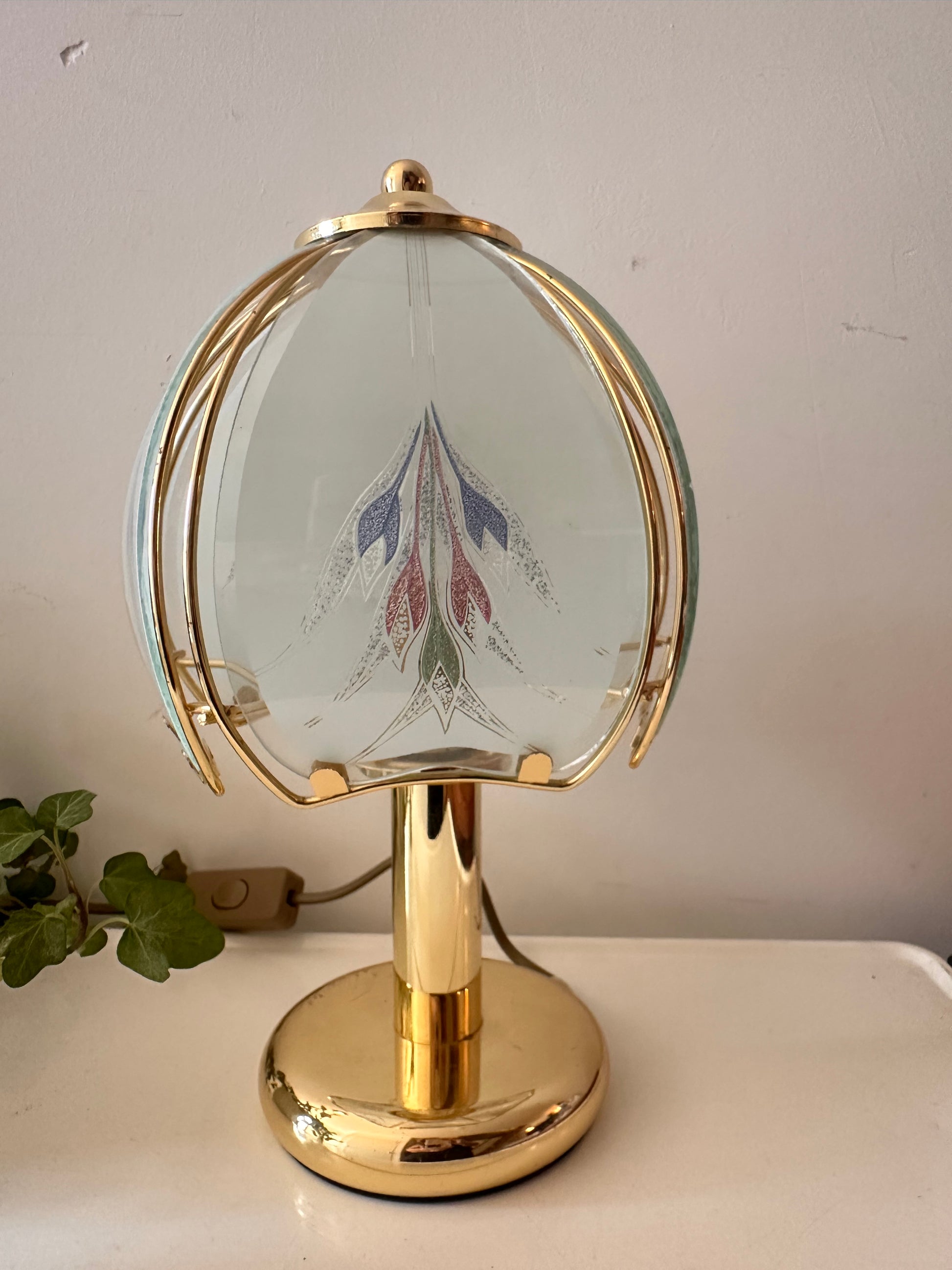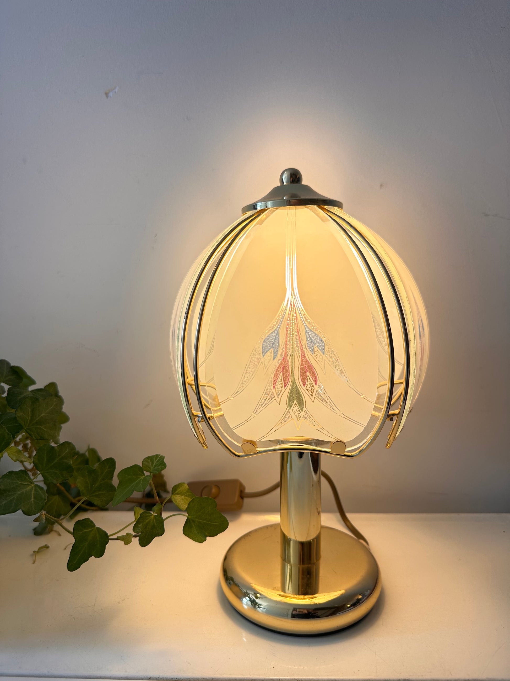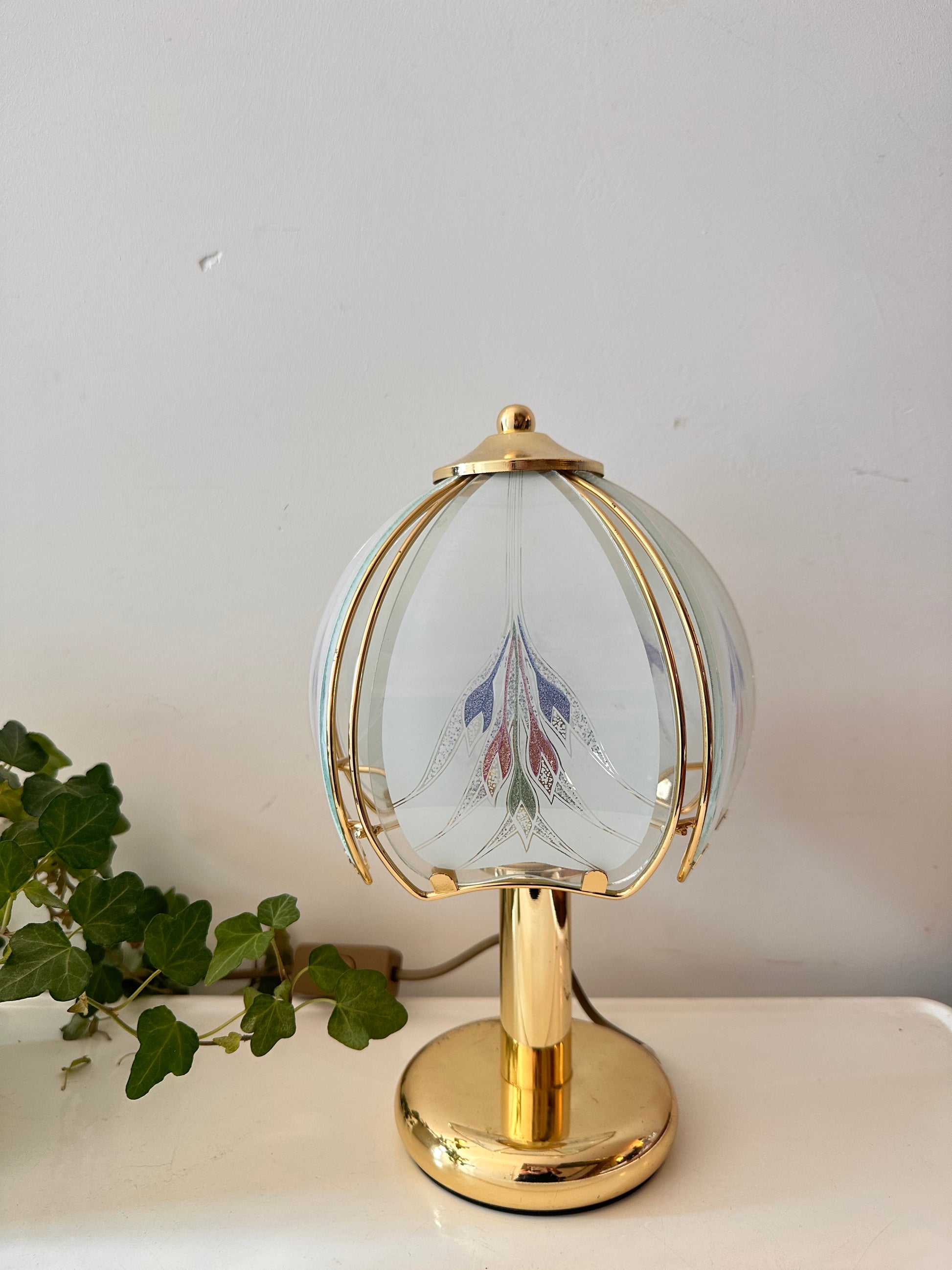 Hoe leuk is dit glazen bolvormige lampje met die sierlijke jaren 80 print? De kap bestaat uit gebogen glas met pastel-achtig decor in blauw, roze en groen, omlijst met goudkleurige metalen ribben. De voet is van metaal met een glanzende messing look. In een mooie vintage staat met wat patina aan de voet. Q217