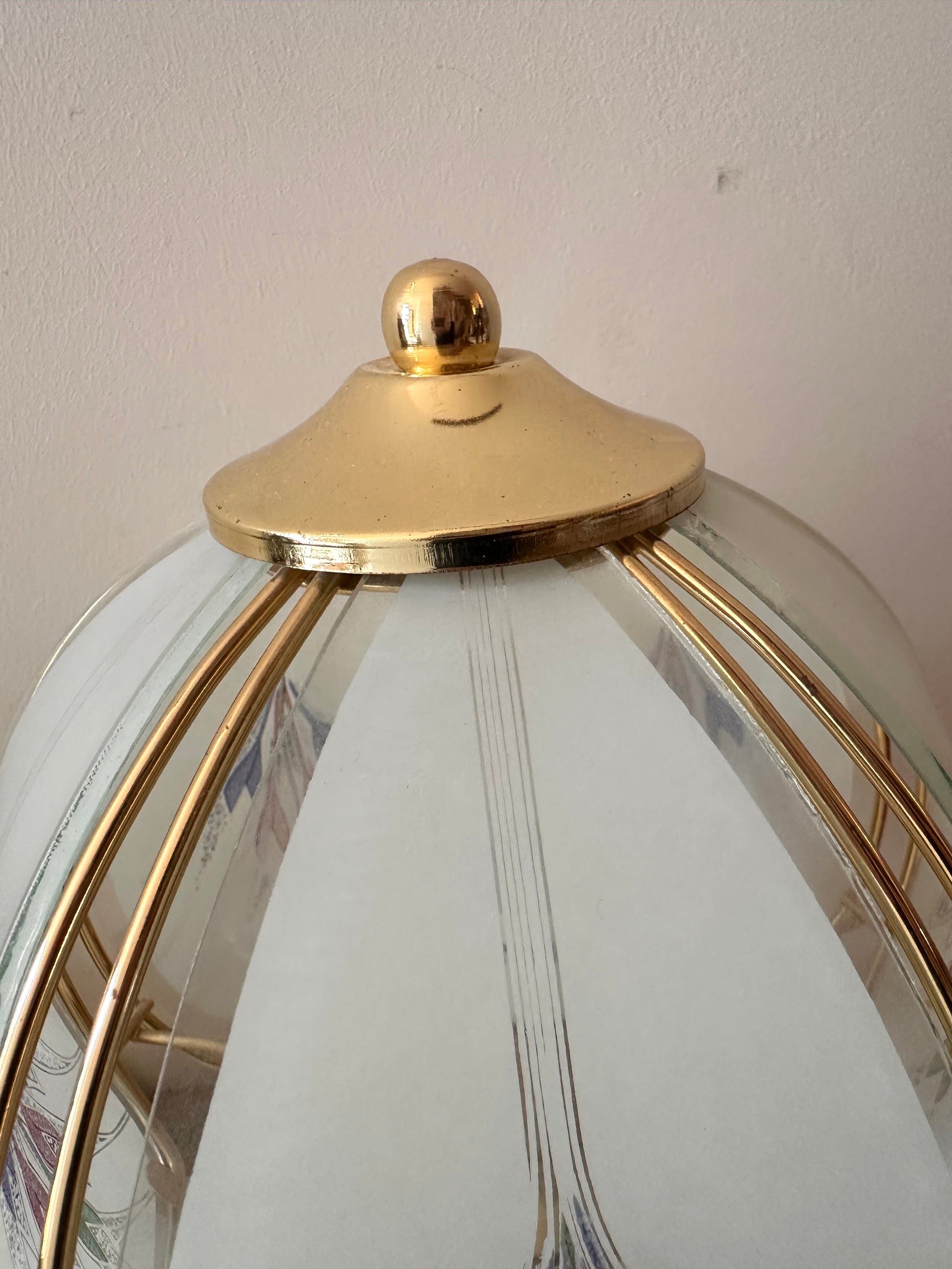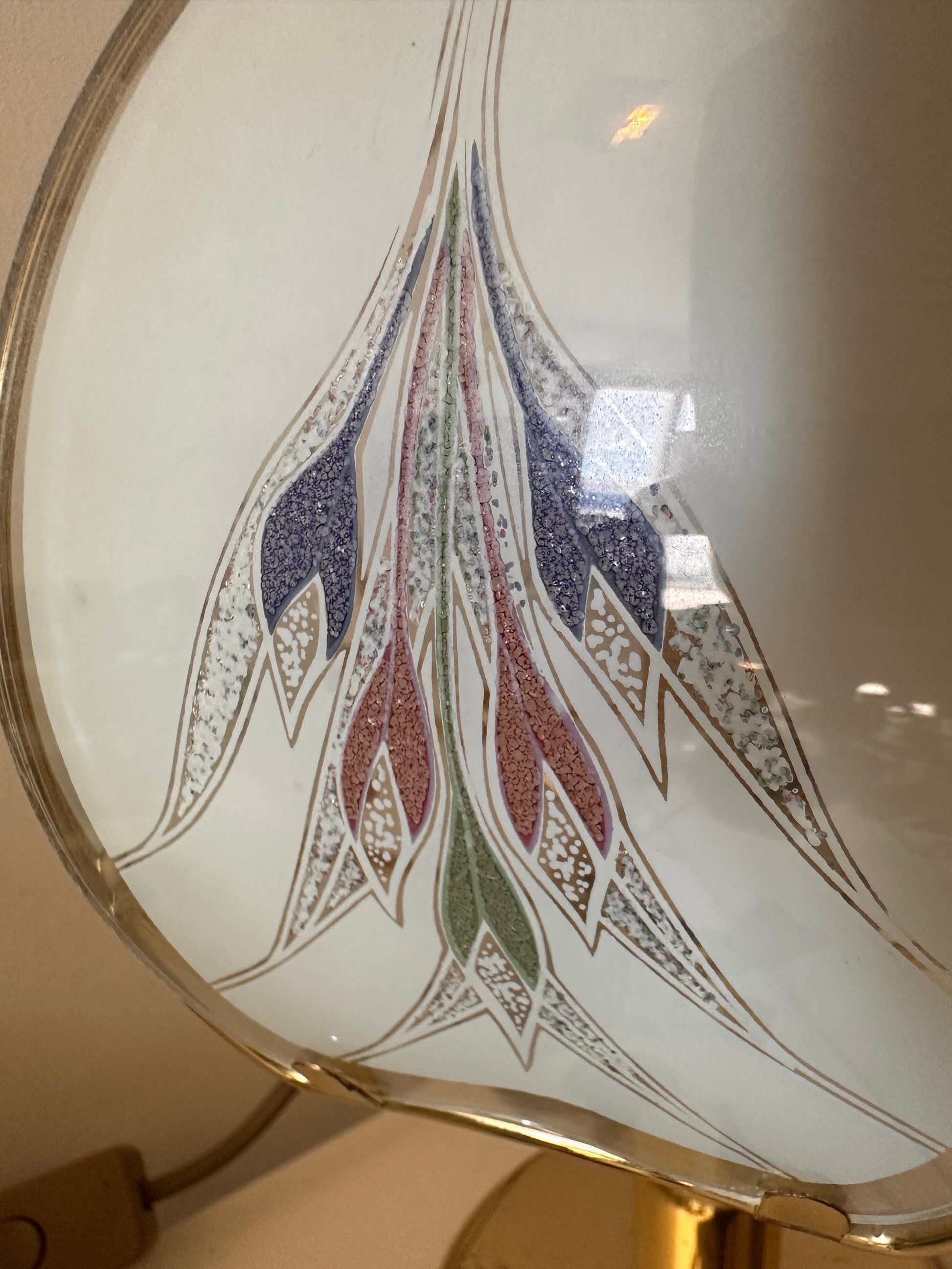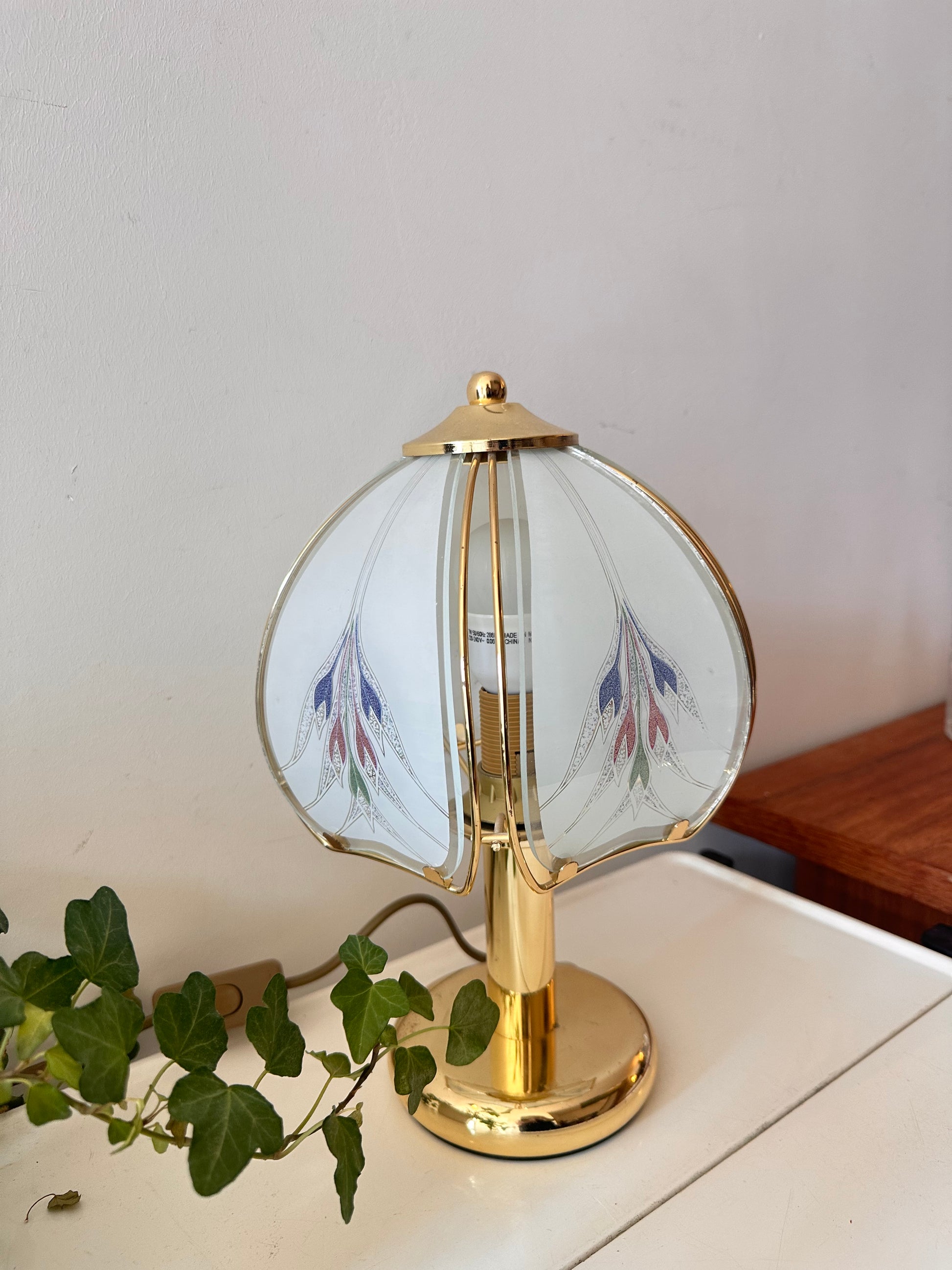 Hoe leuk is dit glazen bolvormige lampje met die sierlijke jaren 80 print? De kap bestaat uit gebogen glas met pastel-achtig decor in blauw, roze en groen, omlijst met goudkleurige metalen ribben. De voet is van metaal met een glanzende messing look. In een mooie vintage staat met wat patina aan de voet. Q217
