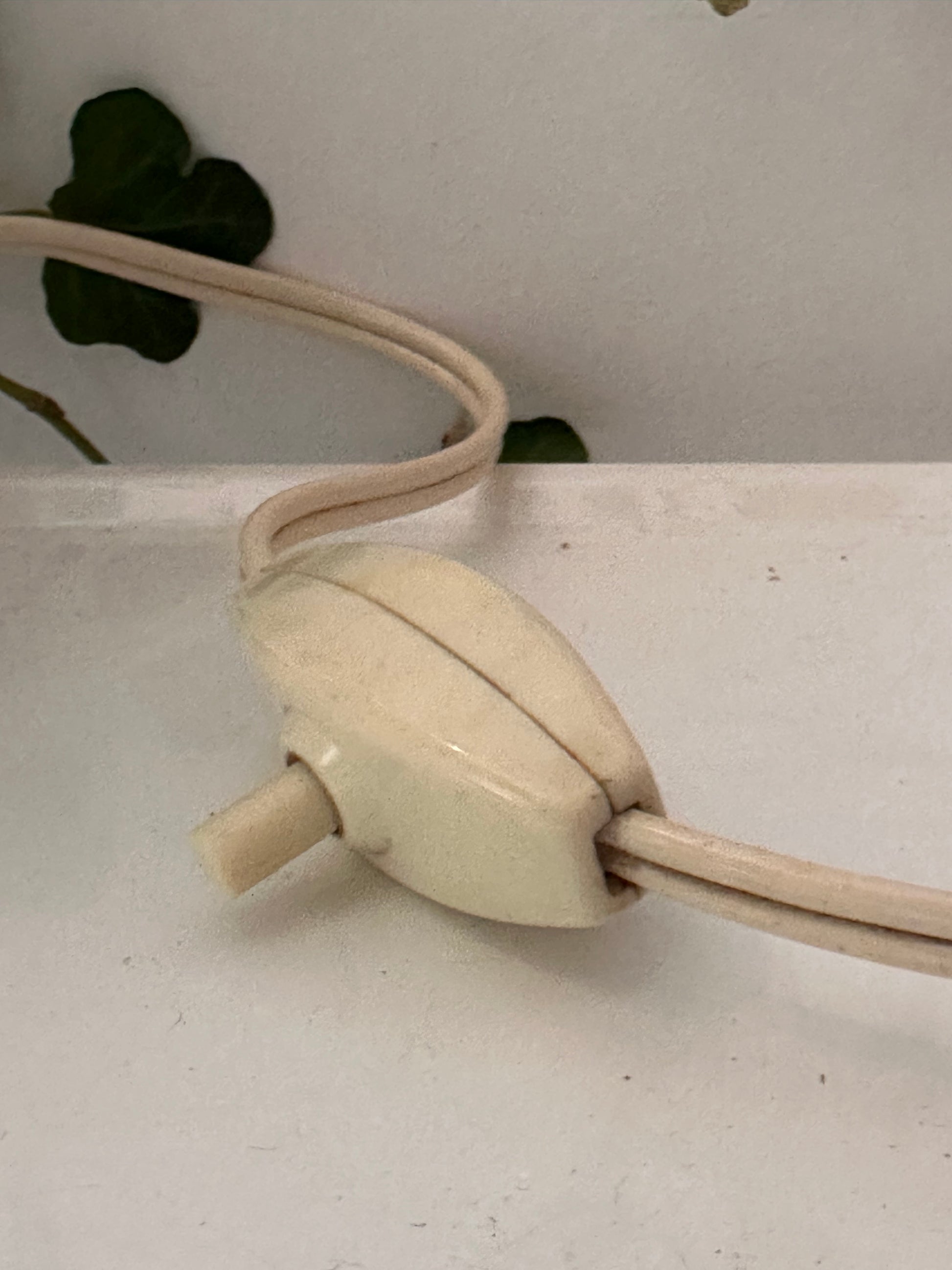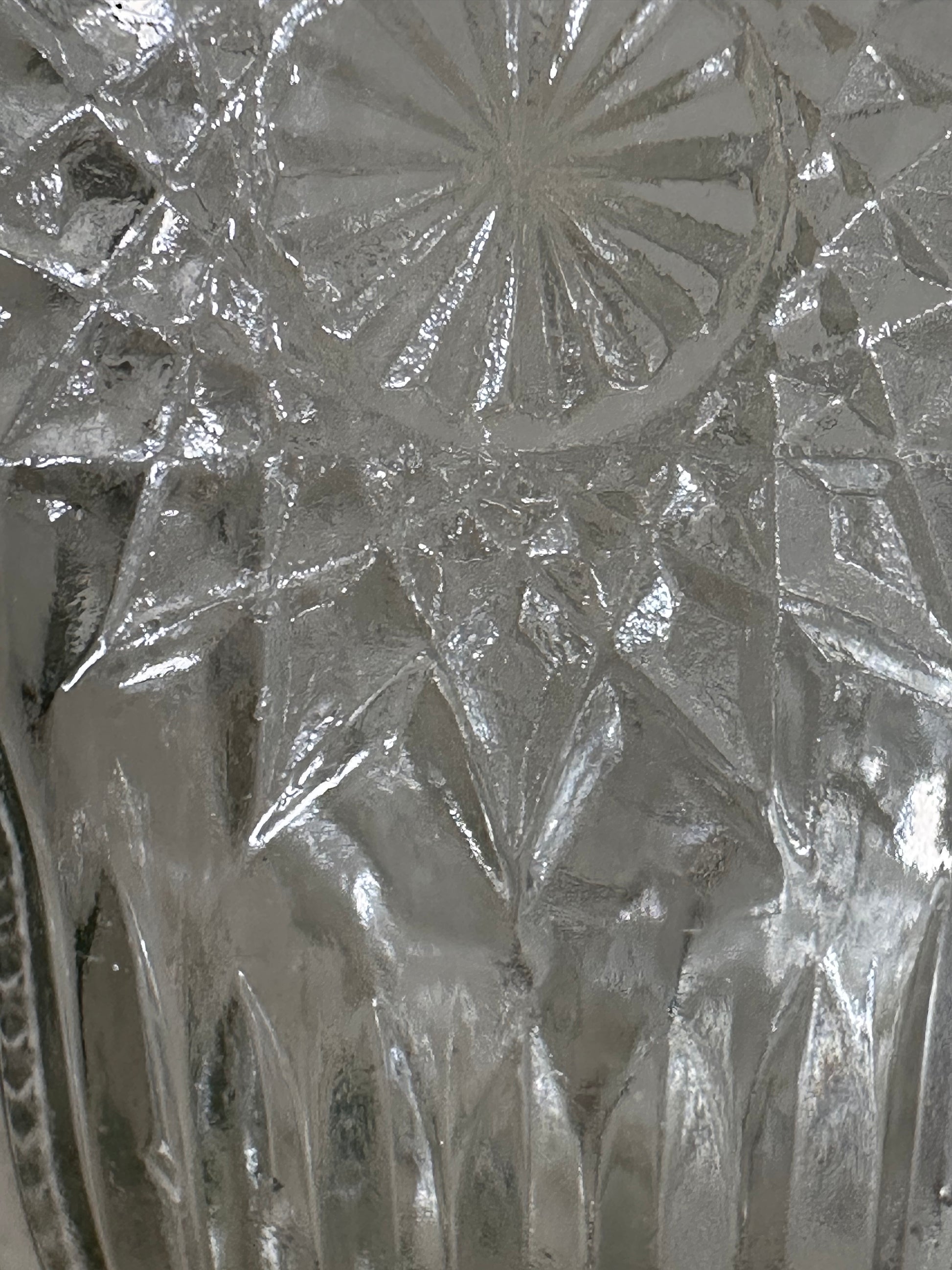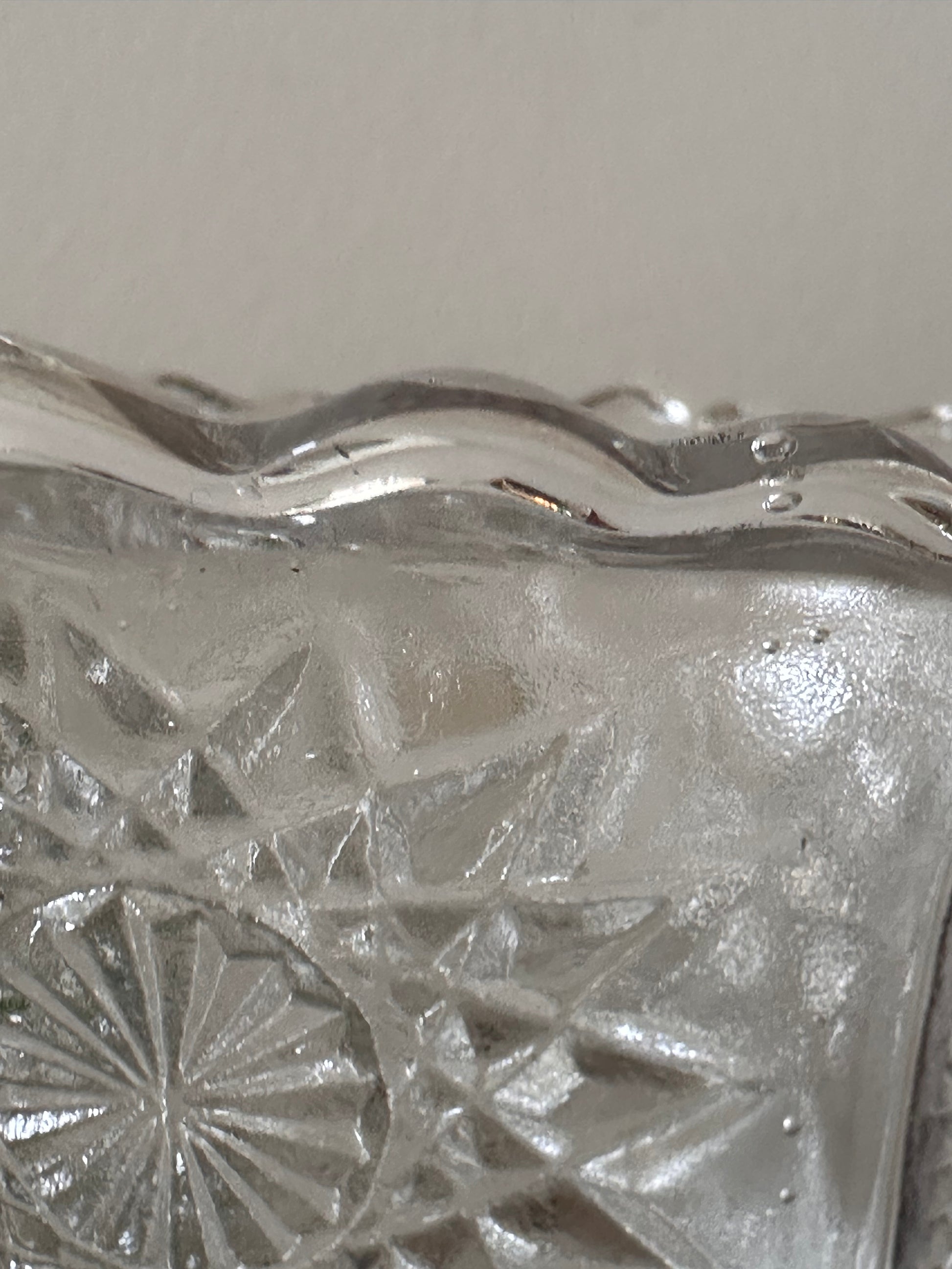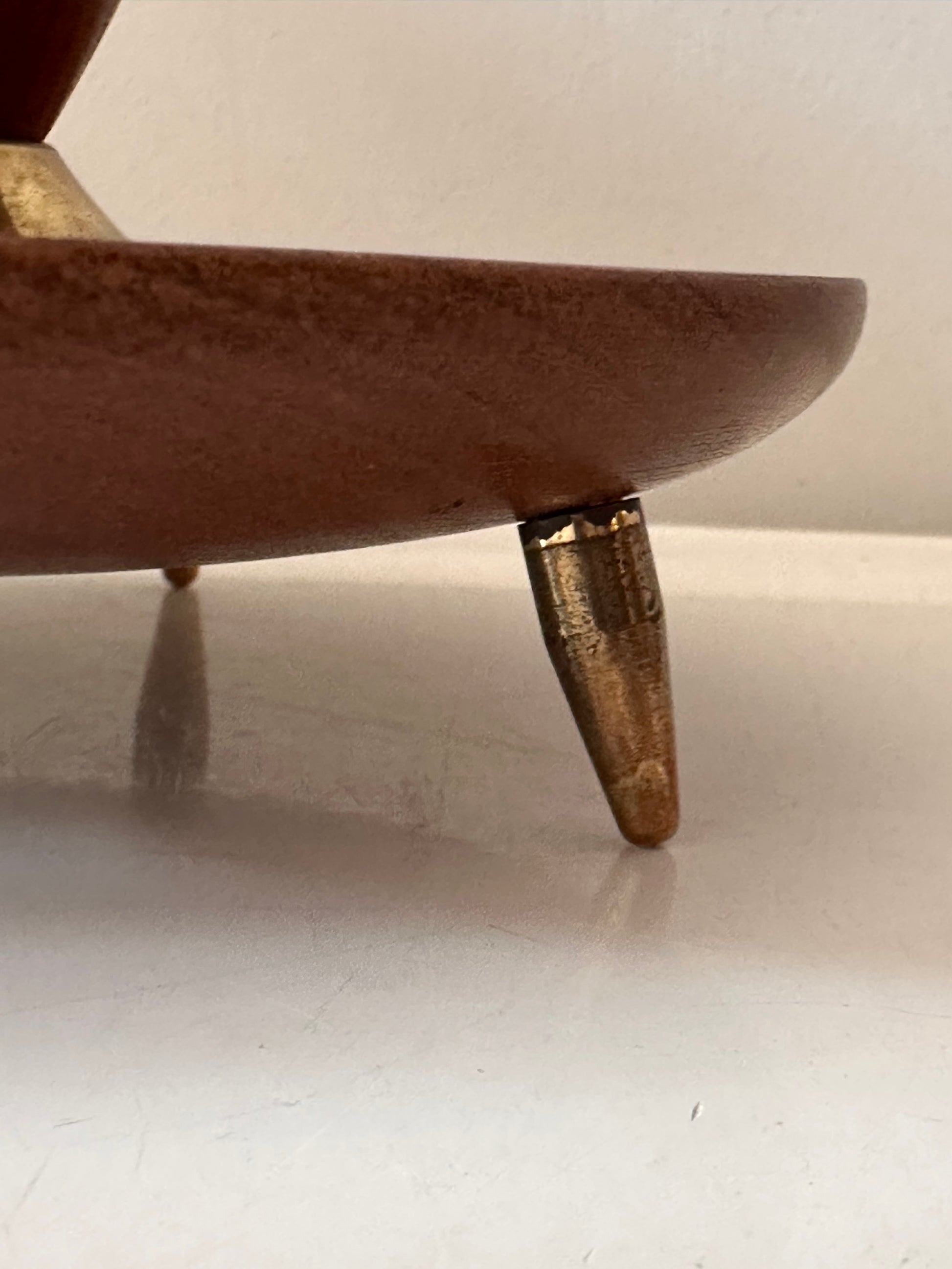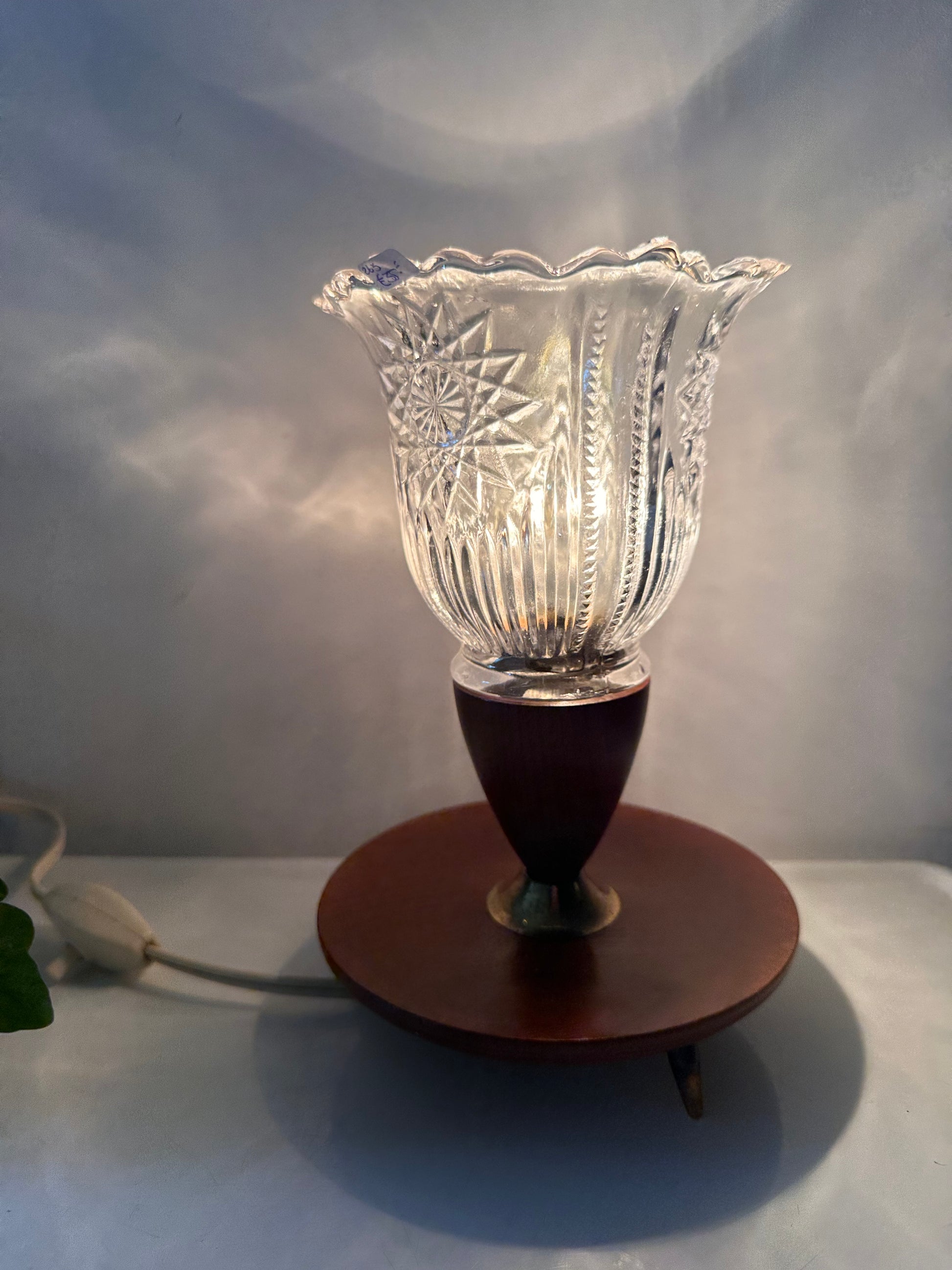 Zo’n sfeermaker zie je niet vaak! Deze kleine tafellamp heeft een geslepen glazen kap met sterpatroon, een houten kelkvormige hals en staat op een rond houten voetje met drie messing pootjes. Geeft een mooi licht. De schakelaar en bedrading zijn ook vintage. Q263