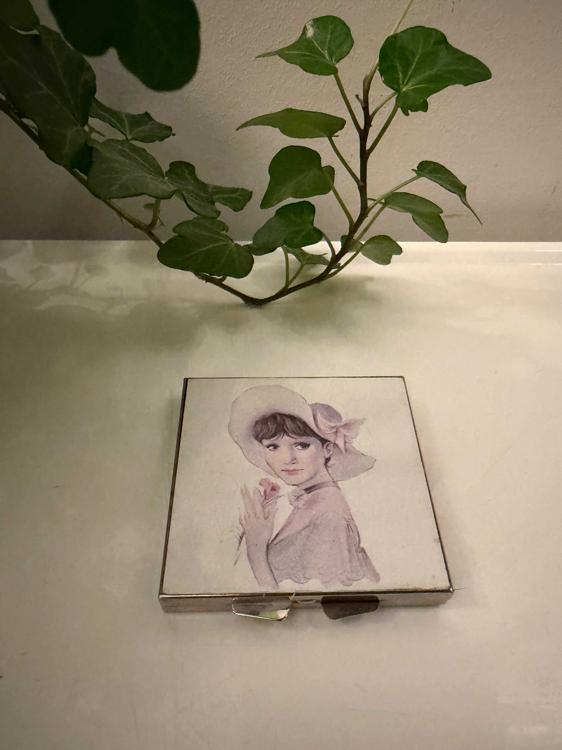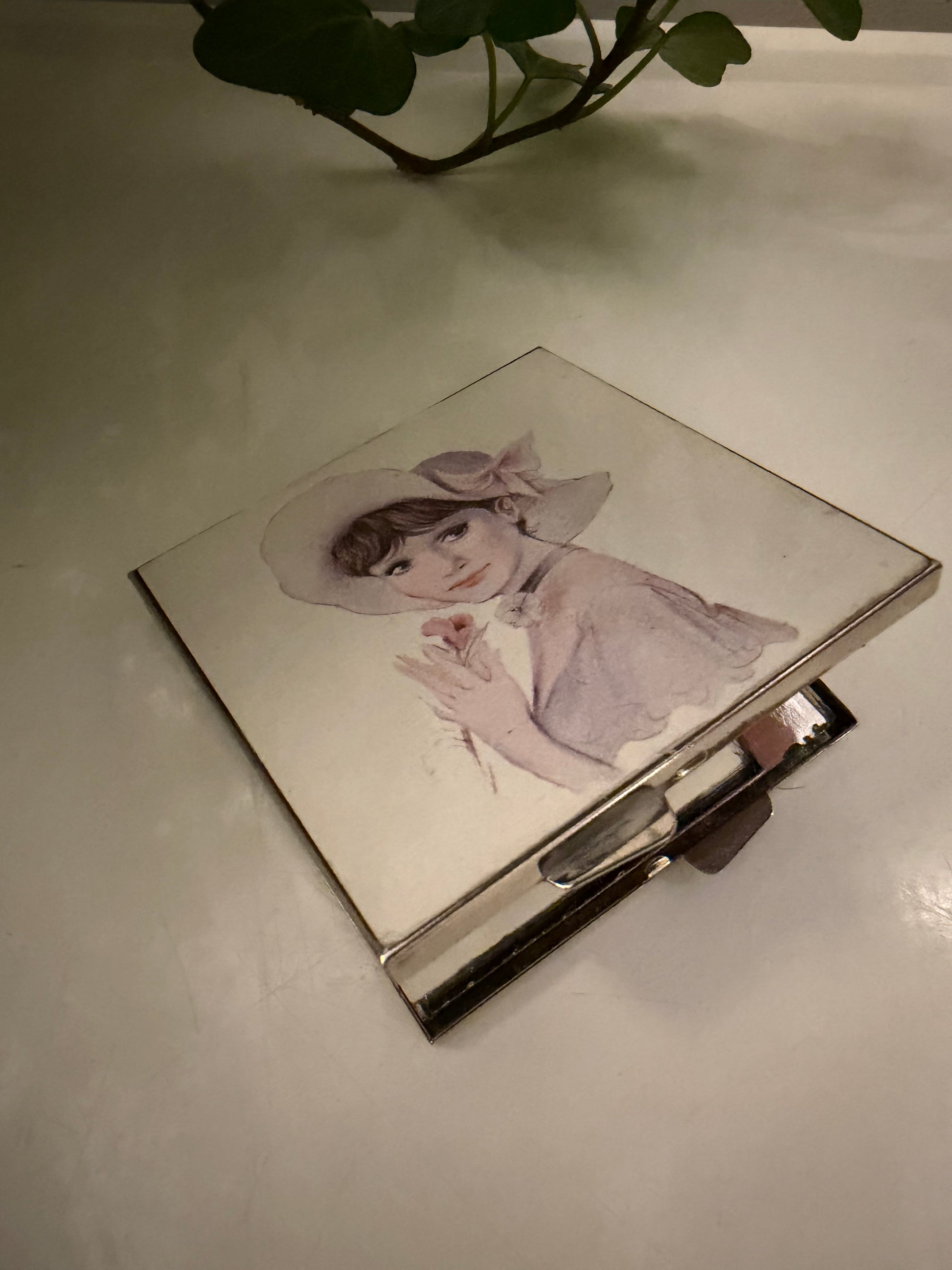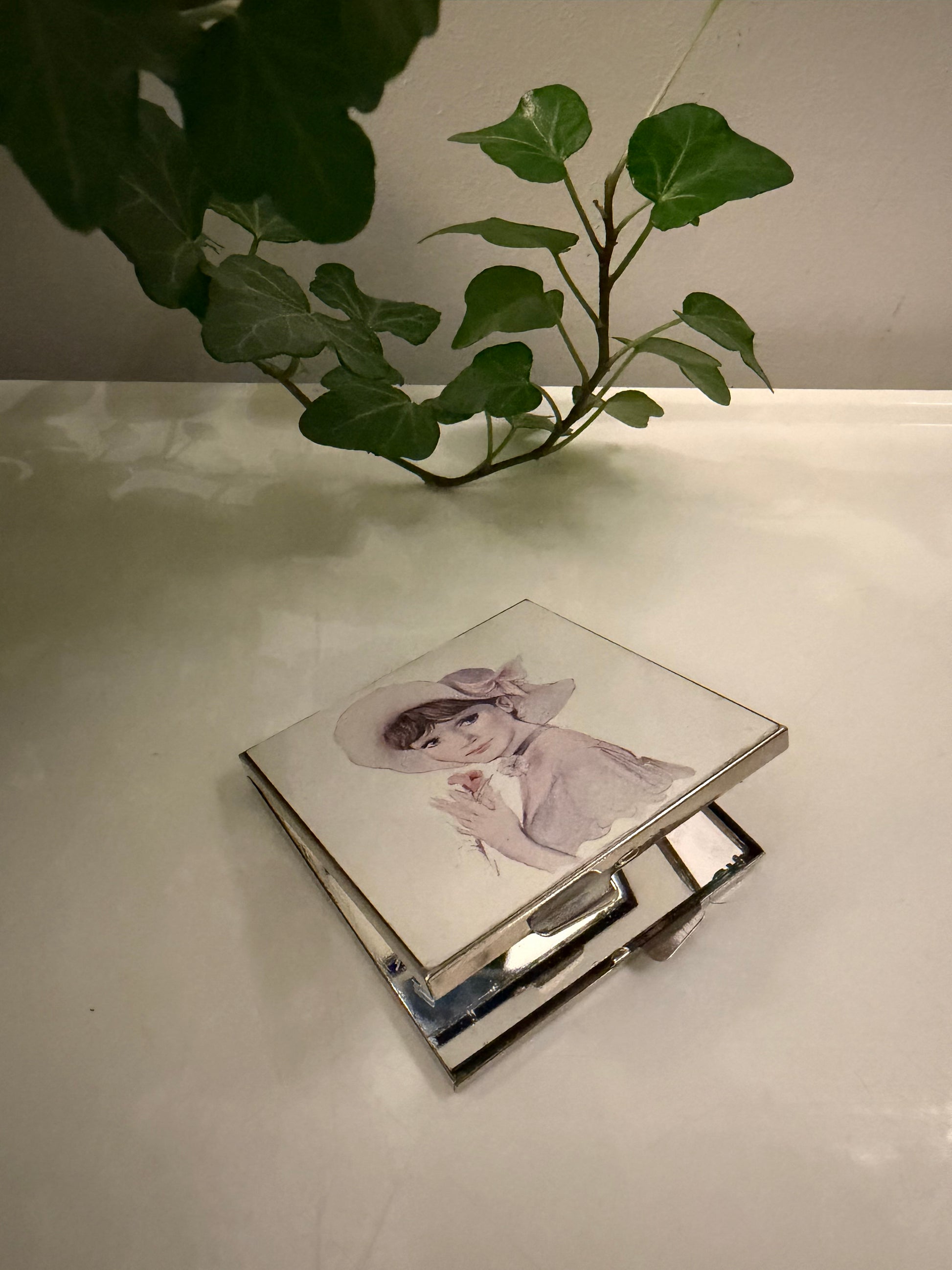 Superleuk compact spiegeltje met een romantisch portret van een vrouw met hoed. Zilverkleurige metalen behuizing en binnenin twee spiegeltjes. Zo’n klein item dat vroeger standaard in een handtas zat. Q965