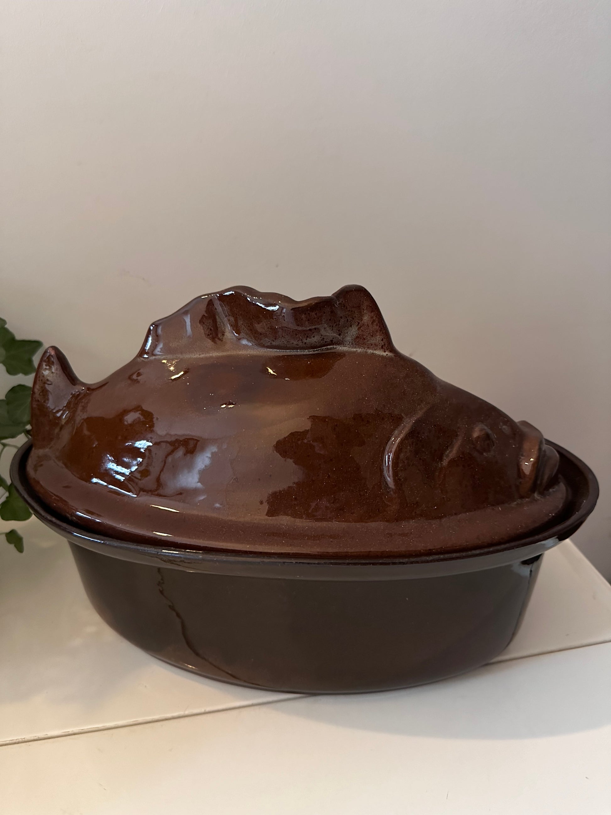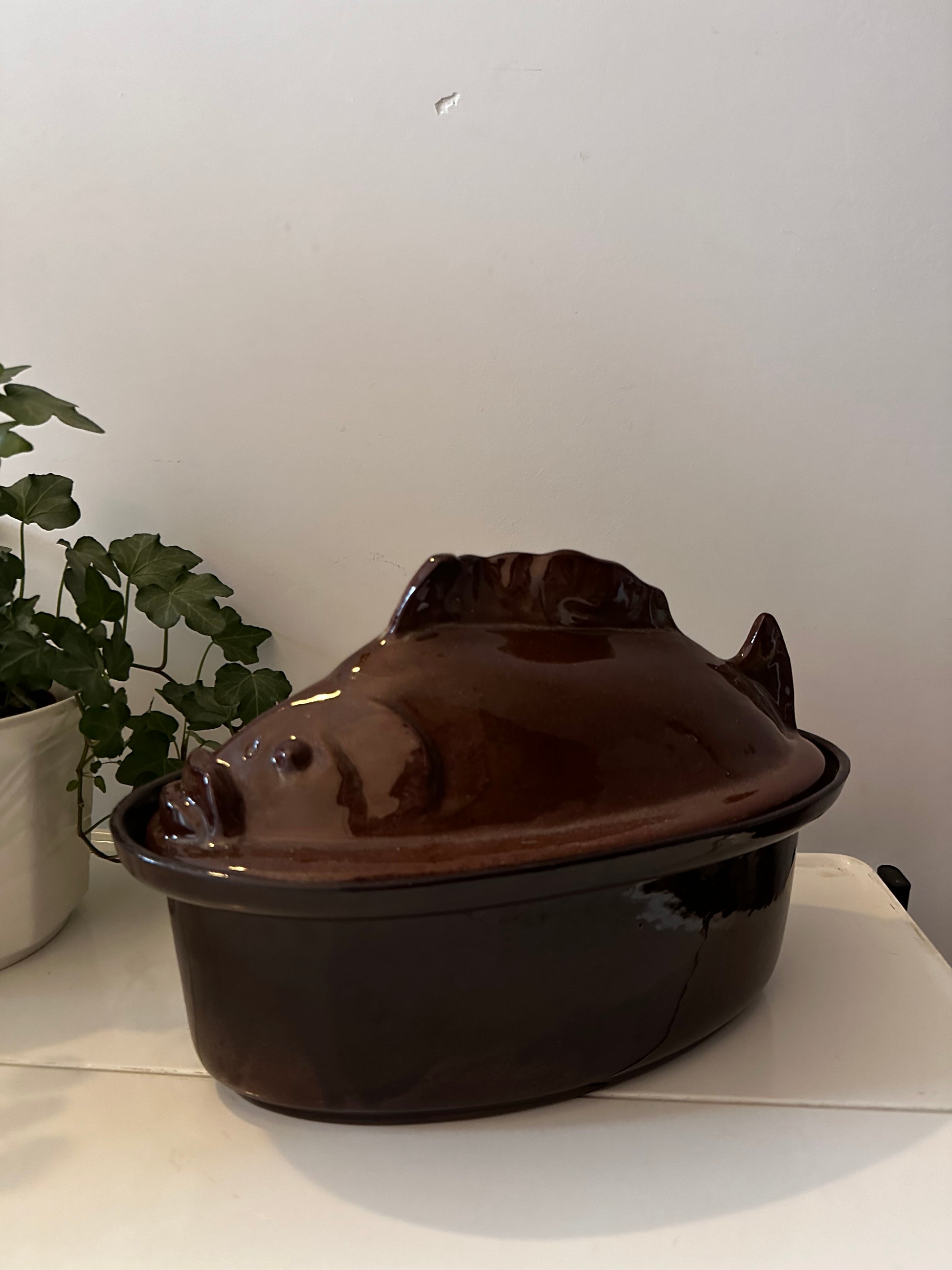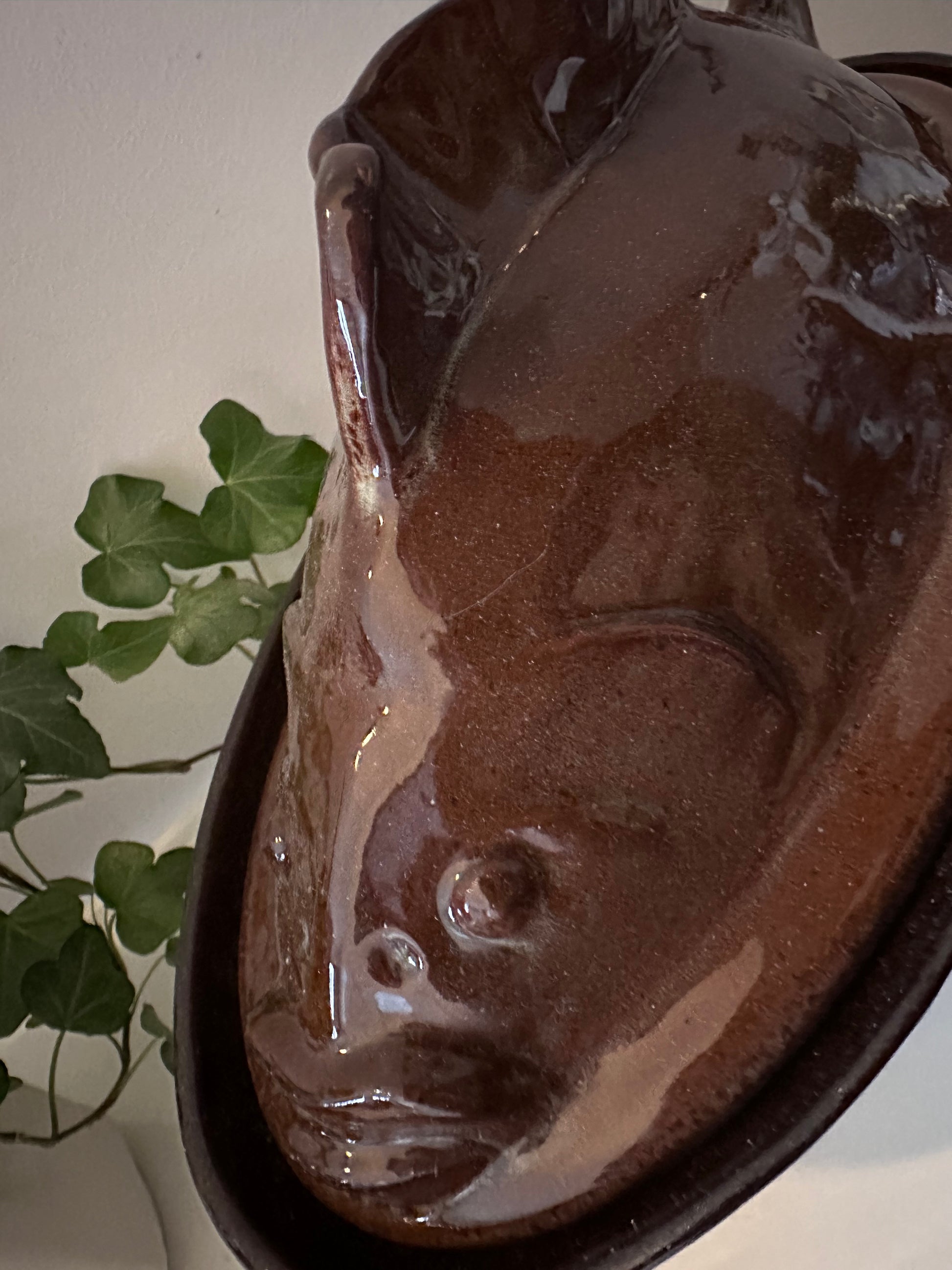 Een fantastisch mooie Terrine. Afkomstig uit Duitsland en dateert jaren 70. In nog een top vintage staat. Keramiek is mooi geglazuurd en heeft een donkerbruine kleur. Op de deksel een afbeelding van een vis.