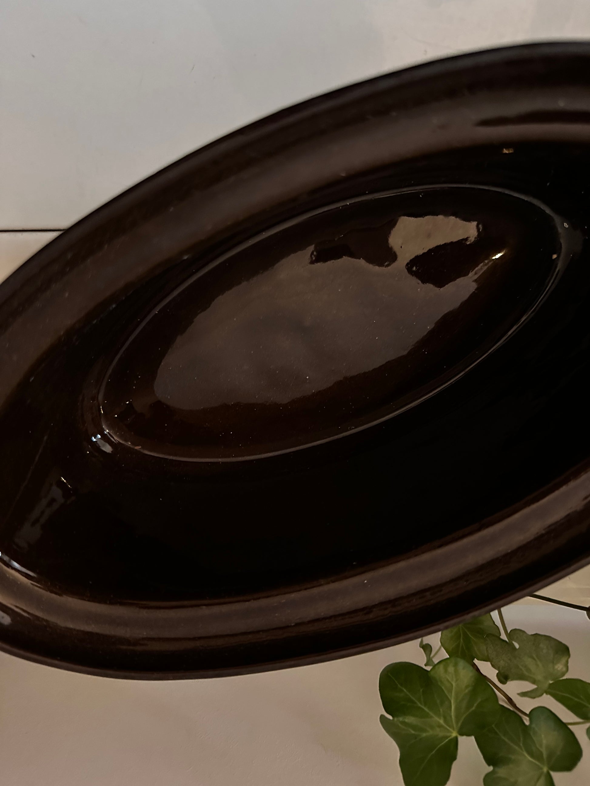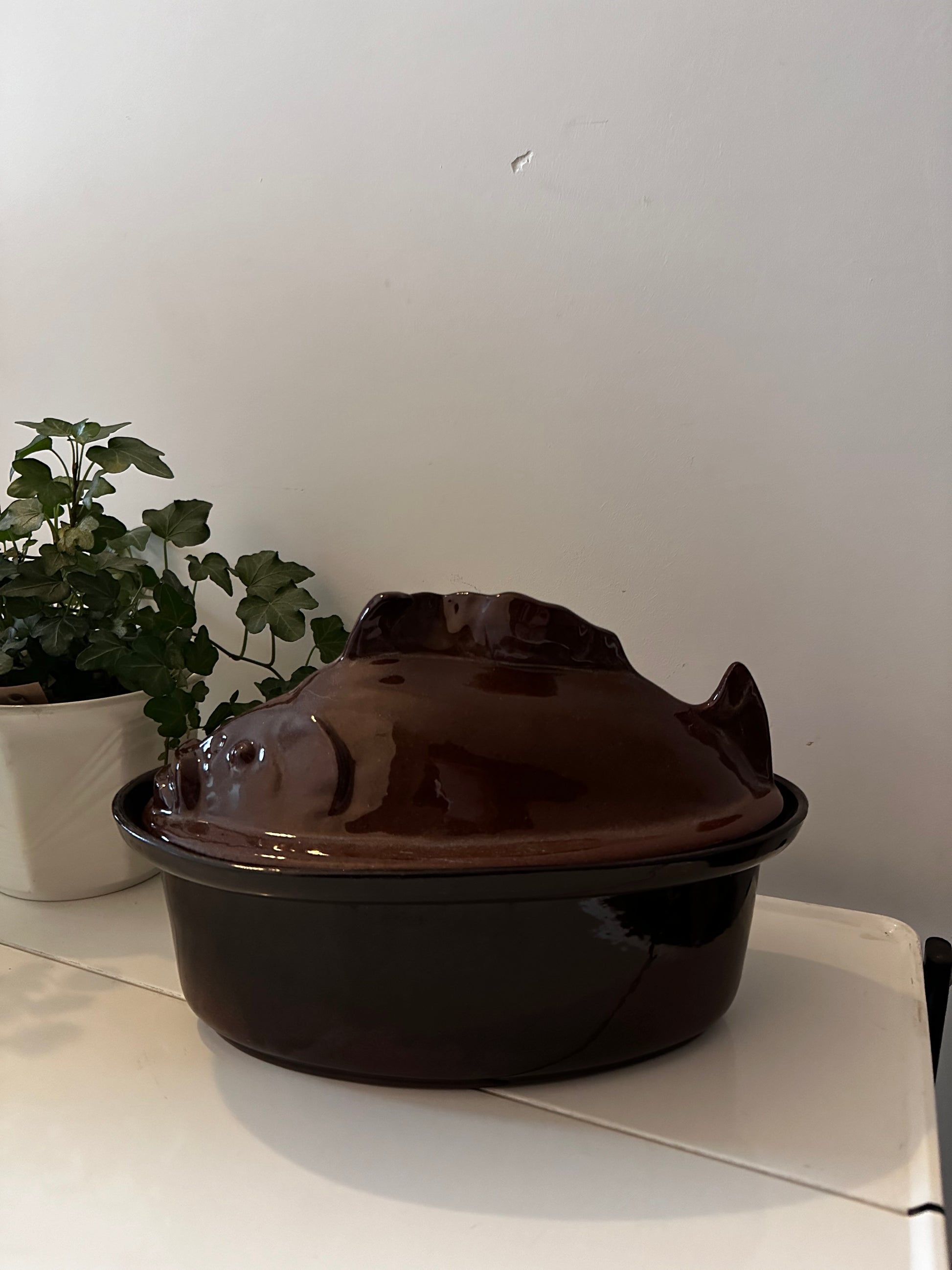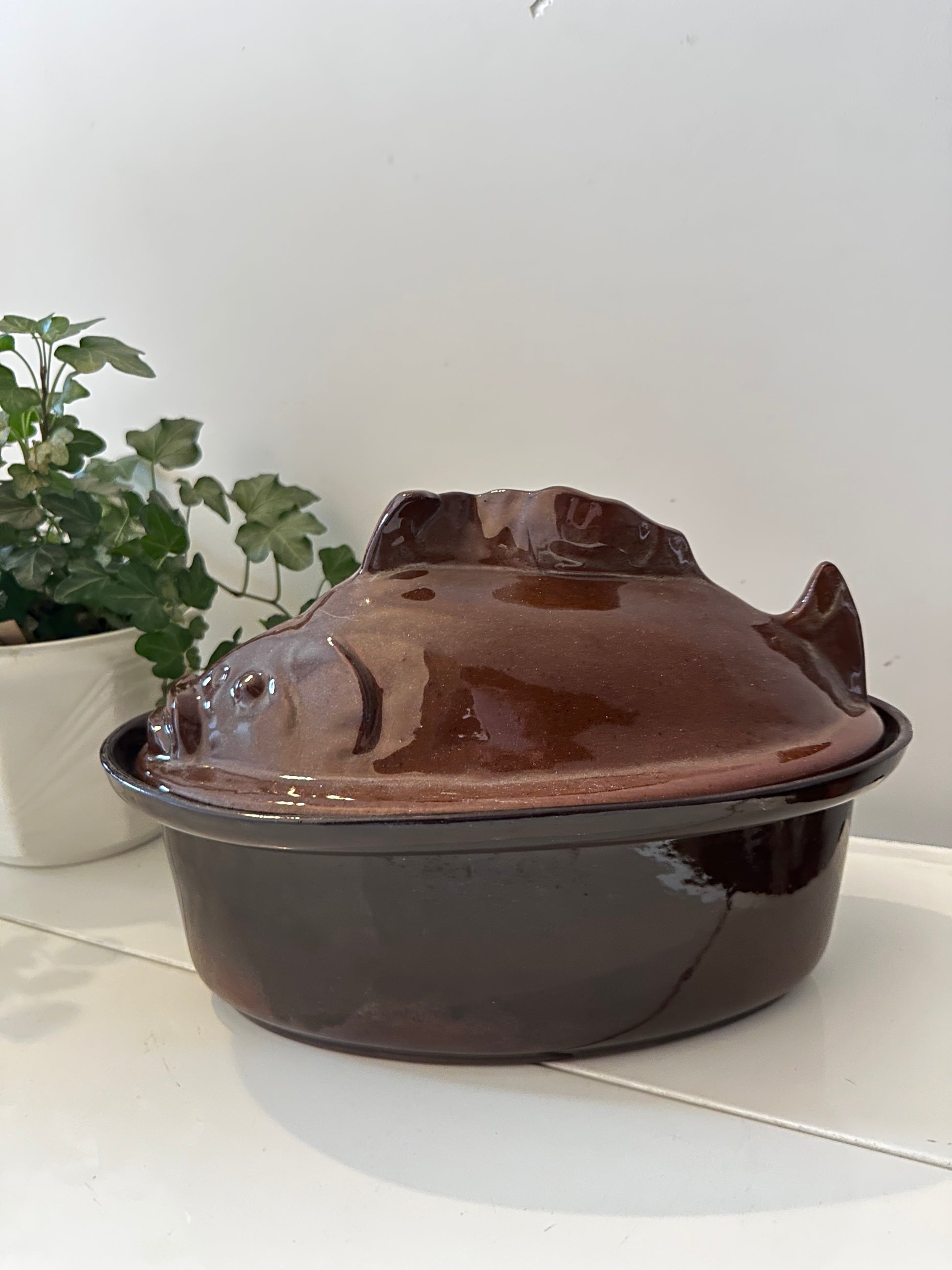Een fantastisch mooie Terrine. Afkomstig uit Duitsland en dateert jaren 70. In nog een top vintage staat. Keramiek is mooi geglazuurd en heeft een donkerbruine kleur. Op de deksel een afbeelding van een vis.