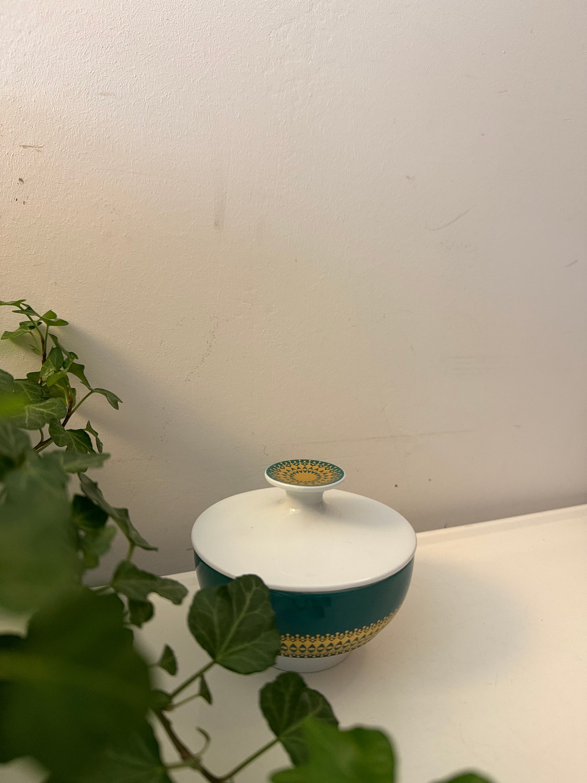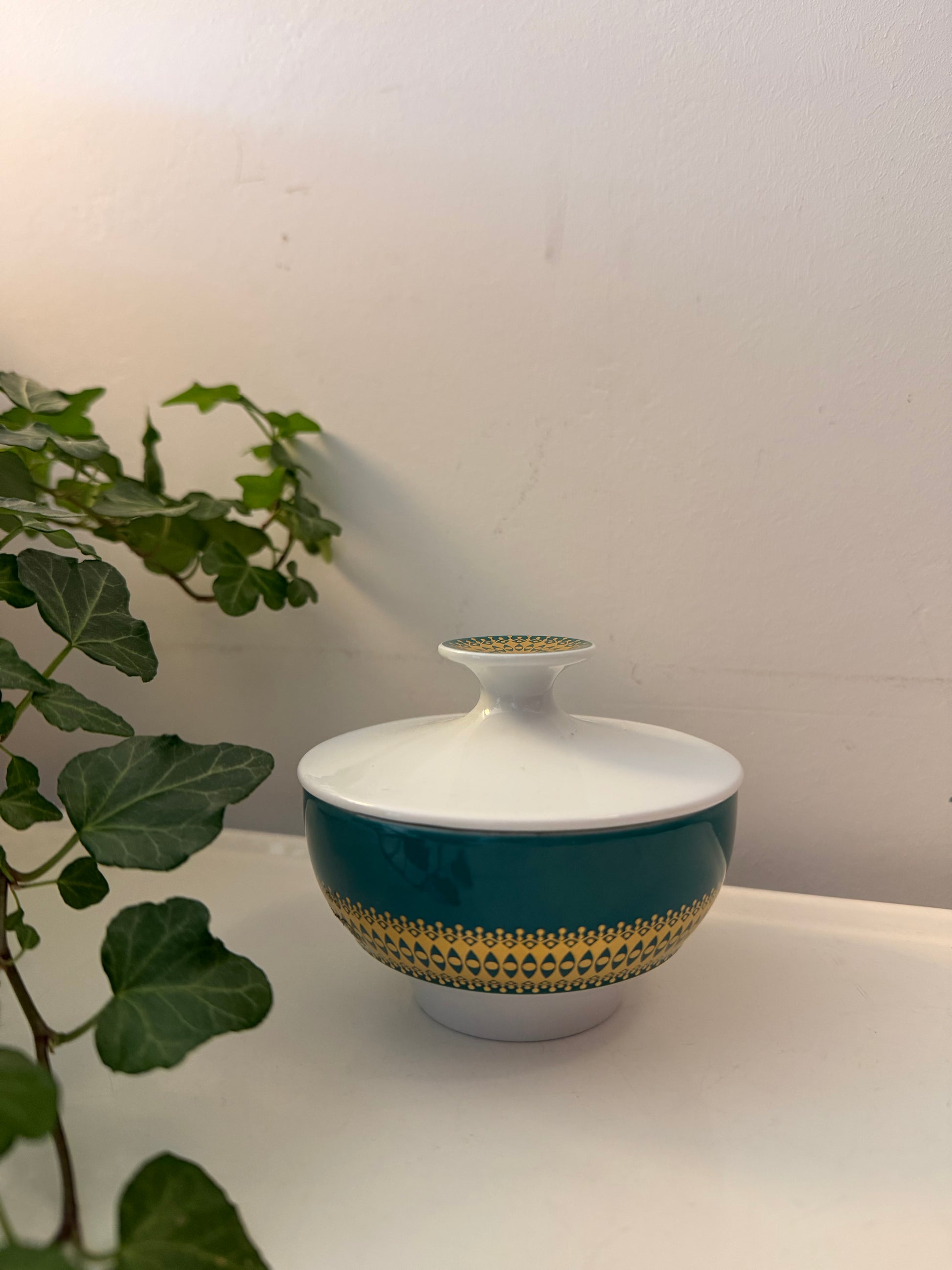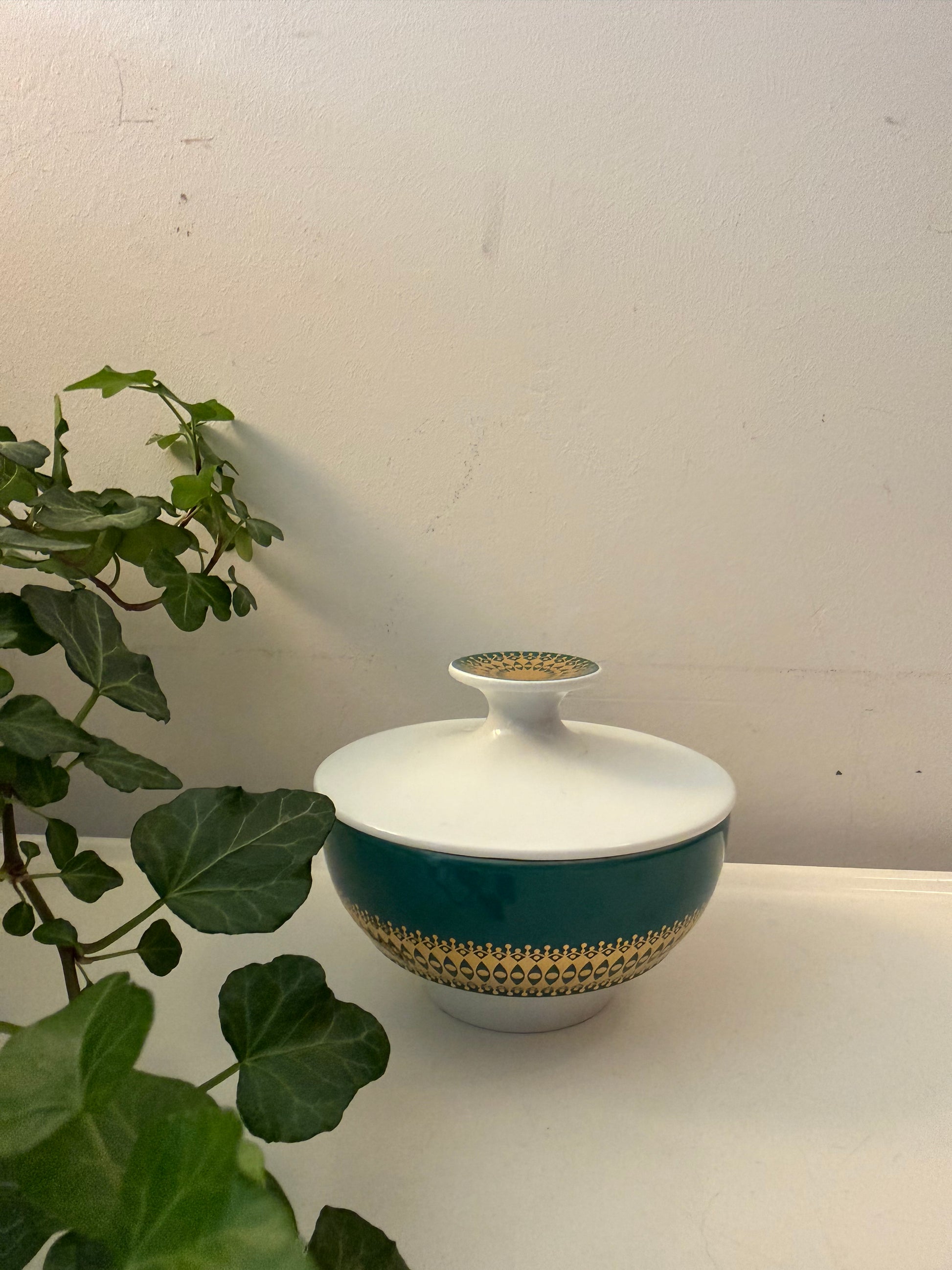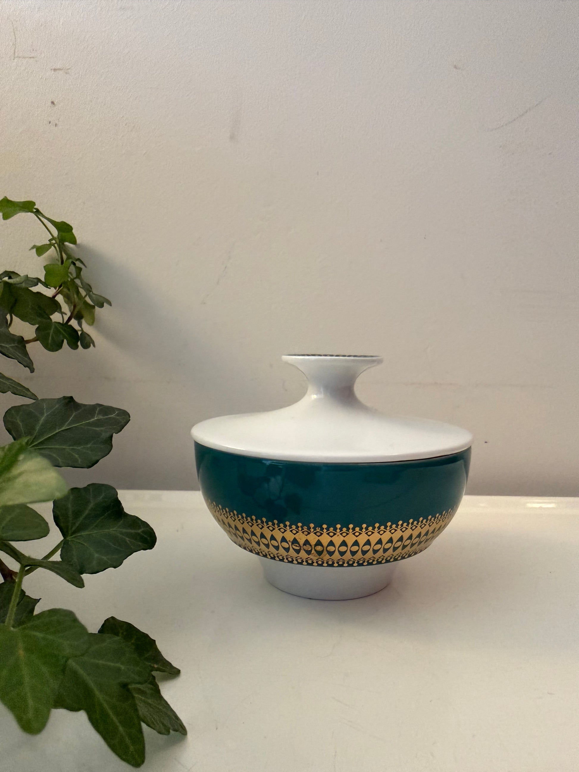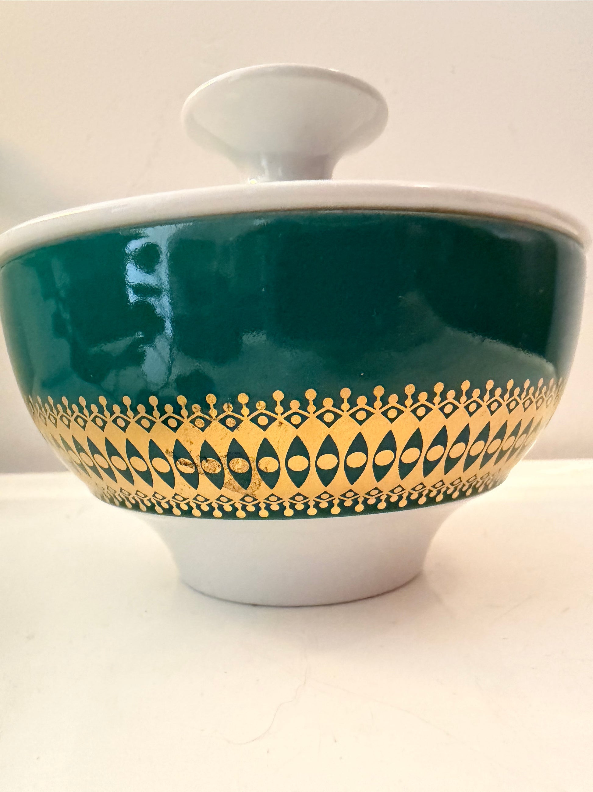 Wat een leukerd dit! Een vintage suikerpotje van Thomas Germany in wit porselein met een diepgroene band en een goudkleurig grafisch motief eromheen. De deksel heeft ook nog dat mooie gouden accent bovenop. Q837