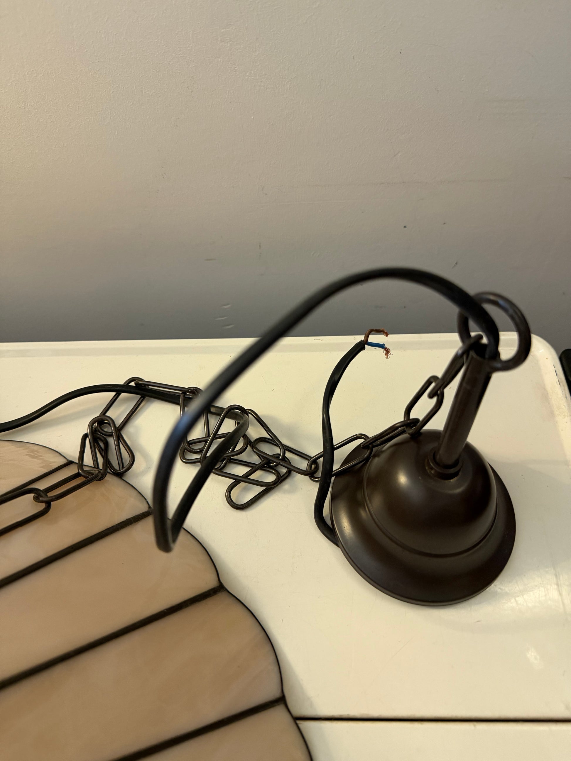 Conische hanglamp kap in Tiffany-stijl met gemarmerd crème glas. Opgebouwd uit afzonderlijke glaspanelen in koperfolie techniek, afgewerkt met donkere soldeerlijnen. Geschulpte onderrand en metalen bovenkap in bronskleur. Rustig kleurverloop in het glas met zachte schakering. Q906