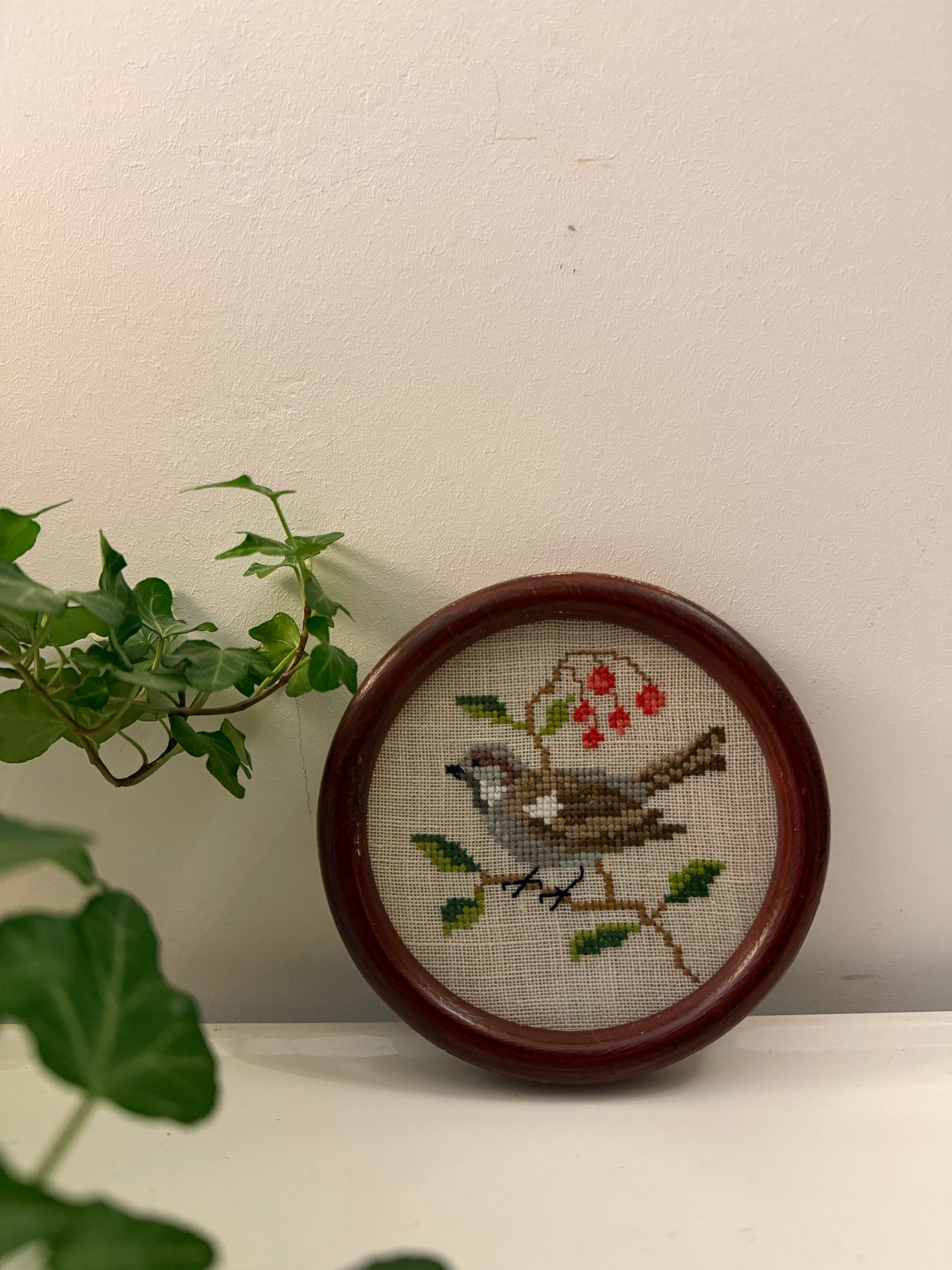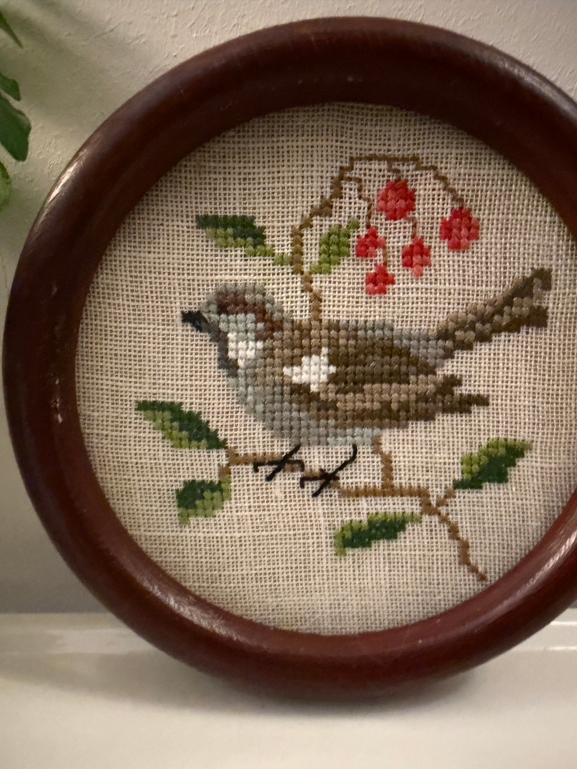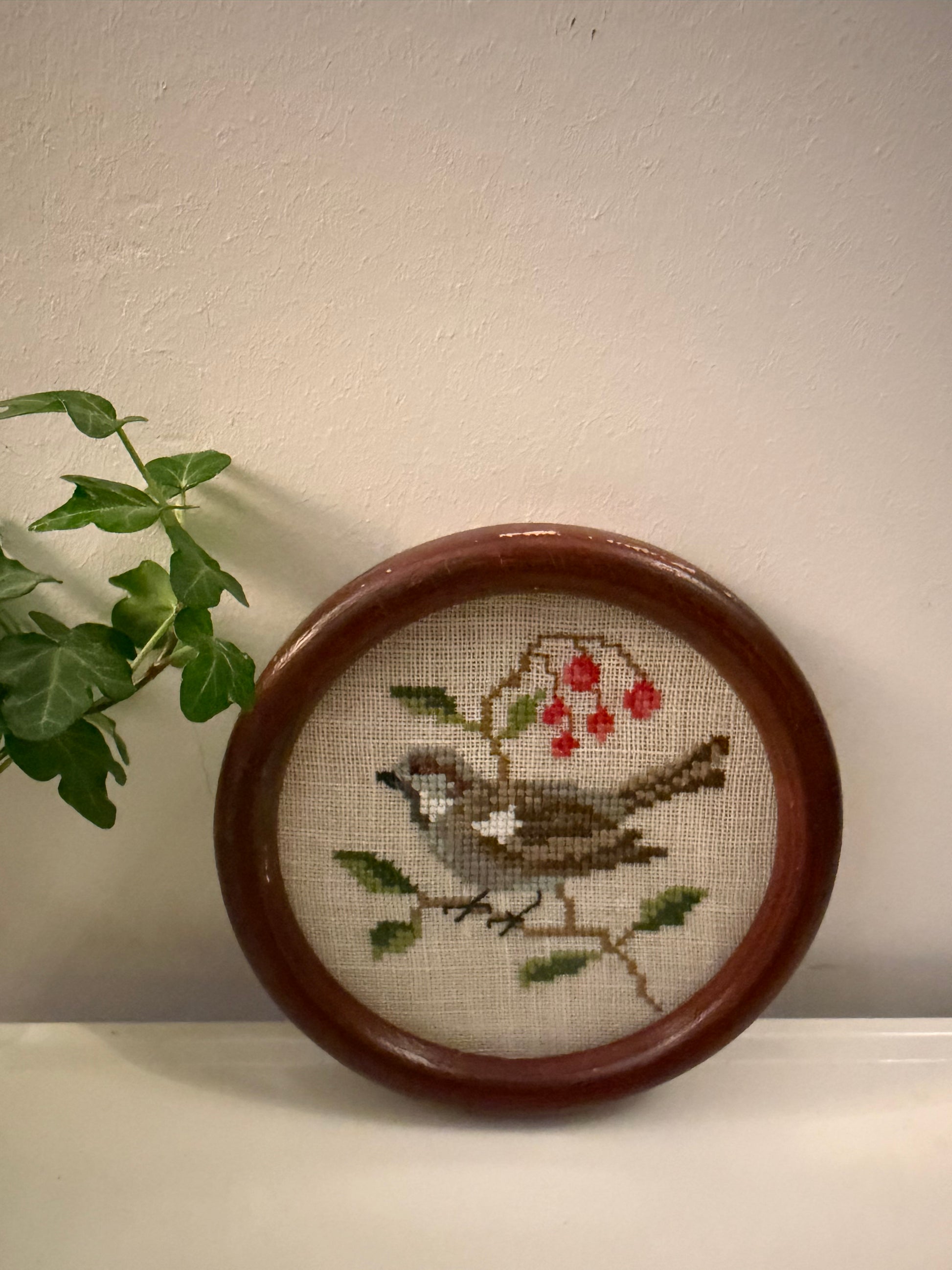Mooi klein borduurwerkje met een gekleurde vogel op een tak met blaadjes en besjes. Geborduurd in kruissteek op grof linnen in warme tinten oranje, blauw, groen en bruin. Geplaatst in een ronde, donkerhouten lijst. Q877