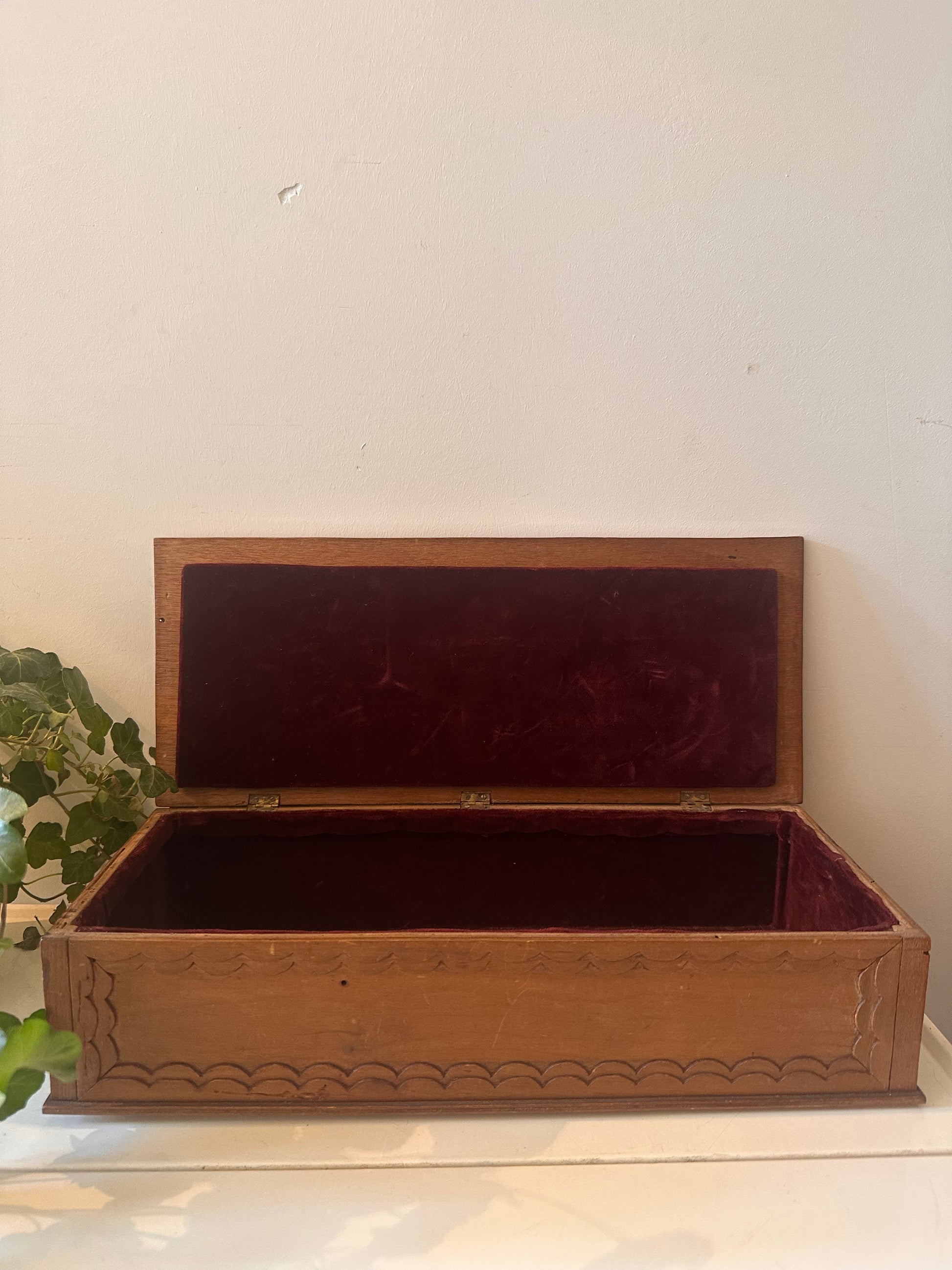 Prachtige rechthoekige doos met subtiel uitgesneden patroon aan de zijkanten en een warme houten kleur. Binnenin gevoerd met donkerrood fluweel. Heeft wat liefdevolle gebruikssporen, maar dat geeft ’m juist karakter. Q218