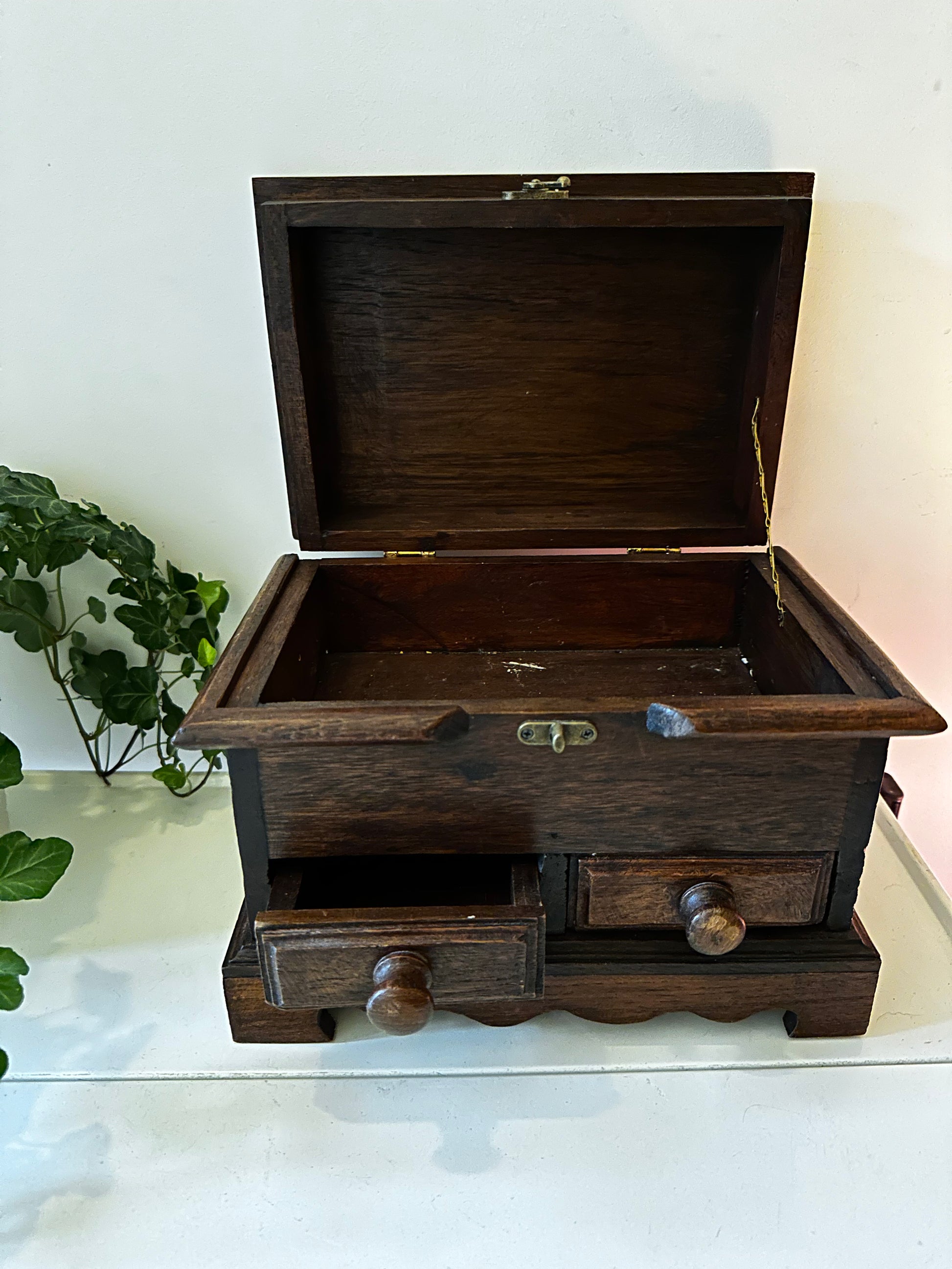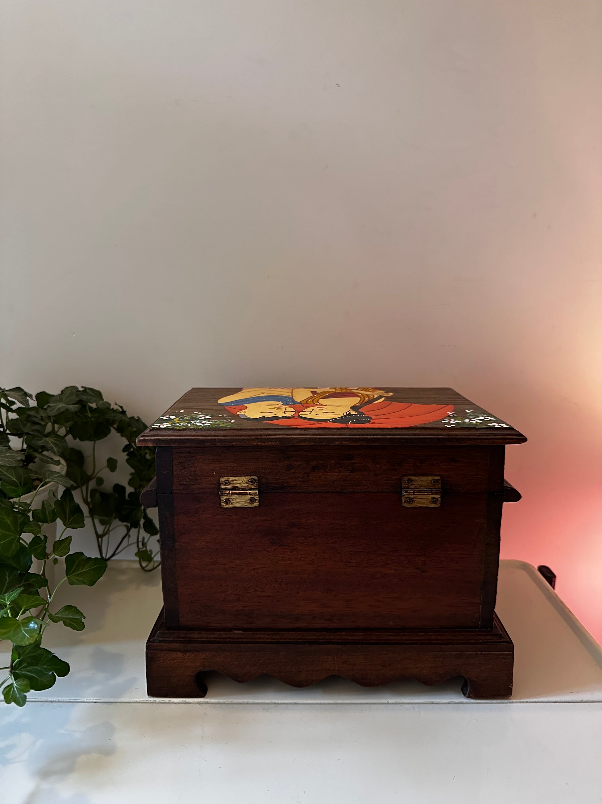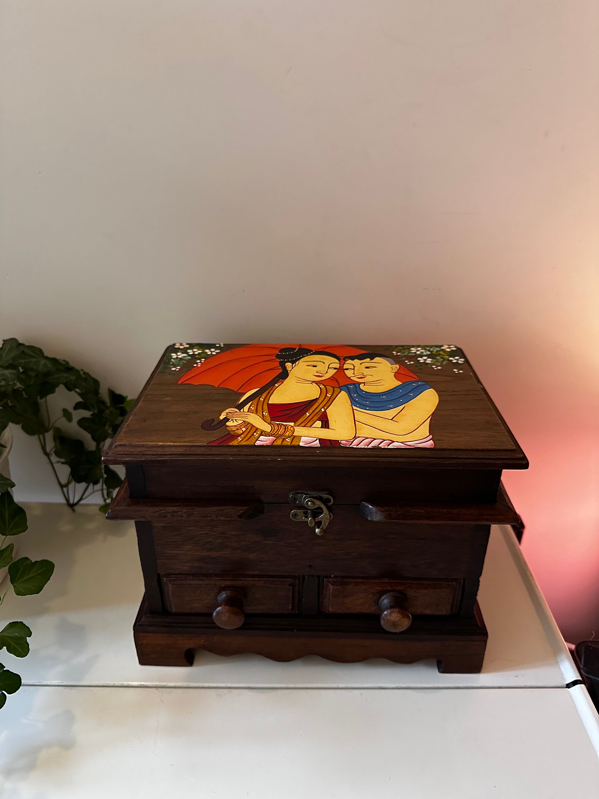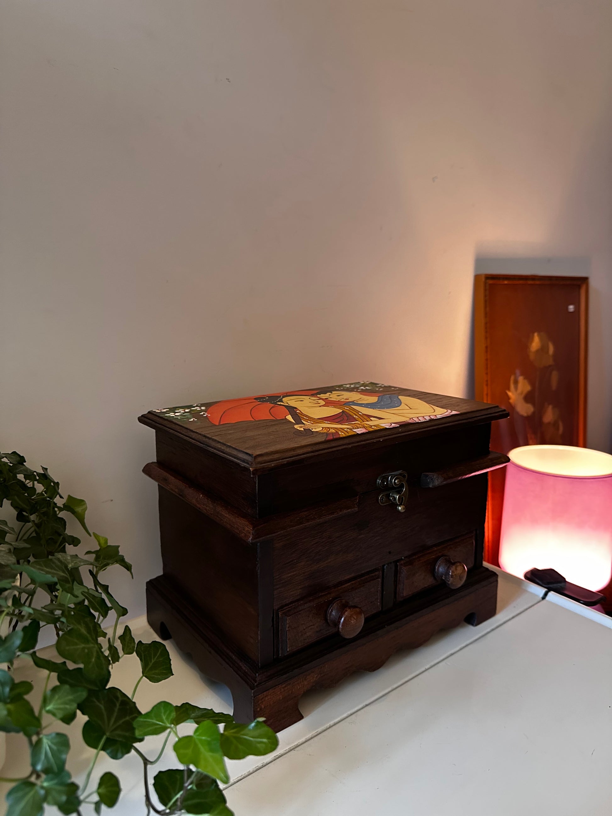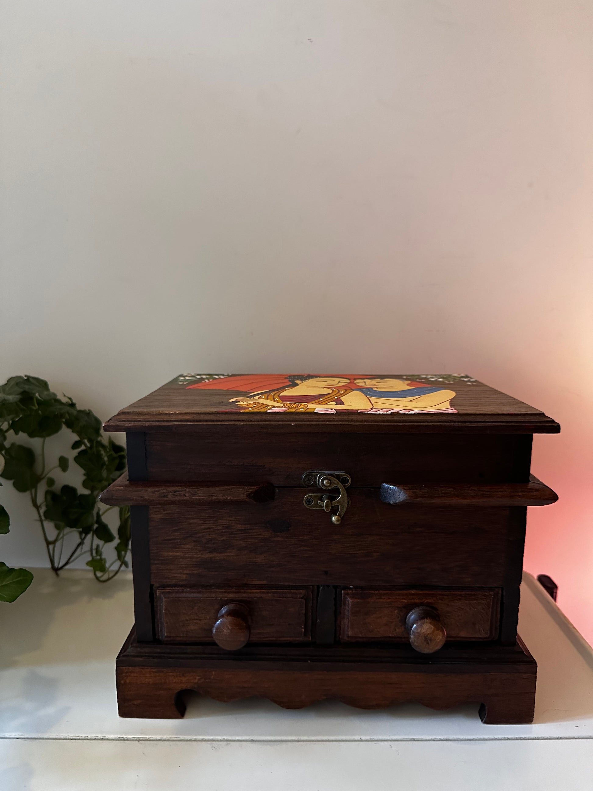 Donker houten kistje met een handgeschilderd tafereel op de deksel. Bovenin een vak met klep, onderin twee kleine laadjes voor sieraden, briefjes of andere schatten.