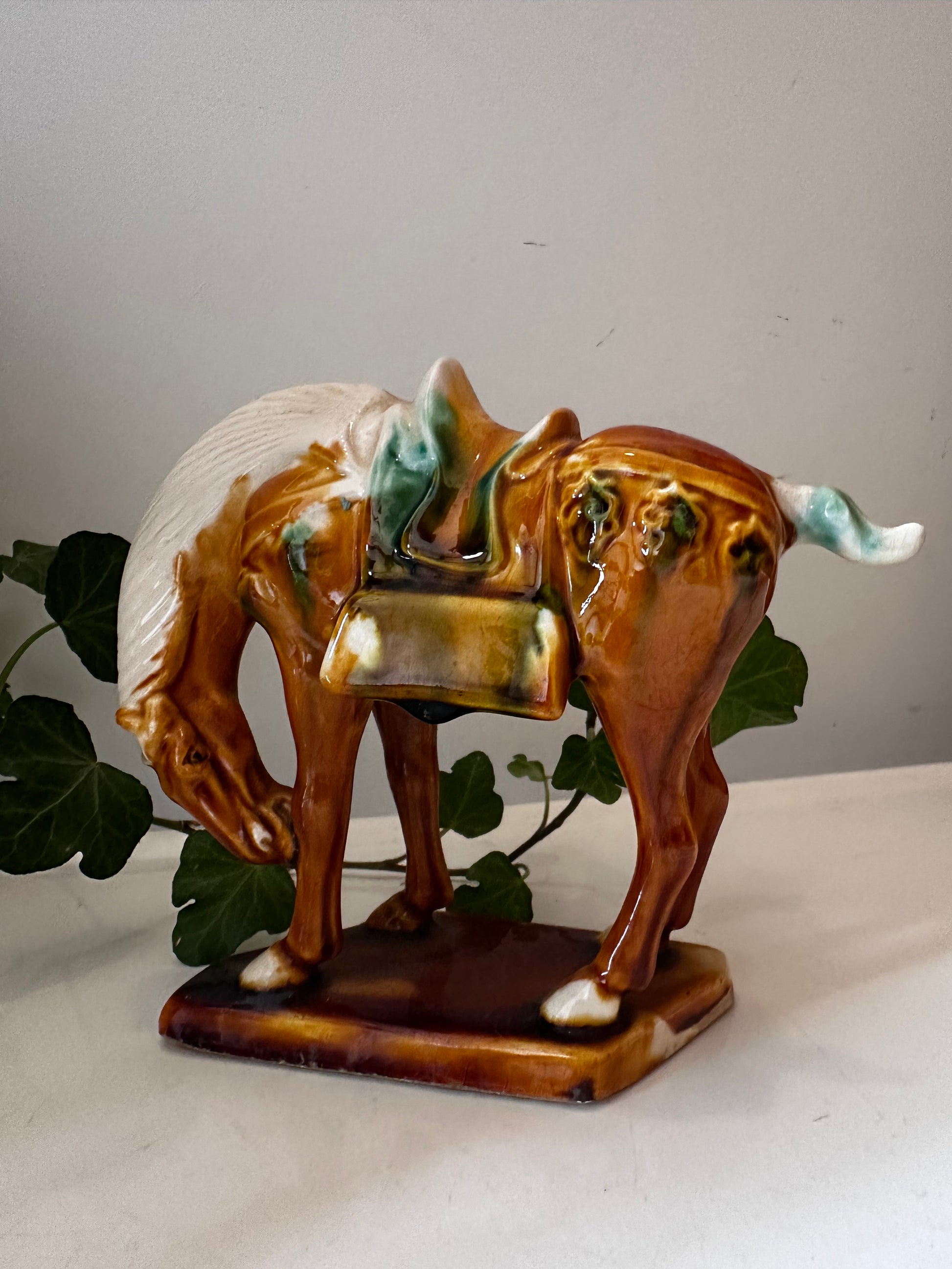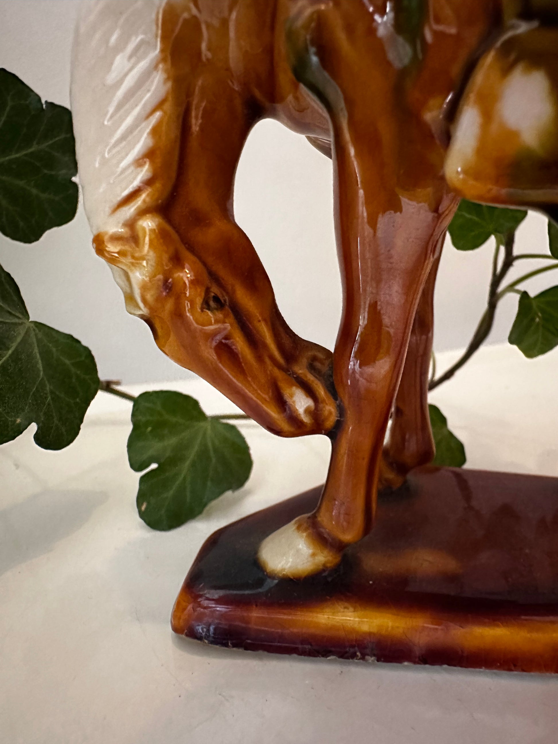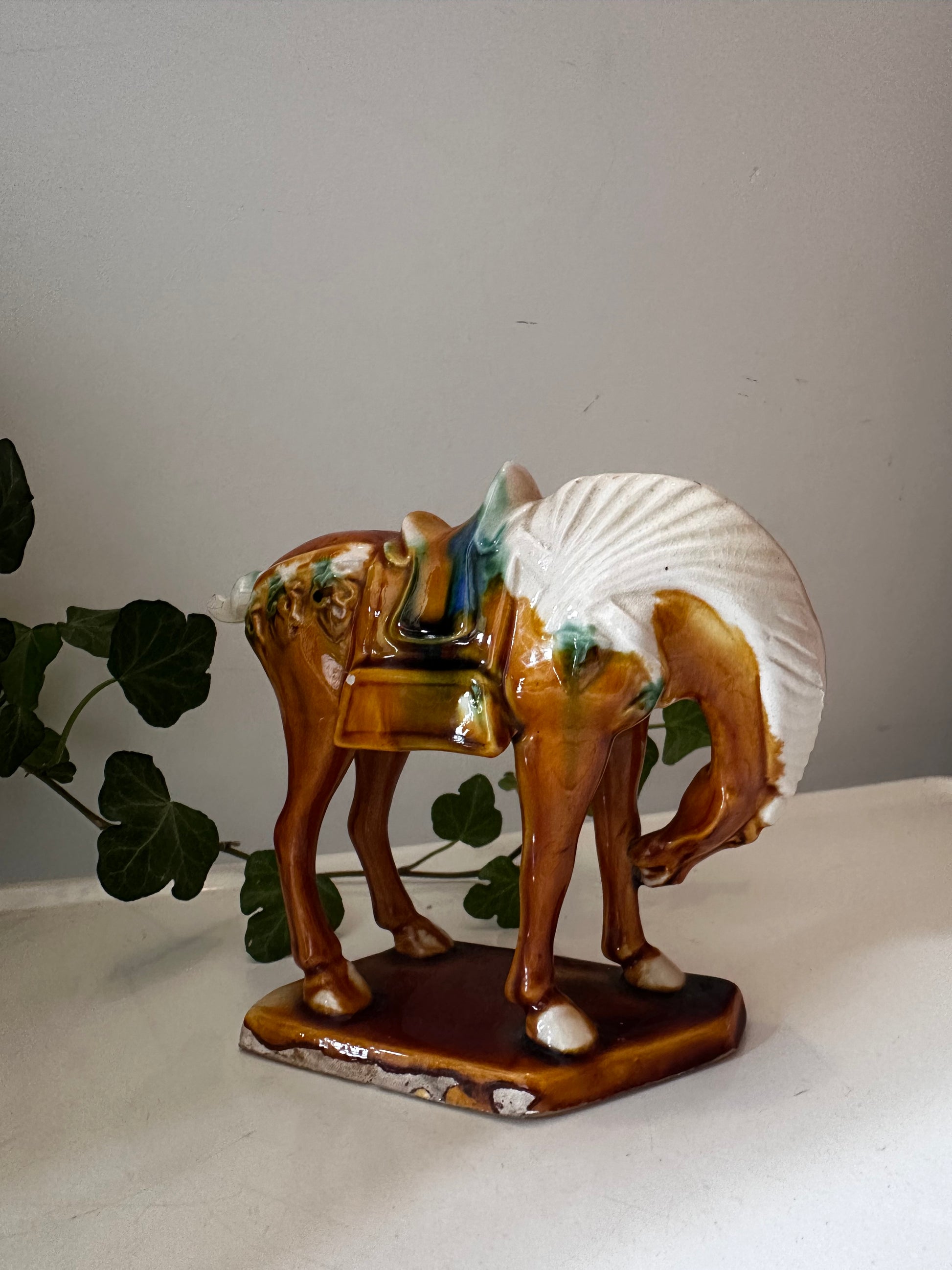 Keramieken beeld in Tang-stijl met die mooie glans in warme tinten. Paardje is in een mooie vintage staat en heeft een merktekentje onder. Q6