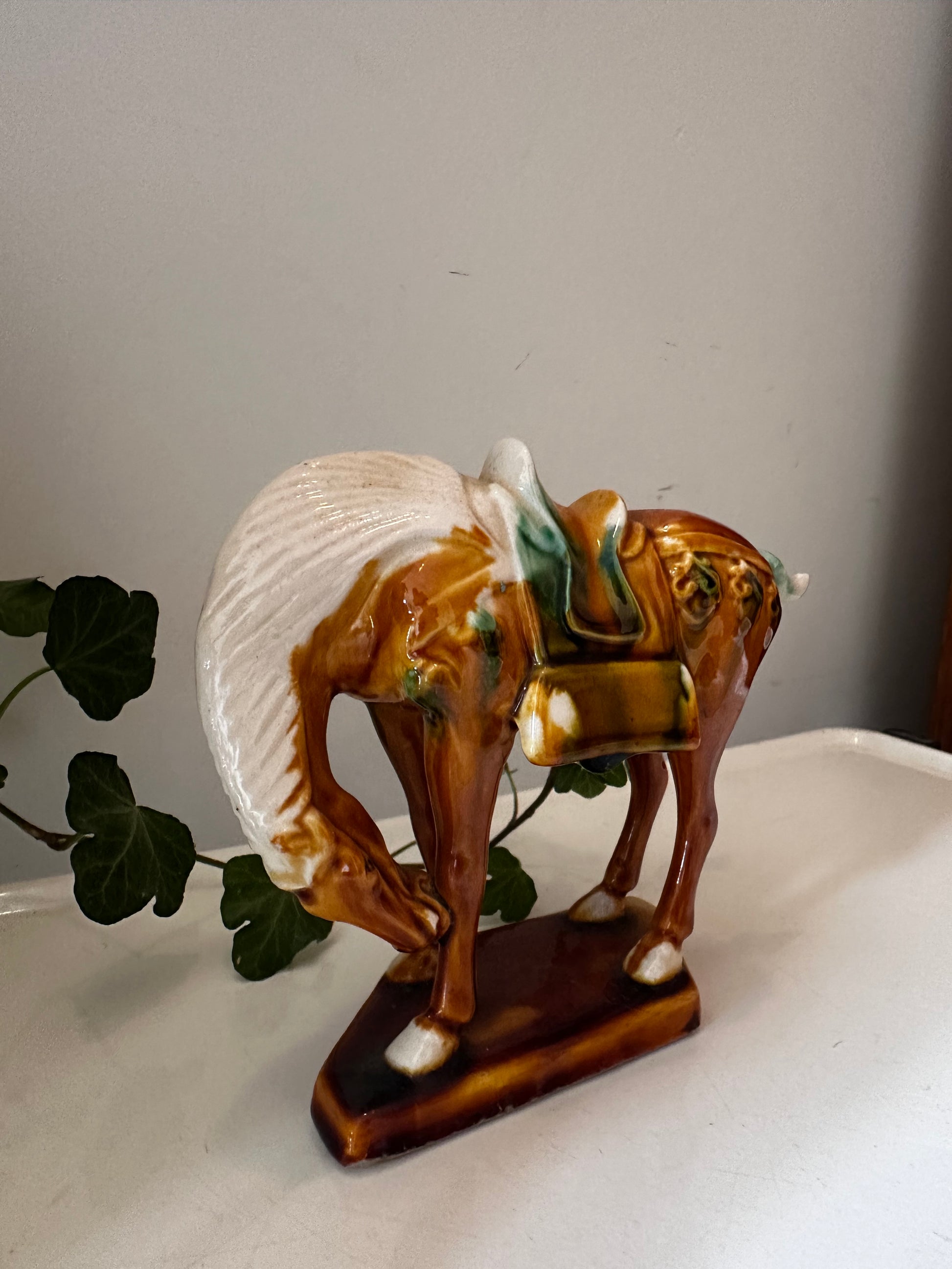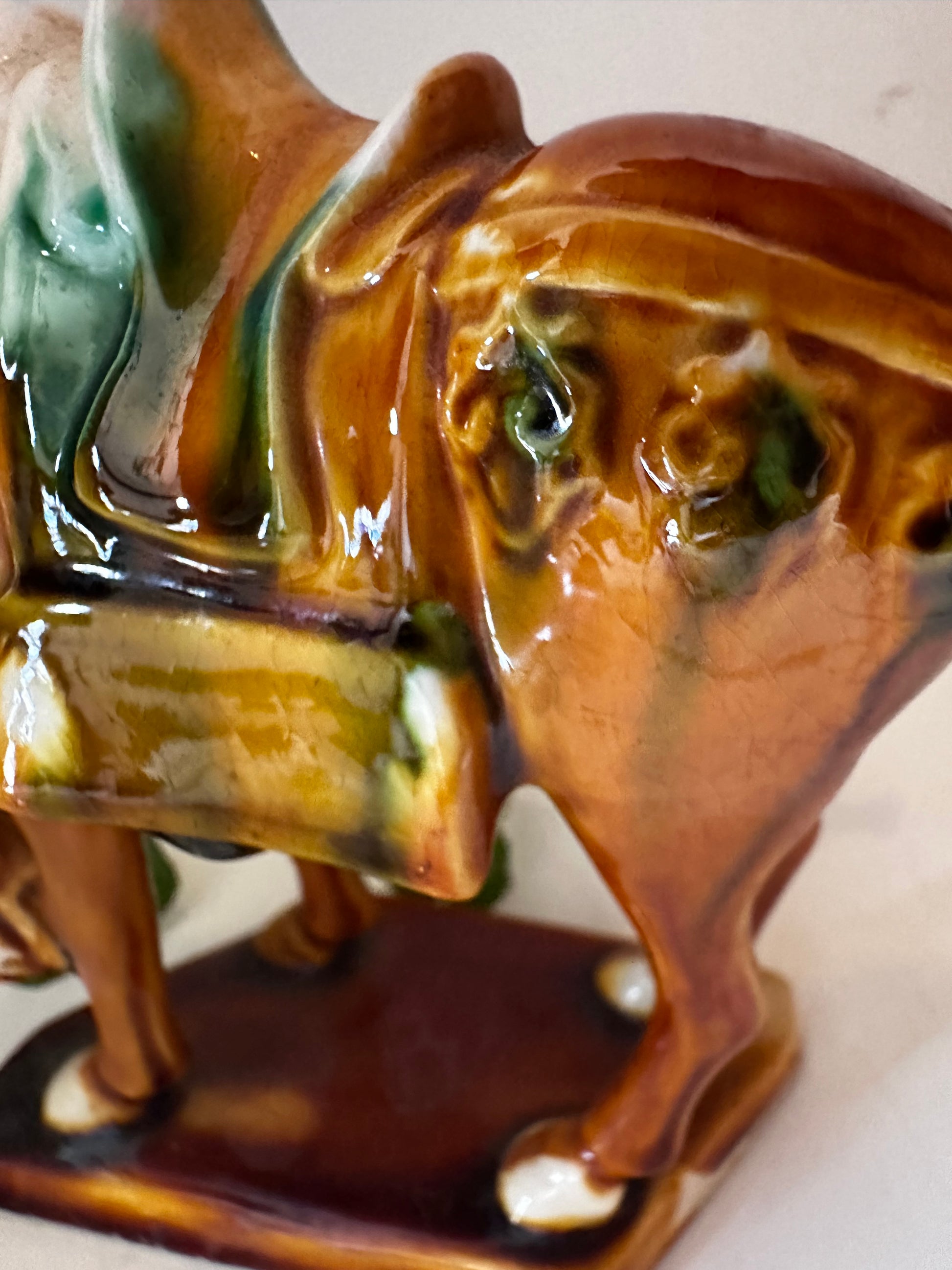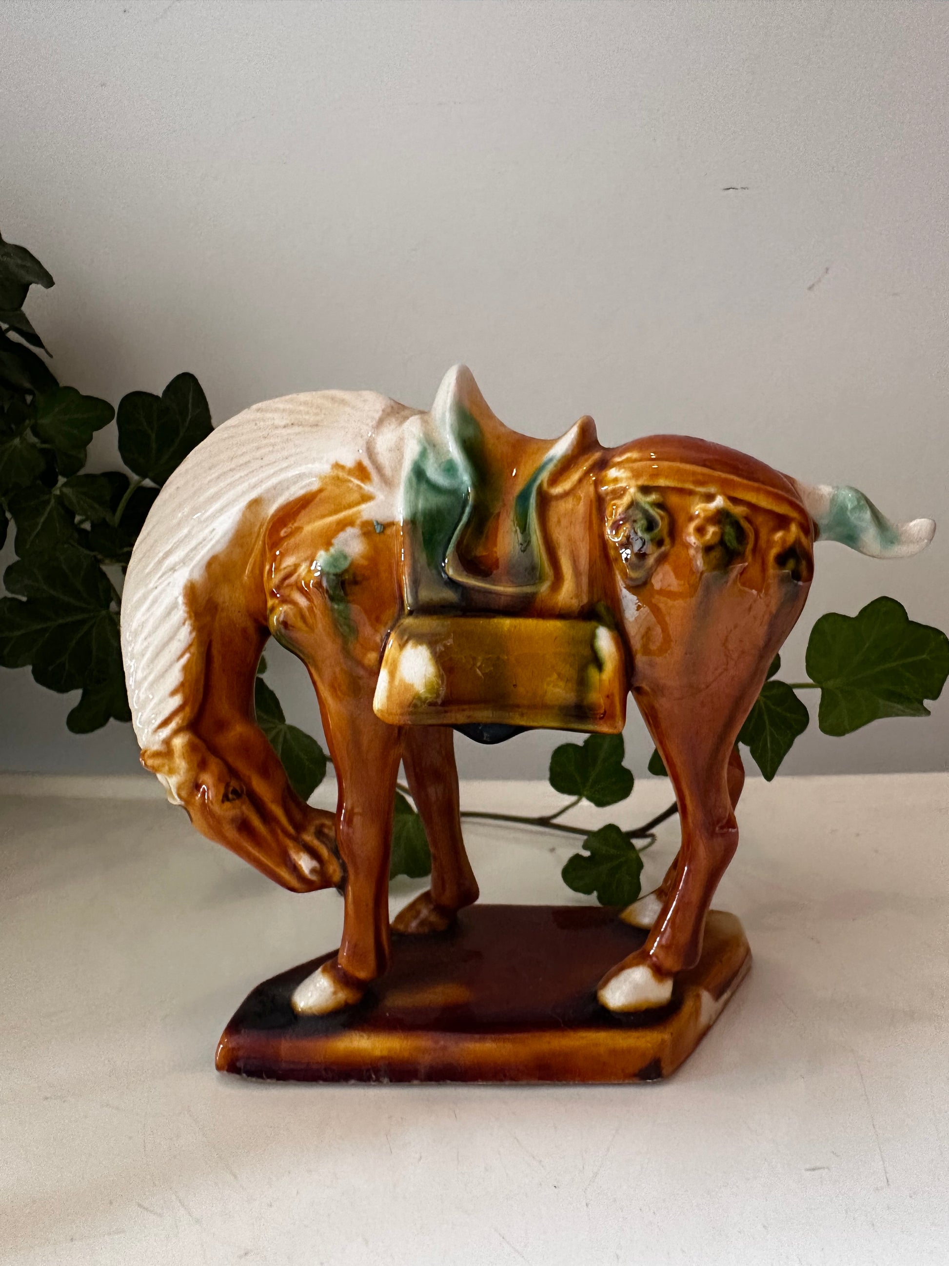 Keramieken beeld in Tang-stijl met die mooie glans in warme tinten. Paardje is in een mooie vintage staat en heeft een merktekentje onder. Q6