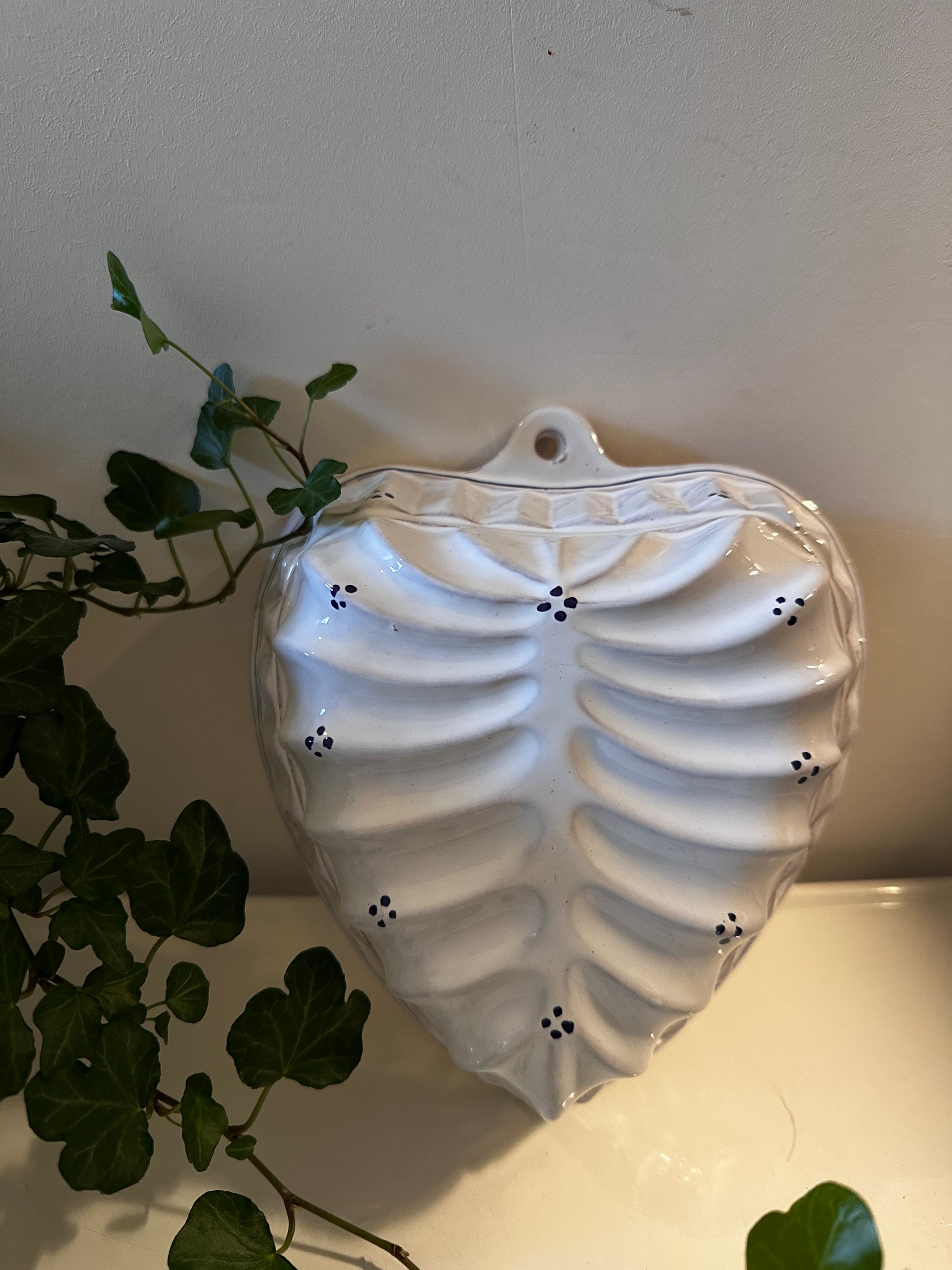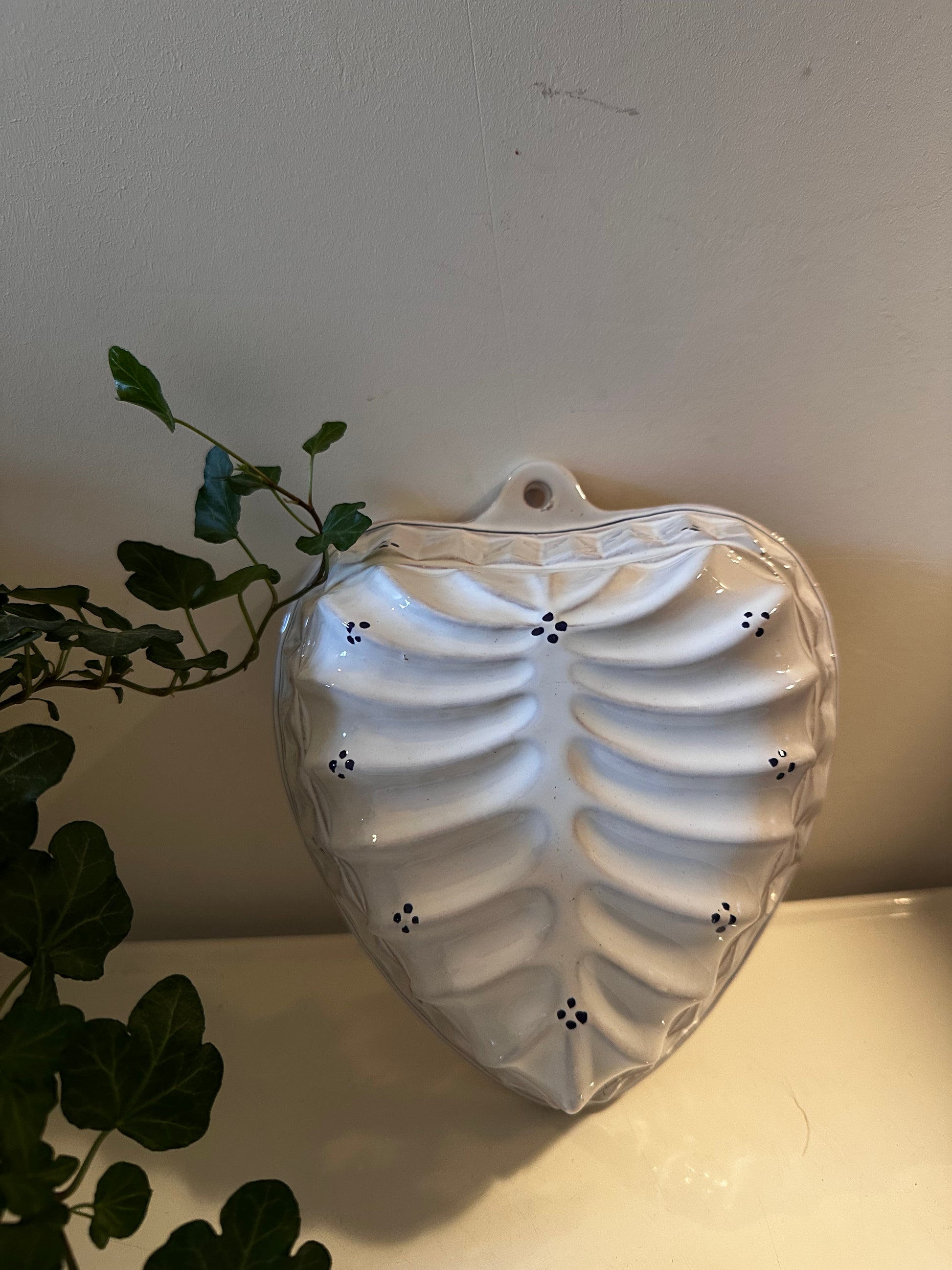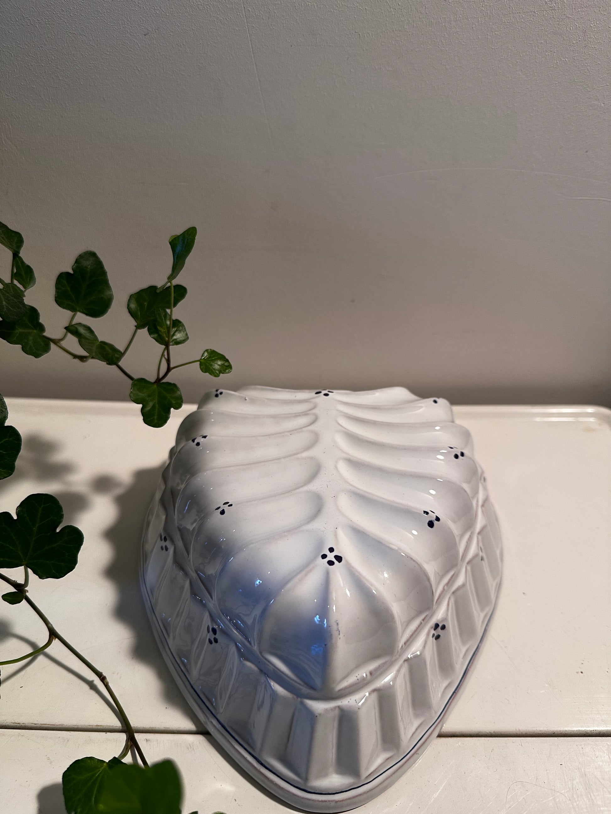 Super gave keramieken puddingvorm. In een witte kleur met een design van blauwe puntjes. De puddingvorm is in de vorm van een hart en in een top vintage staat.