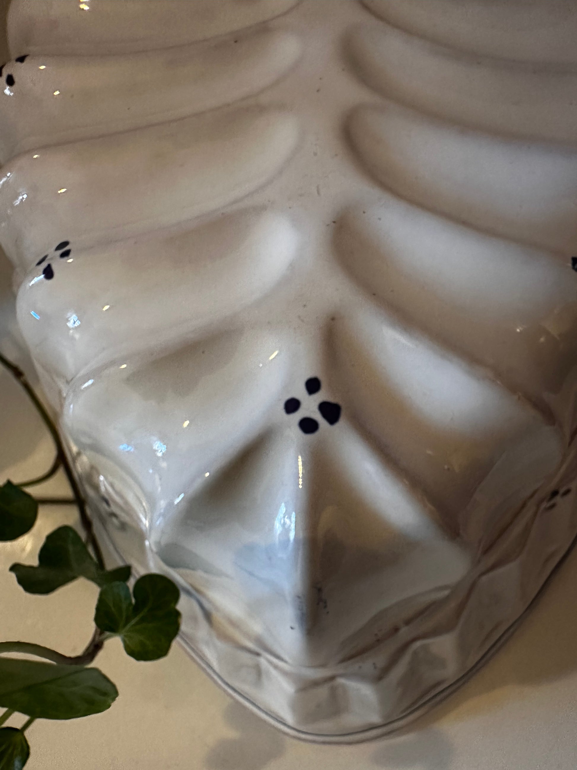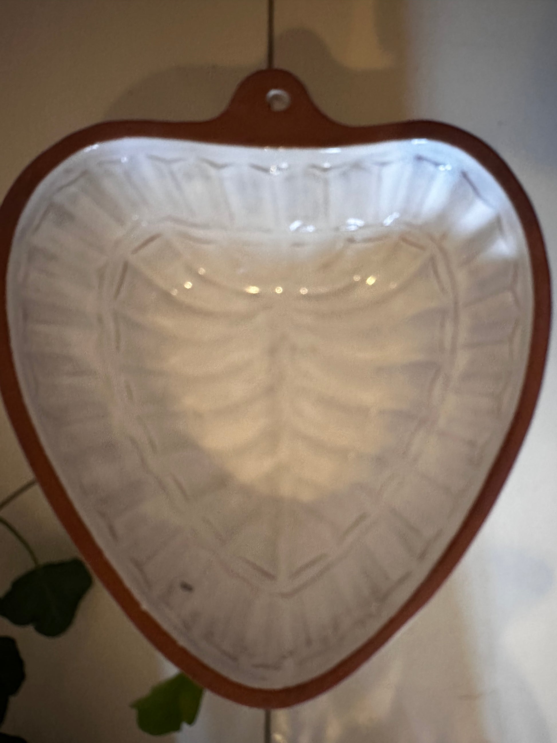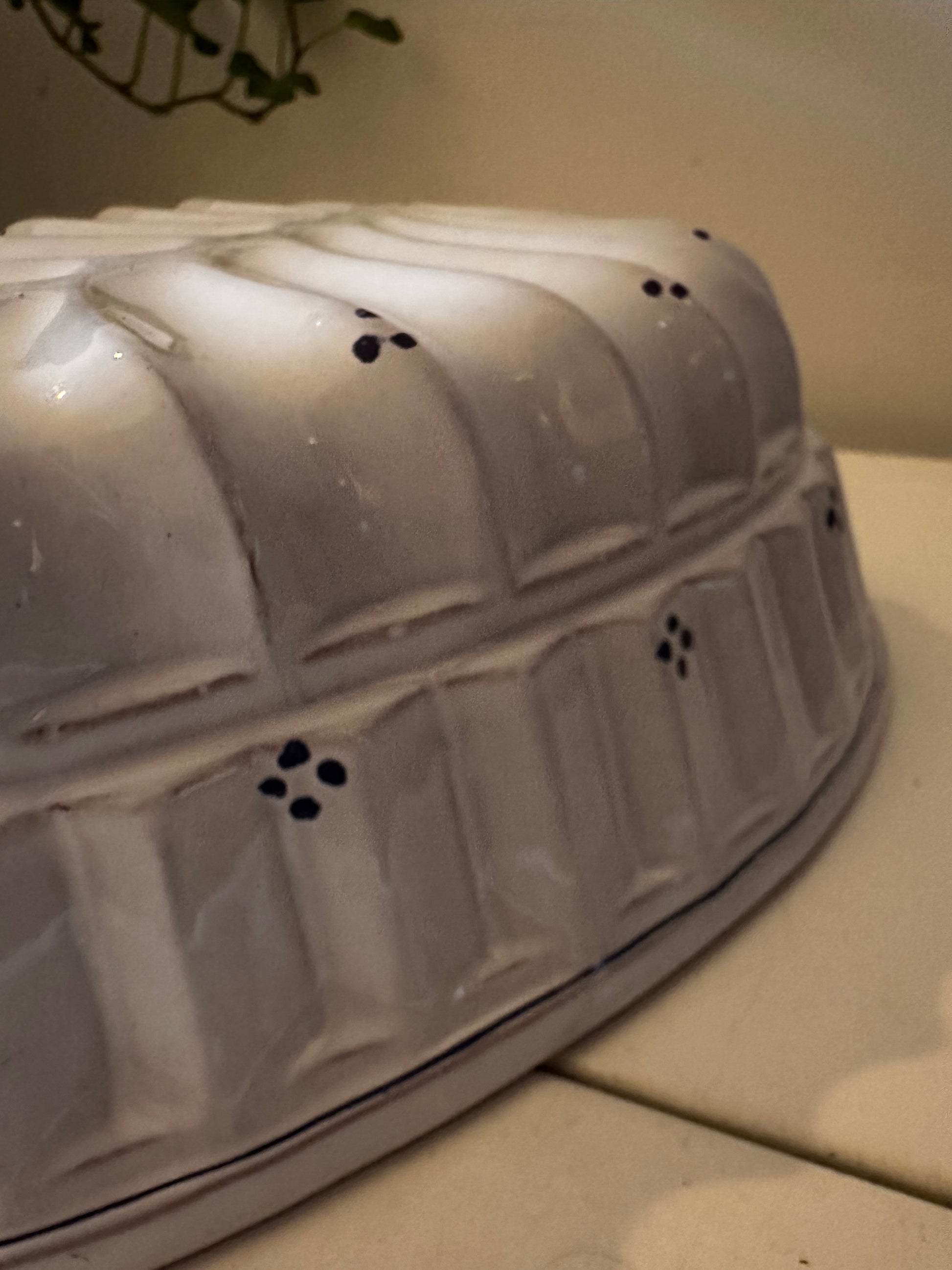Super gave keramieken puddingvorm. In een witte kleur met een design van blauwe puntjes. De puddingvorm is in de vorm van een hart en in een top vintage staat.
