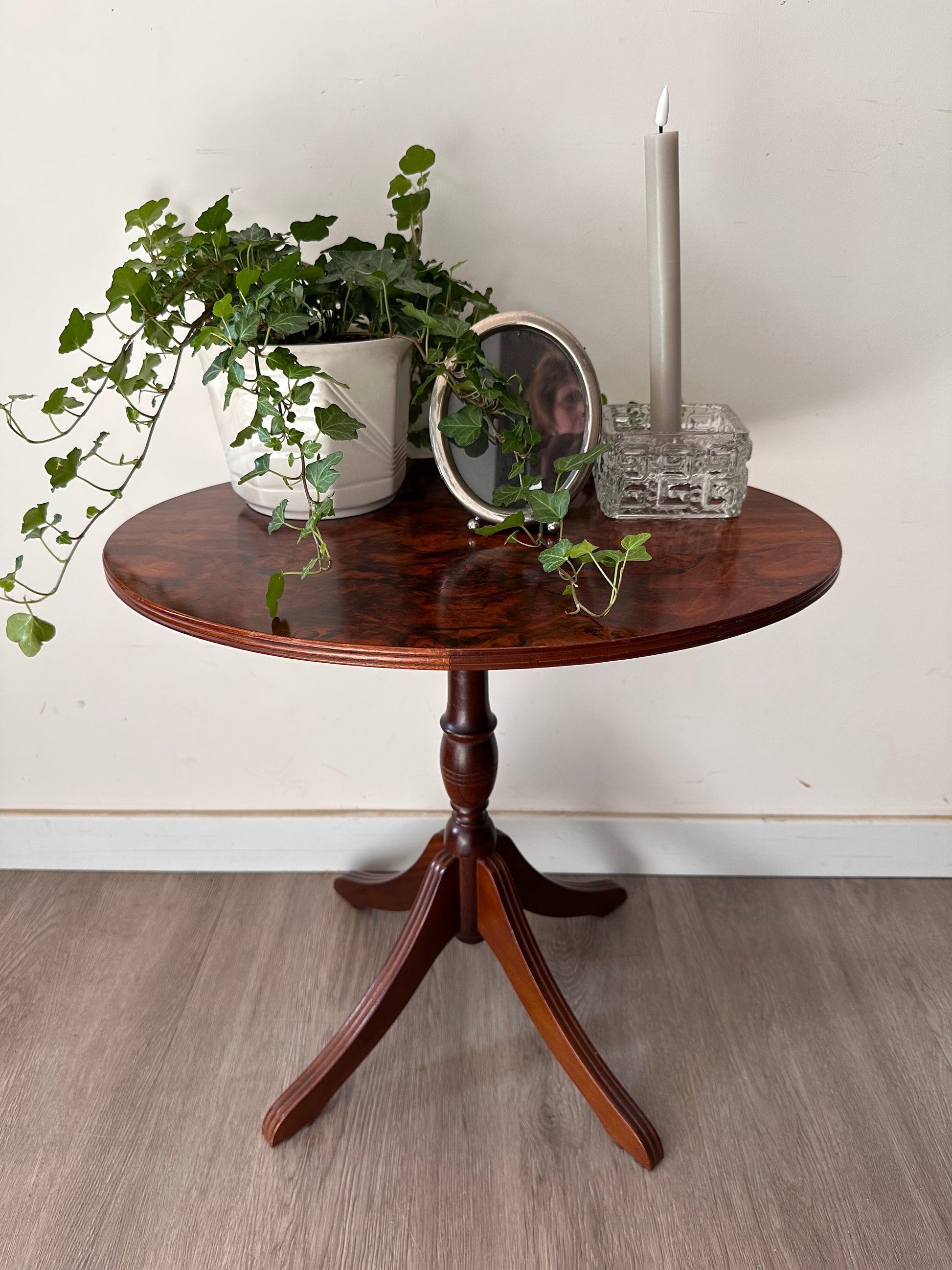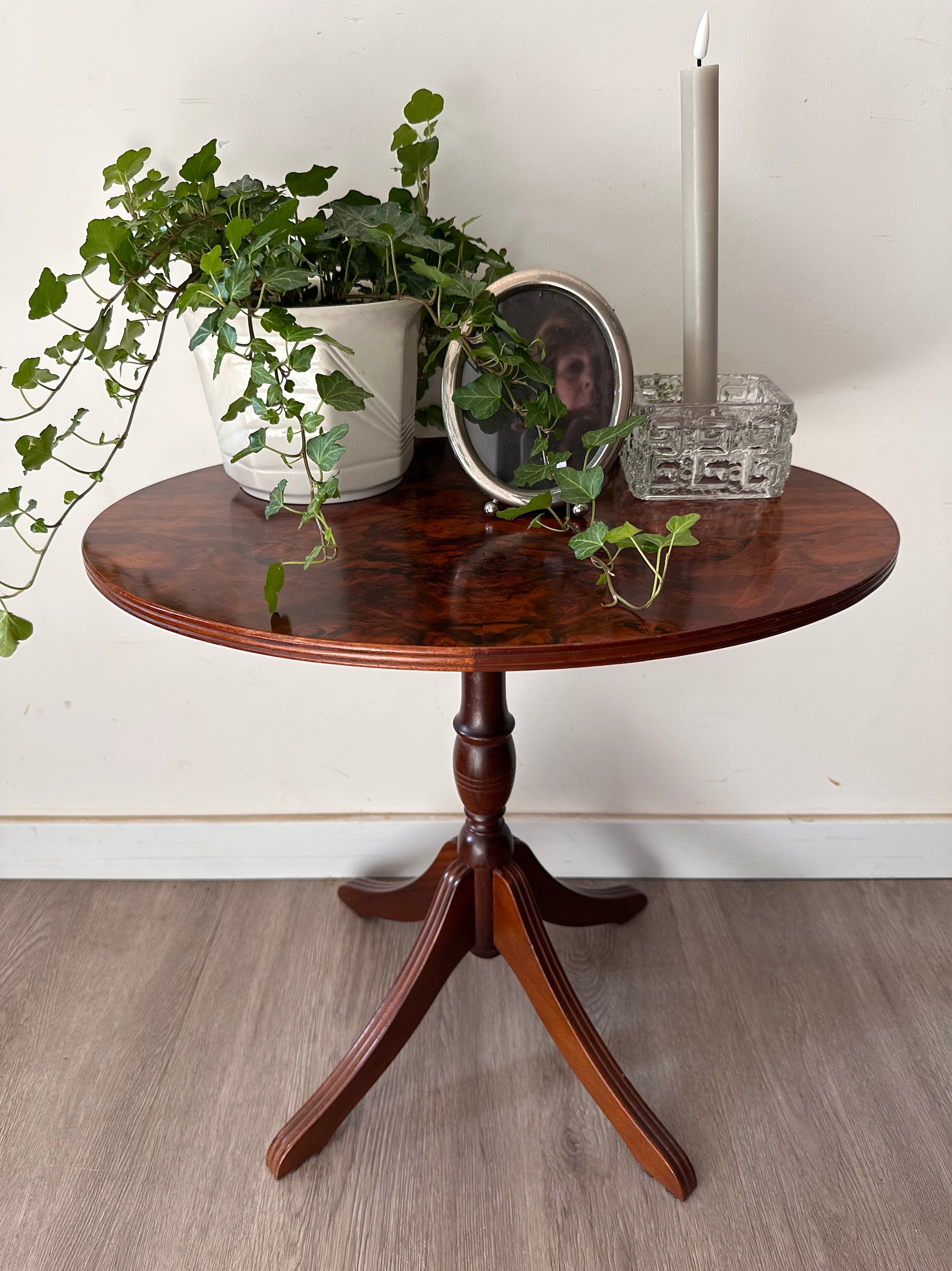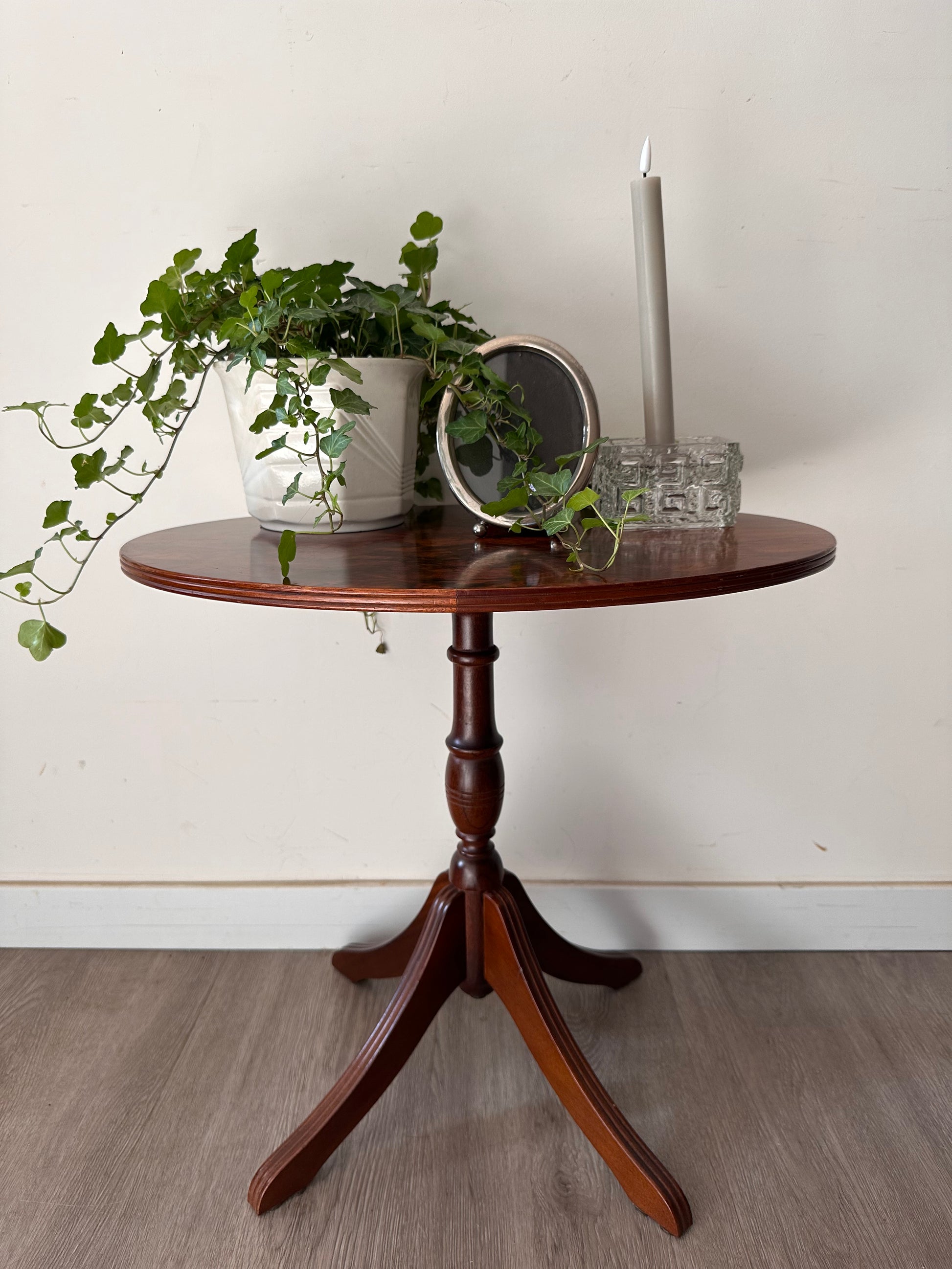 Chique en tijdloos in één: dit ronde houten koffietafeltje met gedraaide middenpoot en drie poten. Het blad heeft een mooie houtnerf die direct warmte in je interieur brengt. Ideaal naast de bank of als plantentafel, maar ook leuk met een stapel koffietafelboeken erop. Q437