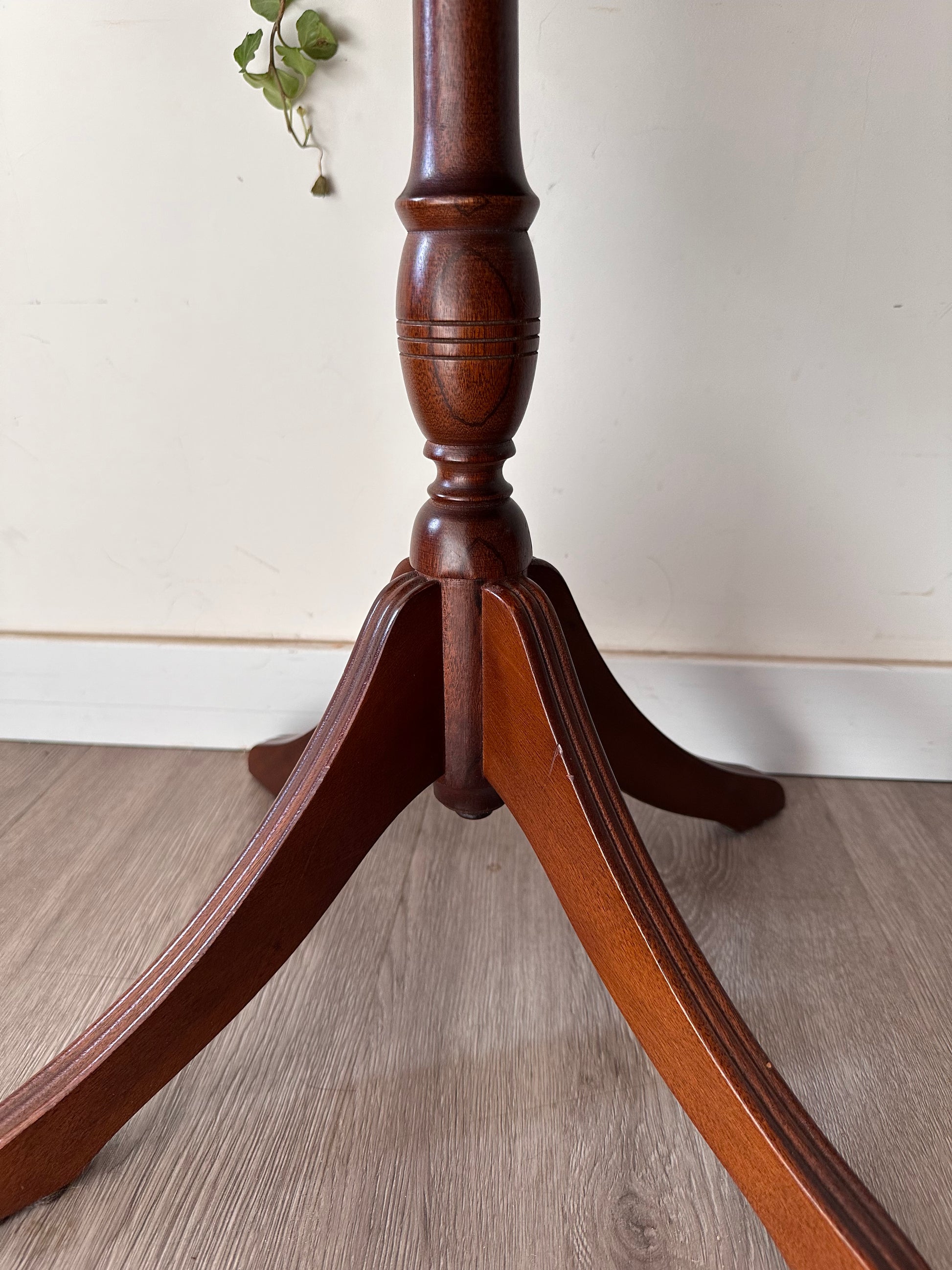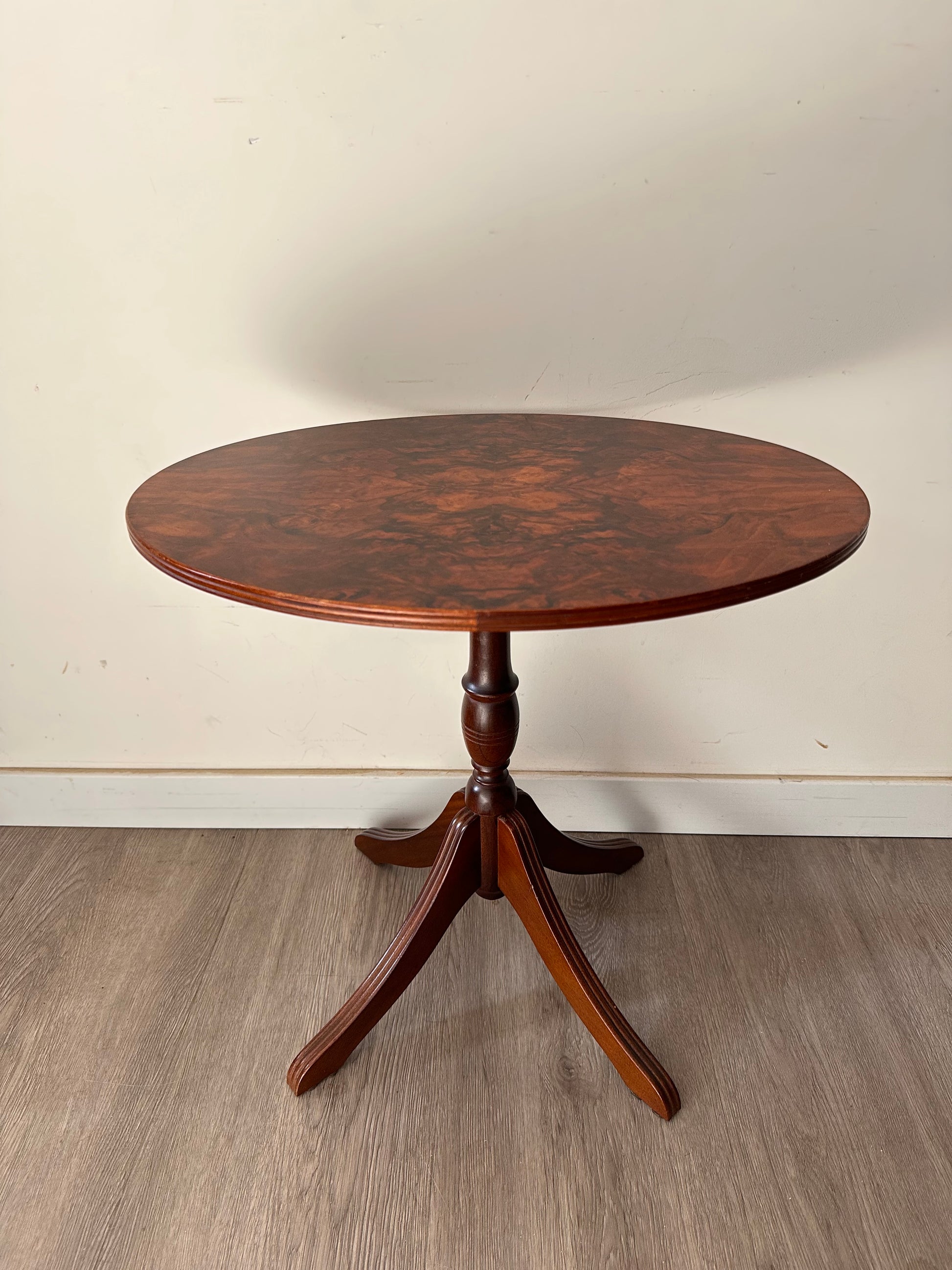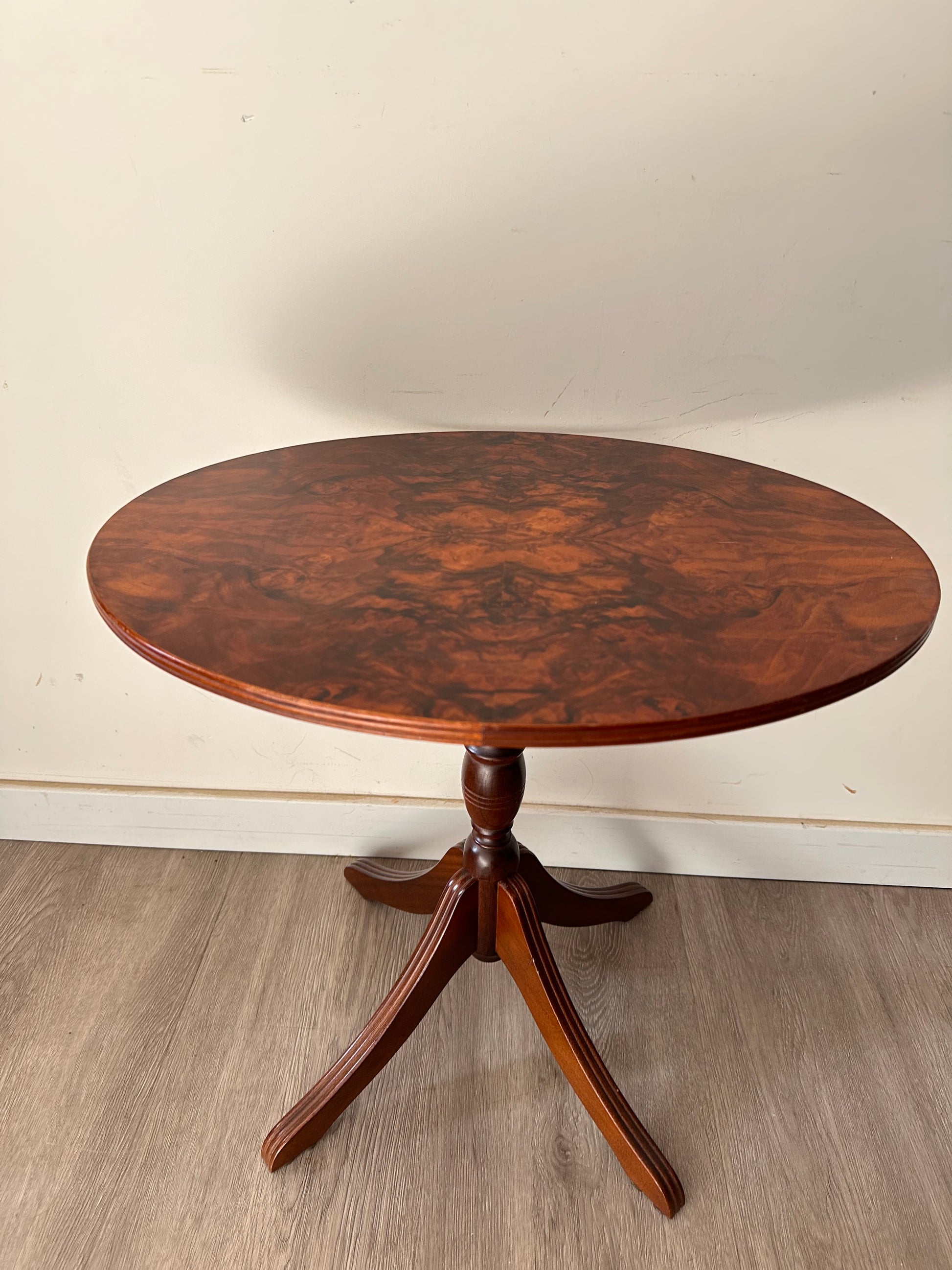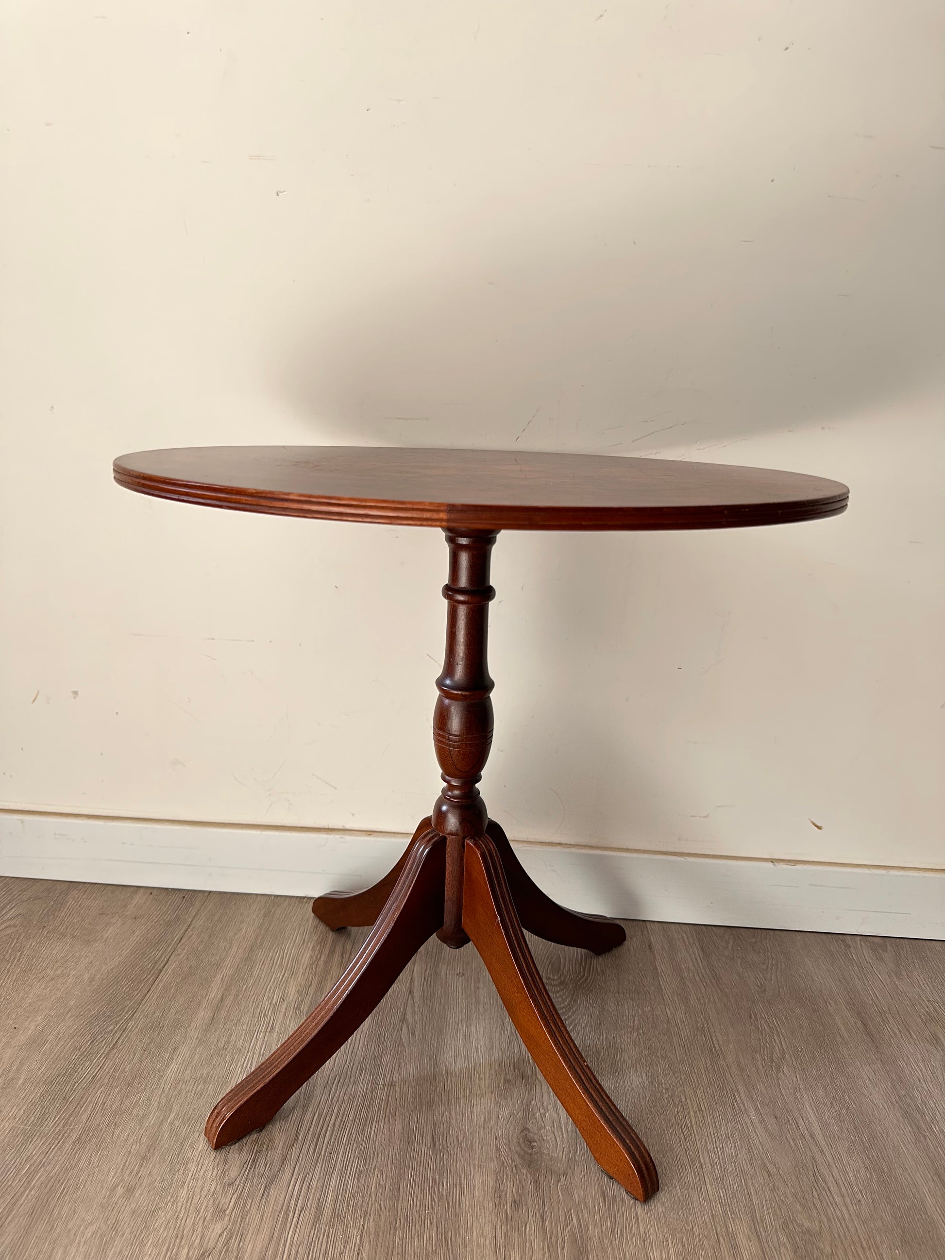 Chique en tijdloos in één: dit ronde houten koffietafeltje met gedraaide middenpoot en drie poten. Het blad heeft een mooie houtnerf die direct warmte in je interieur brengt. Ideaal naast de bank of als plantentafel, maar ook leuk met een stapel koffietafelboeken erop. Q437
