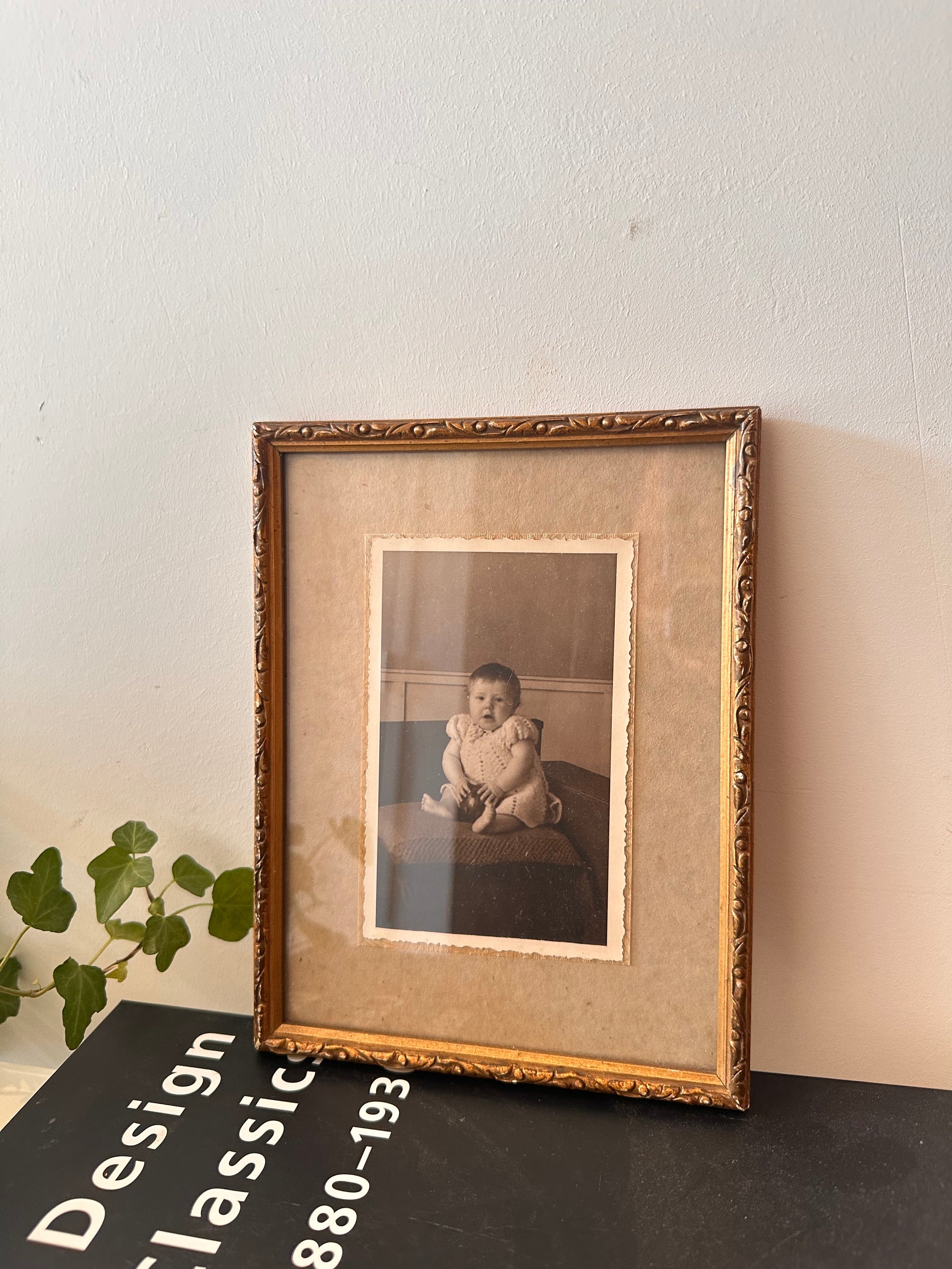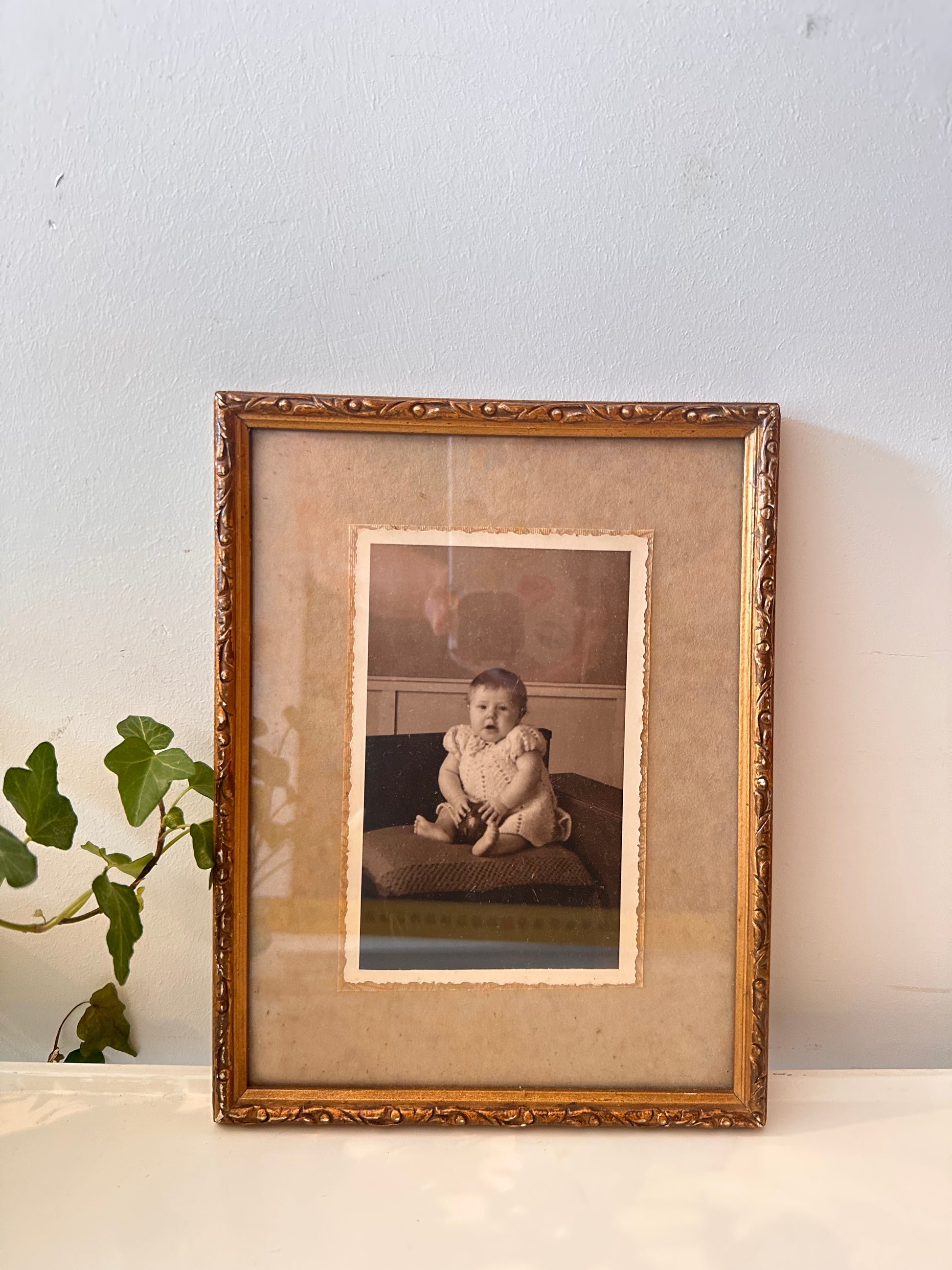 Supermooi oud houten lijstje met goudkleurige sierlijst en een schattig zwart-wit prentje van een baby. De lijst heeft een zachte verweerde uitstraling en een klassieke passe-partout. Aan de achterkant zit nog het originele metalen ophanghaakje. Q117