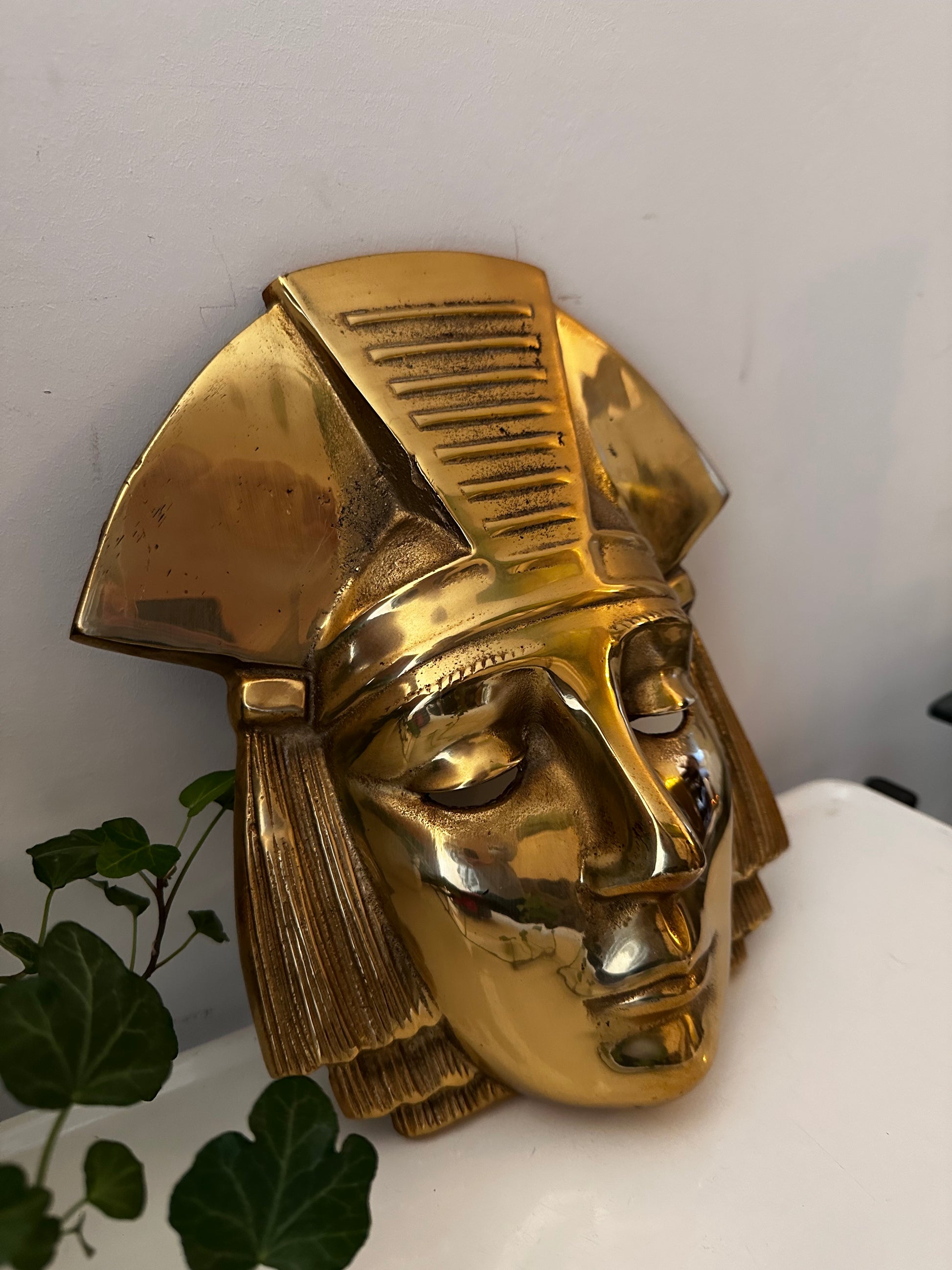 Glam vintage wall power! Dit indrukwekkende masker van messing uit de jaren 70 is een echte eyecatcher. Geïnspireerd op het oude Egypte, met gesloten ogen en serene uitstraling. Mooi zwaar en solide.