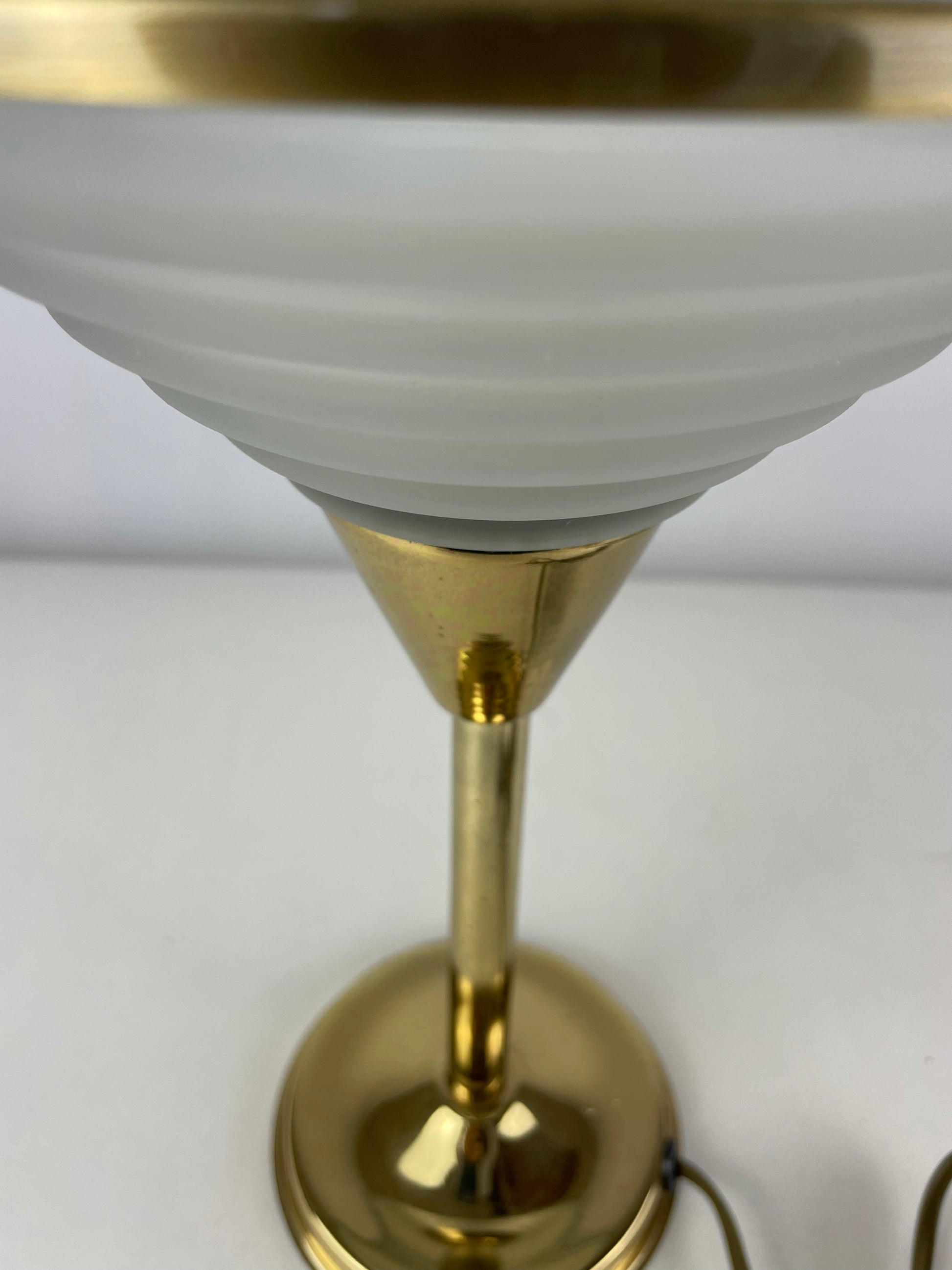 Prachtig mooi sfeerlampje uit de jaren ´70. Gemaakt van messing met een transparante kap met een ribbel design. De lamp heeft een ronde voet met een ranke standaard. Het sierlijke lampenkapje is boven open waardoor het licht subtiel wordt verspreid. Het snoer is voorzien van een schakelaar. Het lampje is in een mooie vintage staat met de gebruikelijke gebruikssporen die horen bij een lampje van deze leeftijd..
