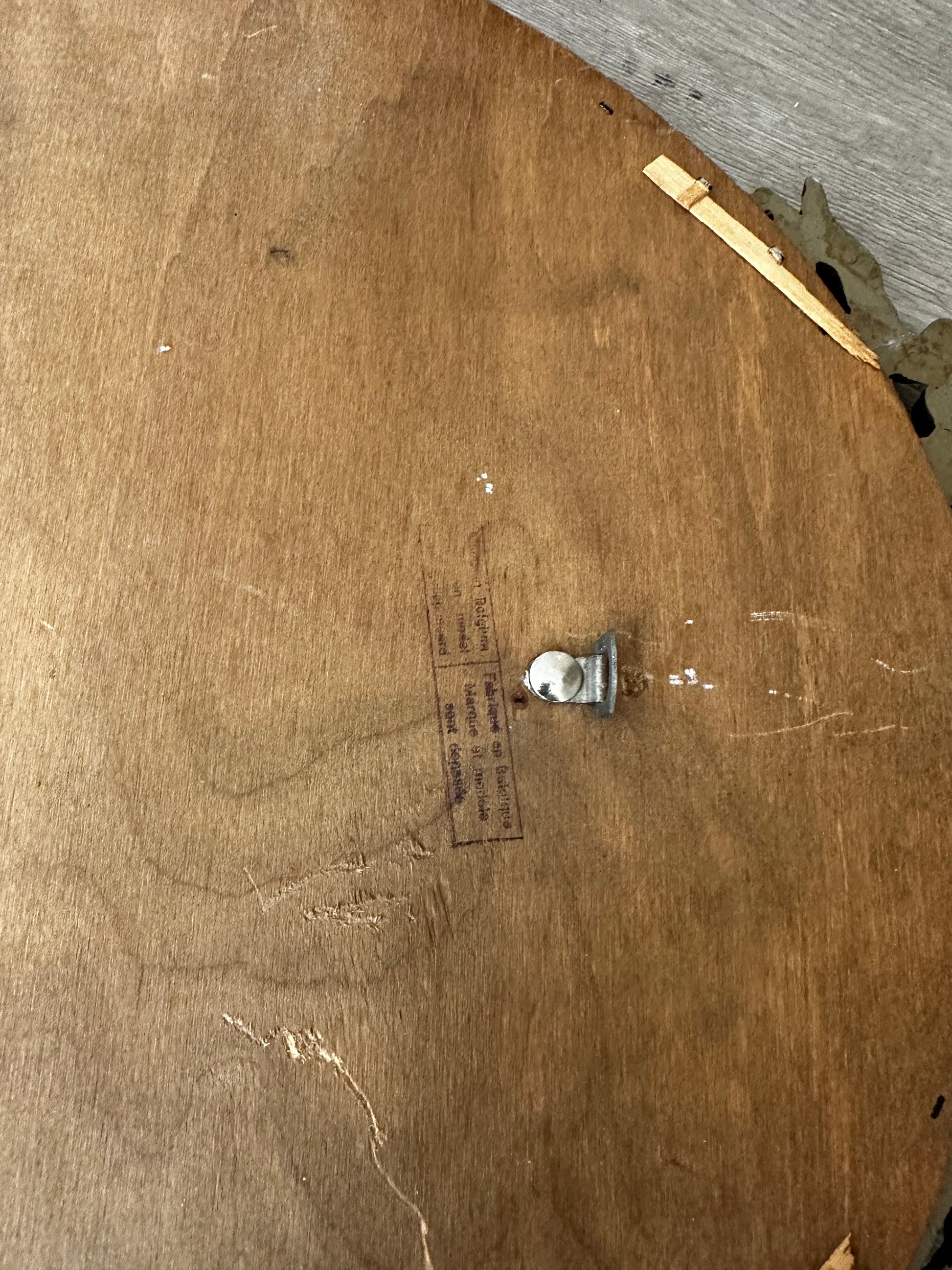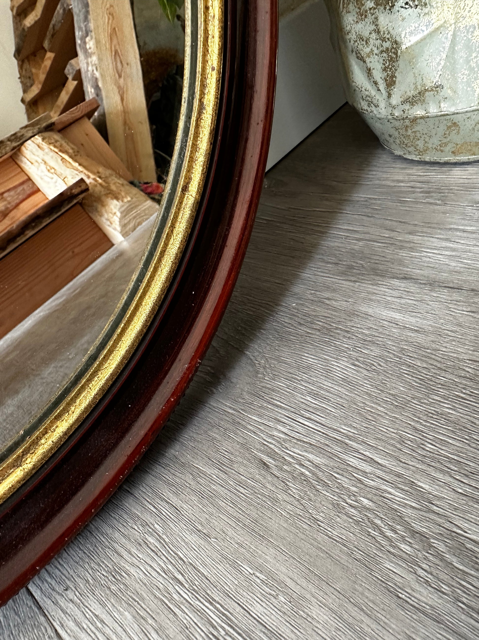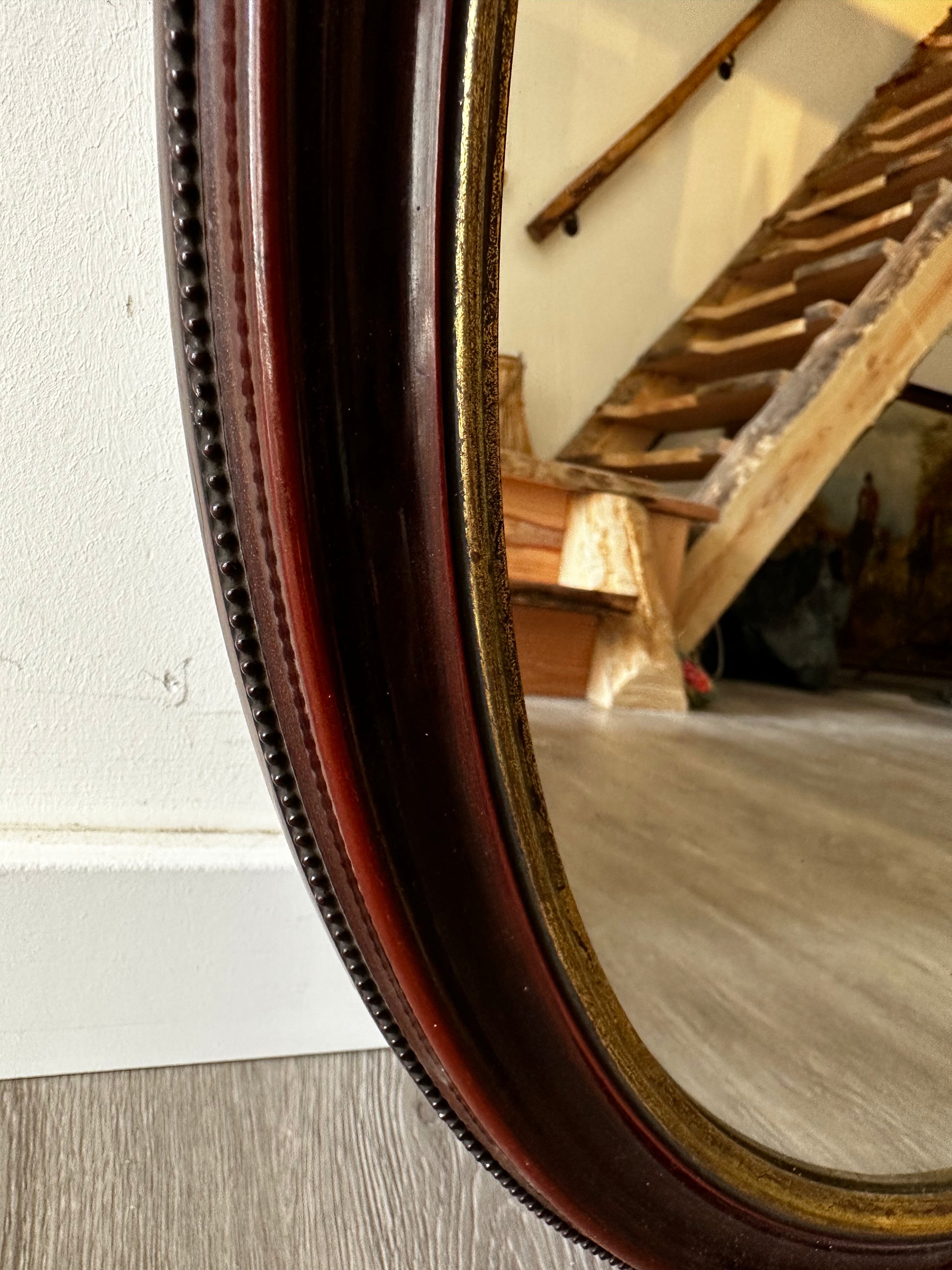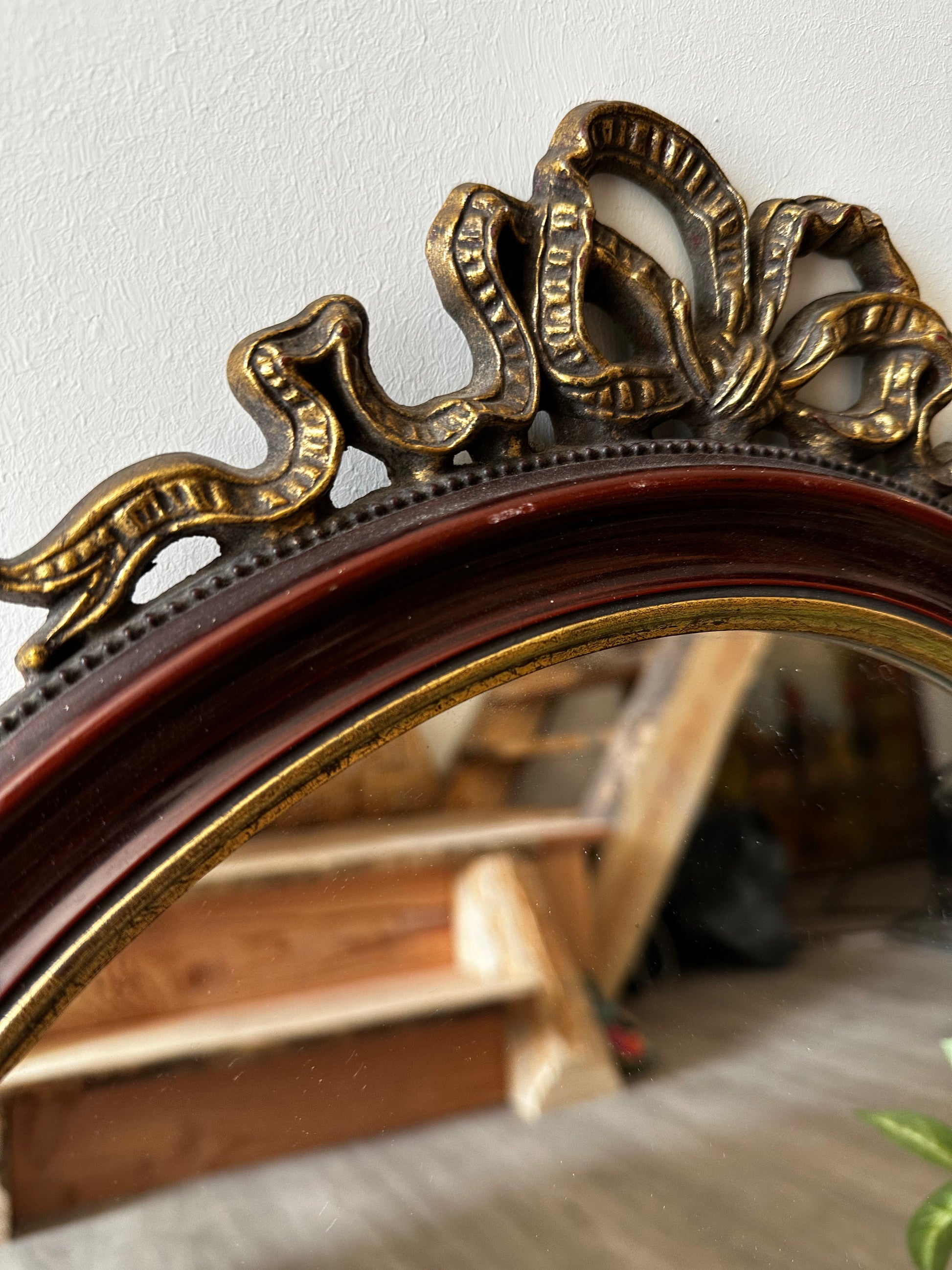 Prachtige ovale spiegel. Goudkleurige rand met rood kleurig hout. De spiegel heeft een goudkleurig ornament boven. Op te hangen met een oog op de achterkant. De spiegel is afkomstig uit Belgie, gemerkt achter, en dateert rond de jaren ‘60. De spiegel is in en prachtige vintage staat.
