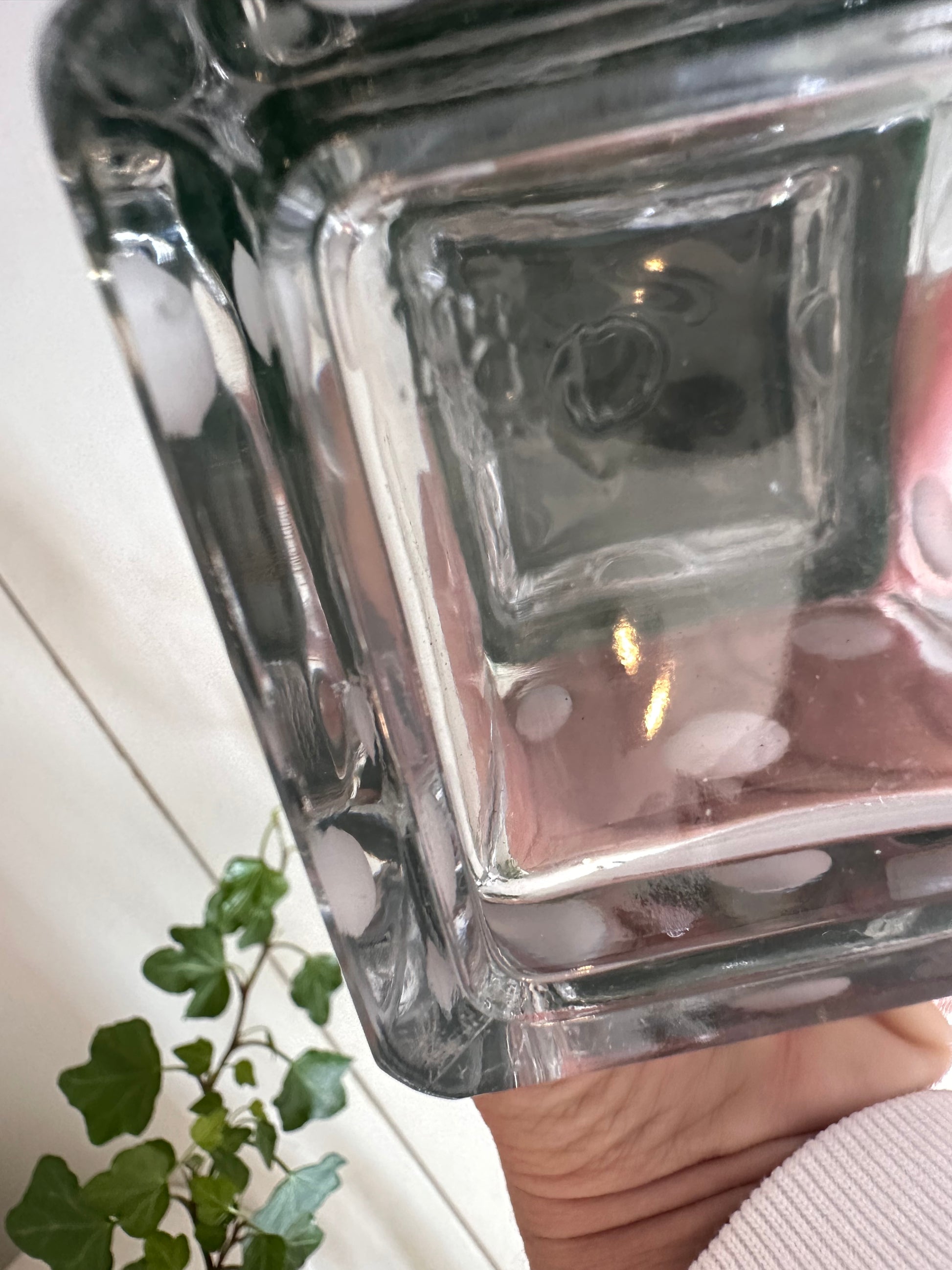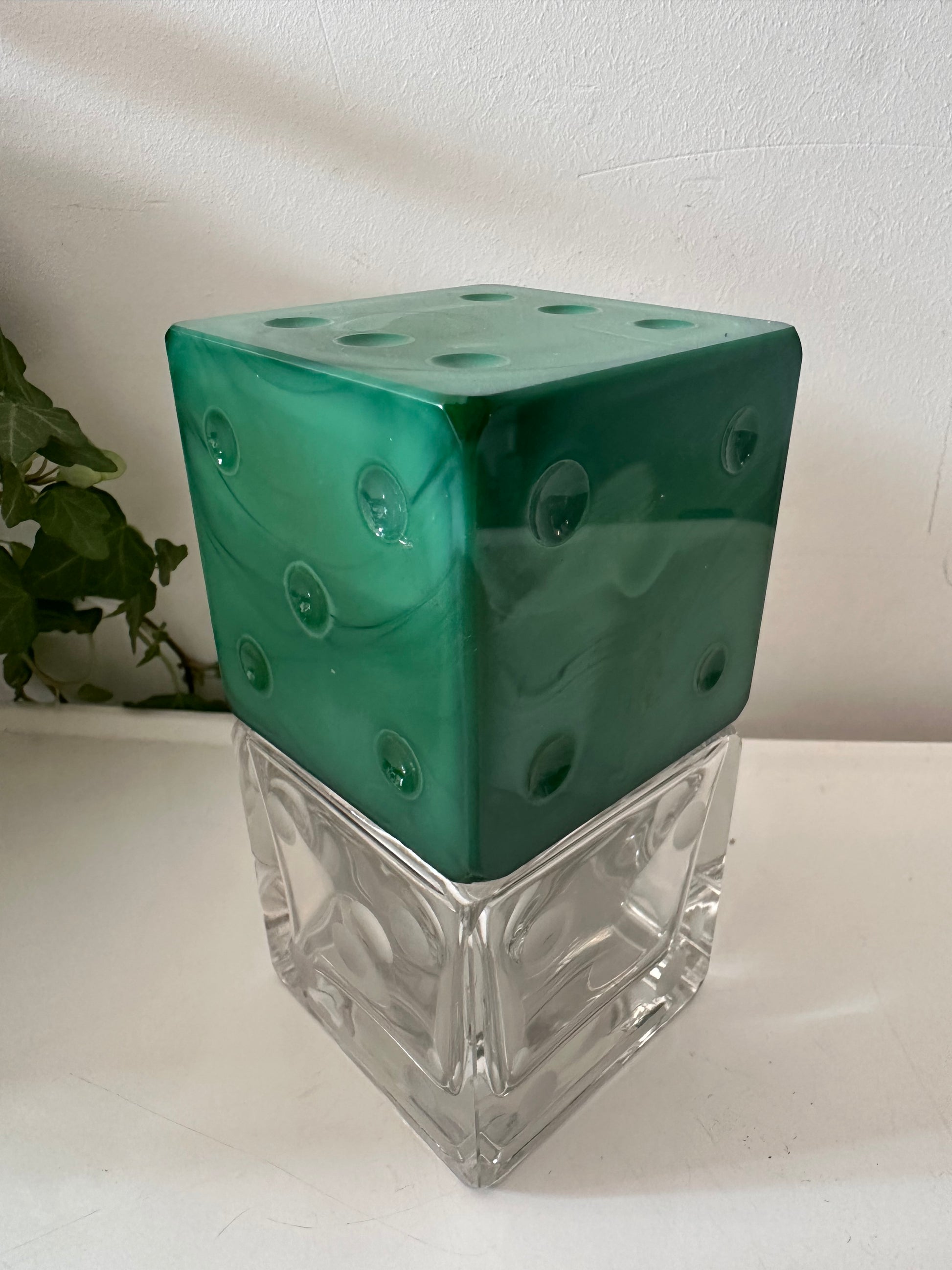 Hoe gaaf is dit? Een vintage parfumfles in de vorm van een dobbelsteen, gemaakt van helder kristalglas met een malachietgroene glazen dop. Dit soort stukken werden in de tweede helft van de 20e eeuw in Tsjechië geproduceerd, mogelijk van Moser Karlsbad, een beroemde Boheemse glasfabriek. Er is in de hoek een merkteken. Het ontwerp met dobbelsteenpatroon maakt ‘m echt een opvallend stukje glaswerk met een knipoog. Q378