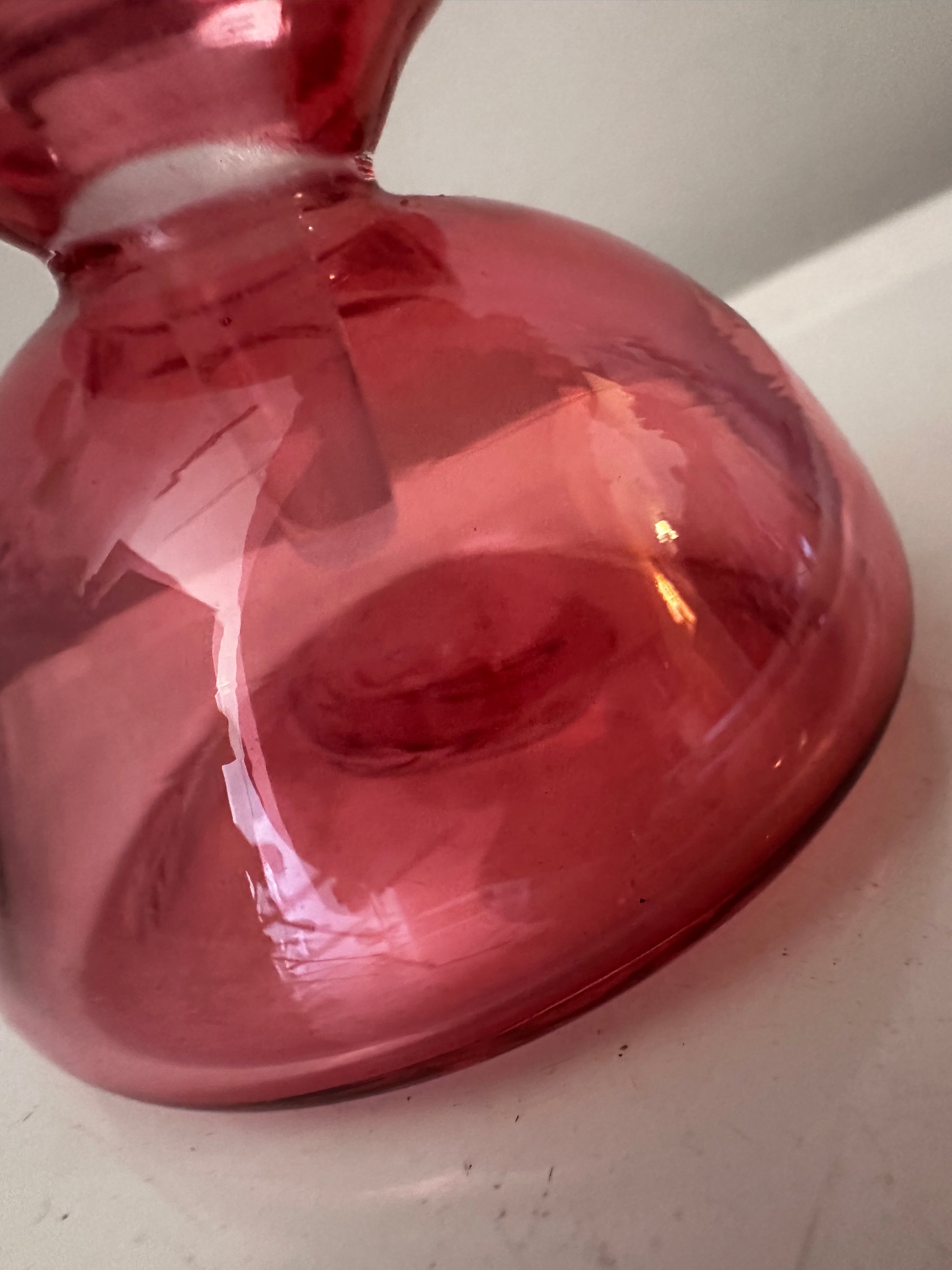Hoe mooi is deze?! Vintage parfumflesje met een helderroze body en een dikke, glazen bolstop. Perfect voor op een dressoir of in een vitrinekast.