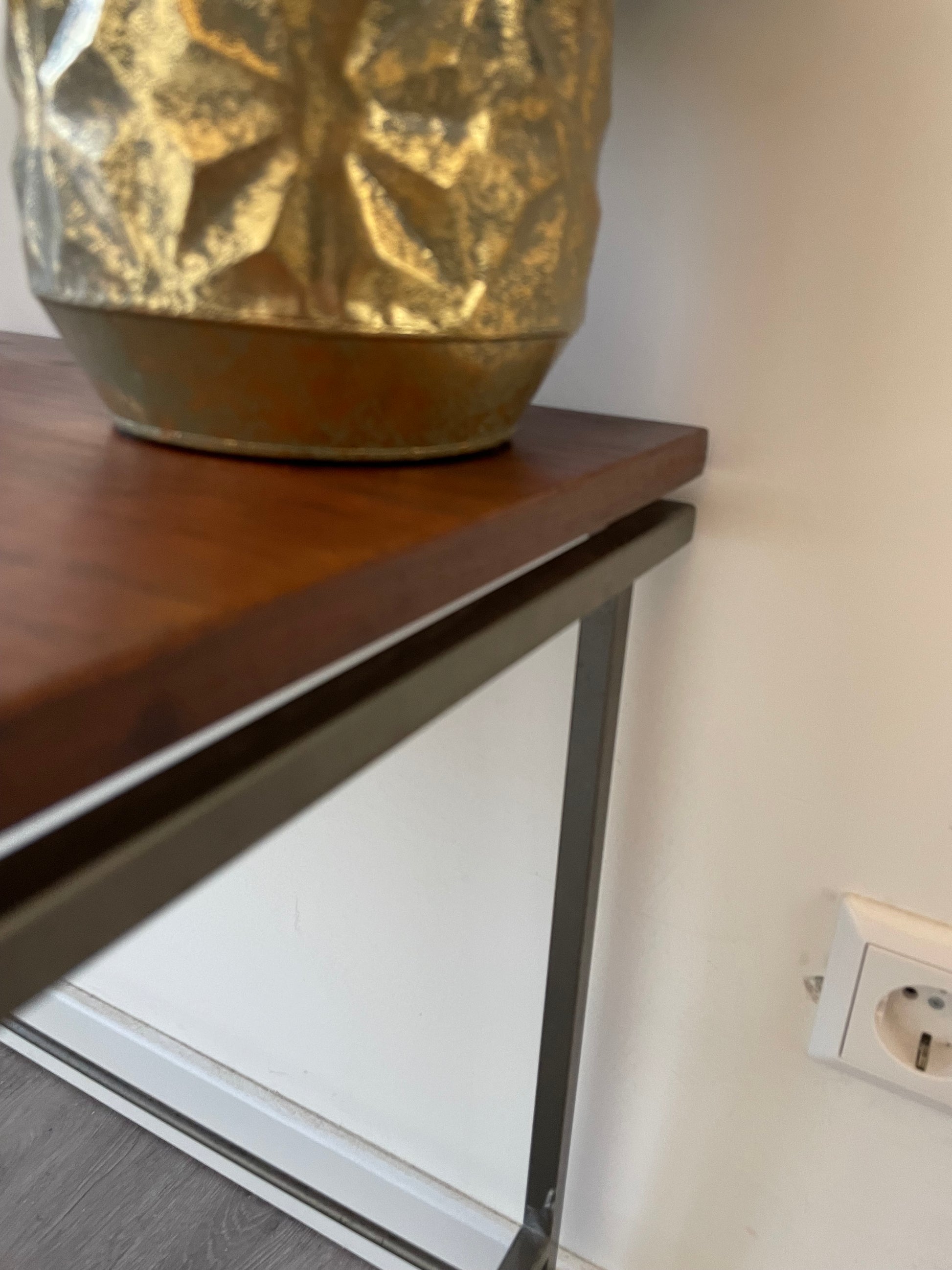 Een stoere metalen vintage bijzettafel in pastoe stijl. De tafel komt uit Duitsland uit de jaren ‘60. De tafel heeft een mooi “zwevend” blad en bestaat uit een stalen frame met gefineerd blad.