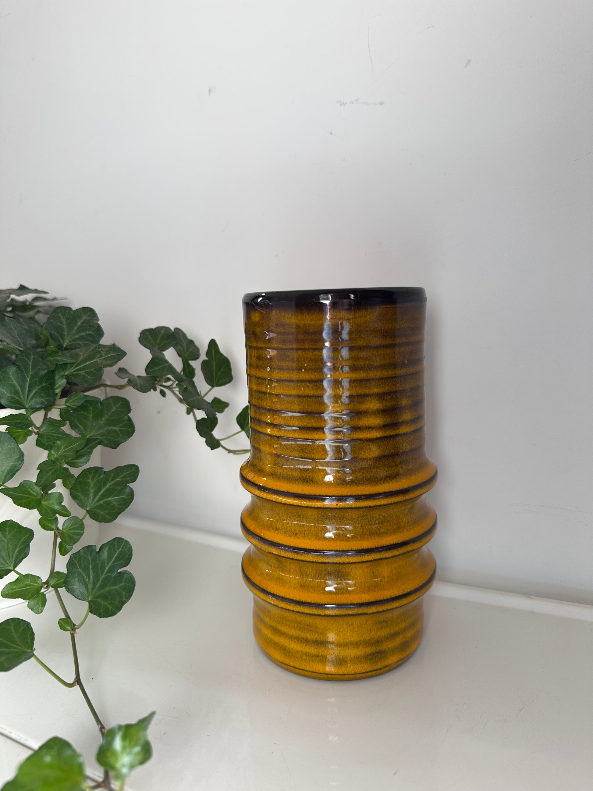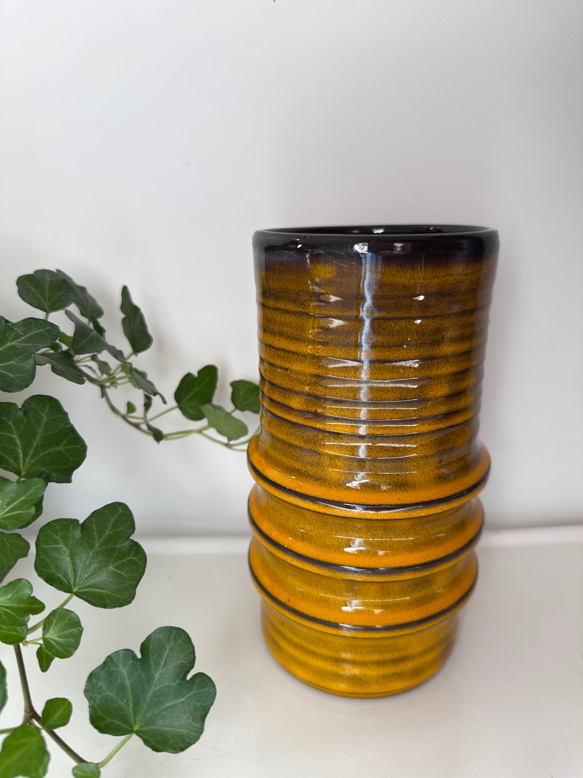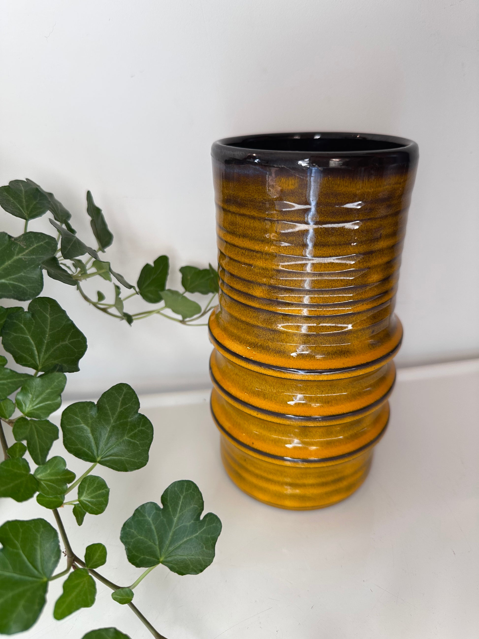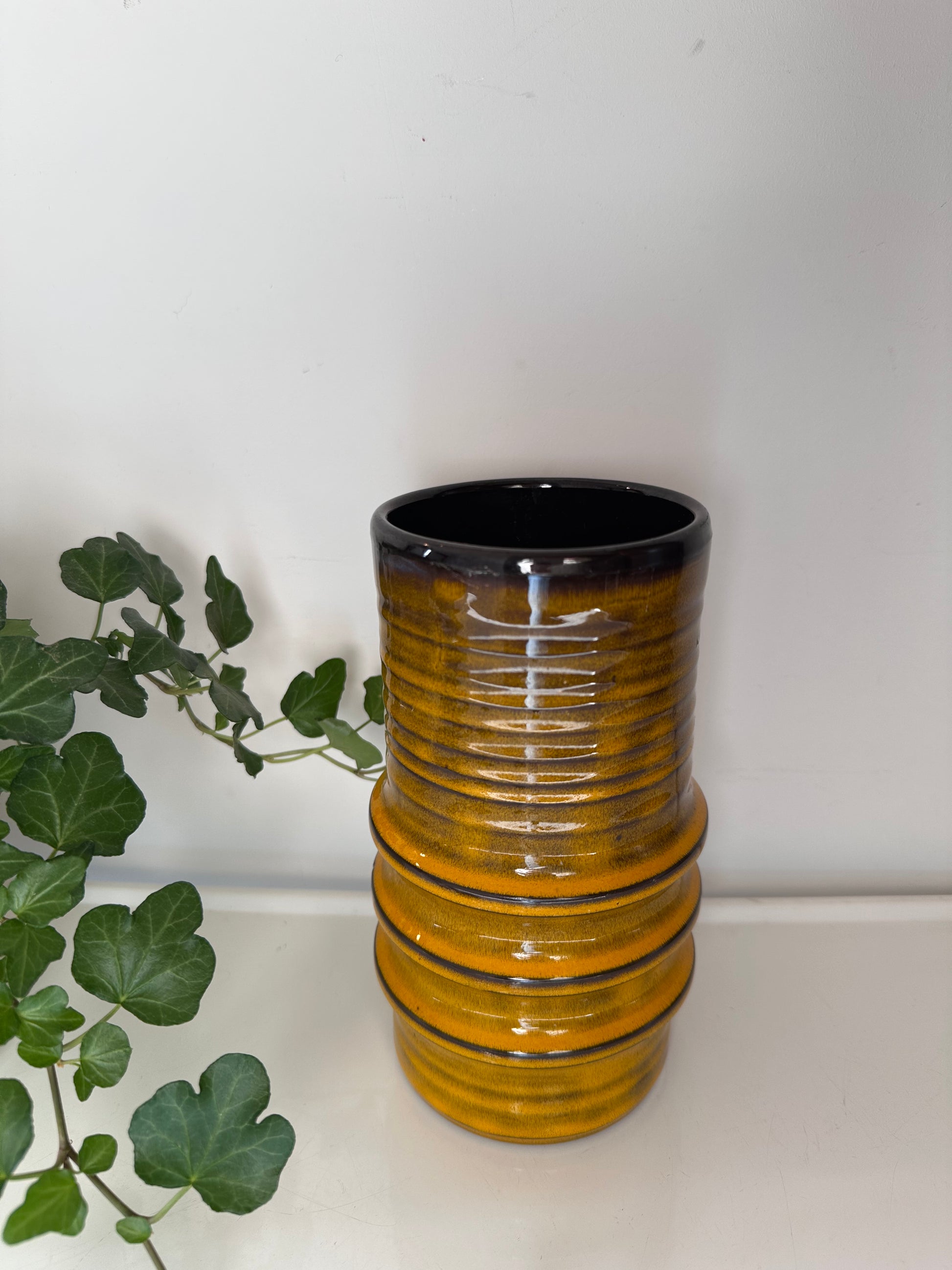 Een supermooie keramieken vaas. Heeft een gele kleur met zwarte accenten. Dateert jaren 70 en is afkomstig uit Duitsland. Mooi lijnen design.