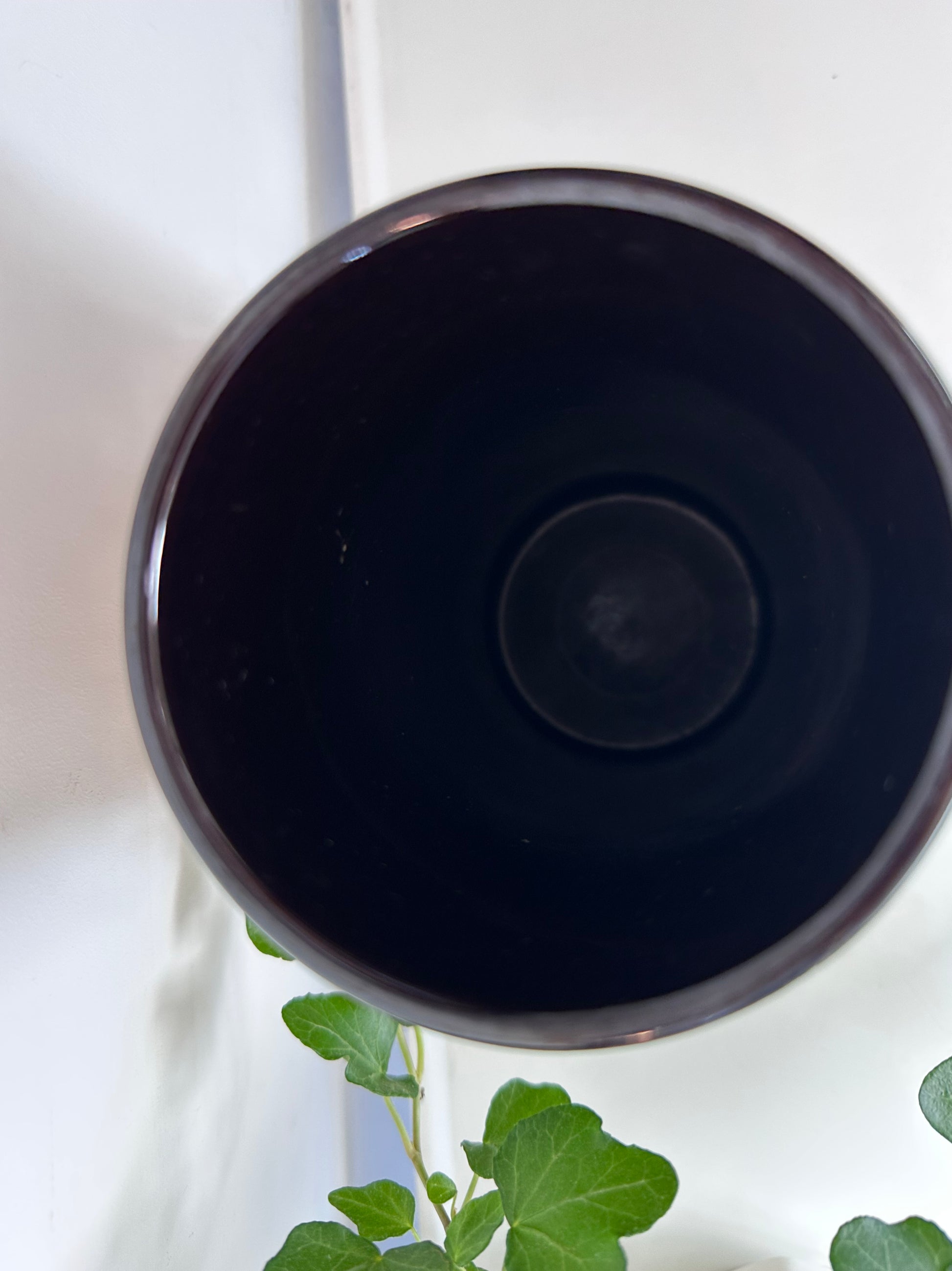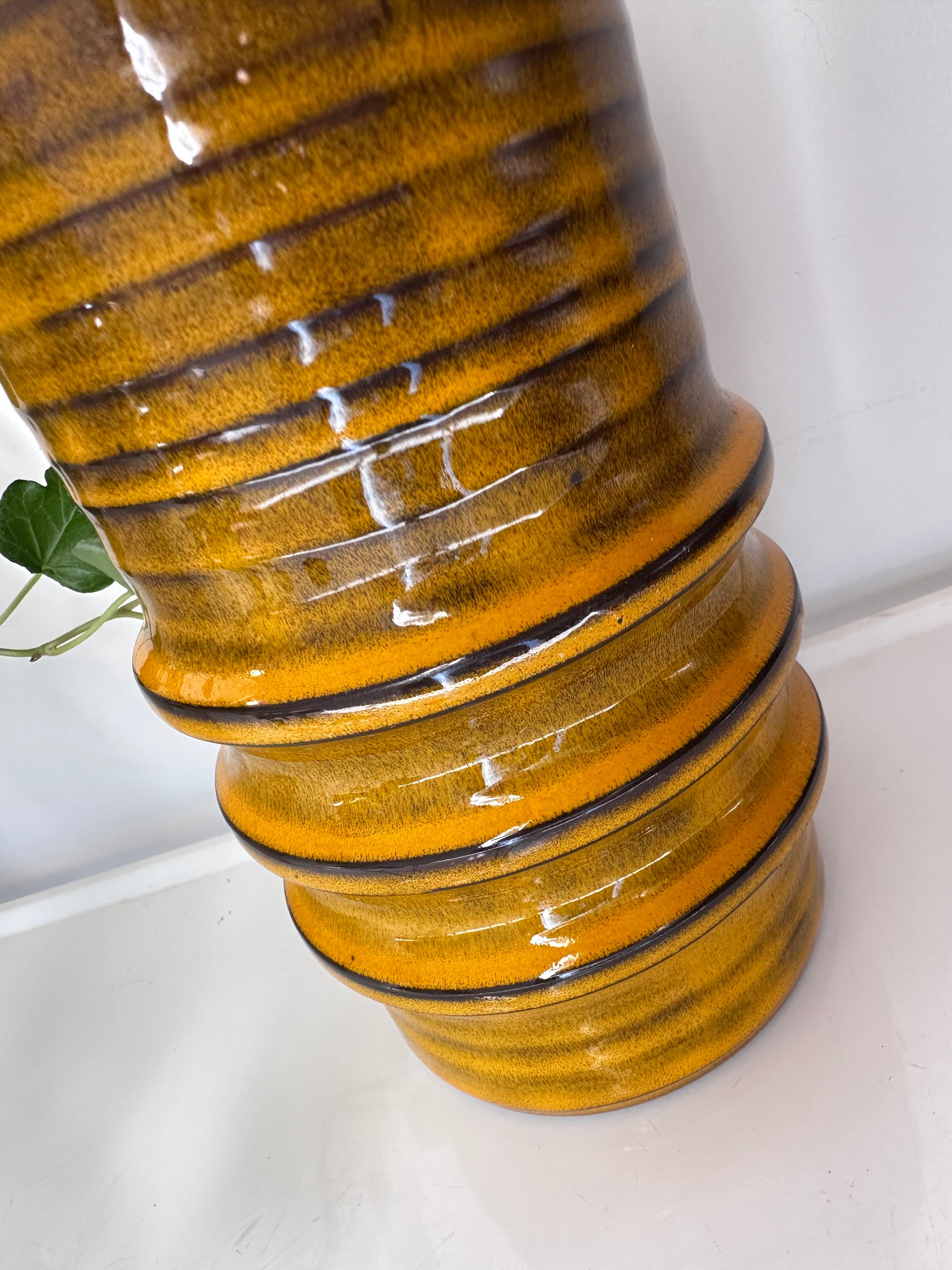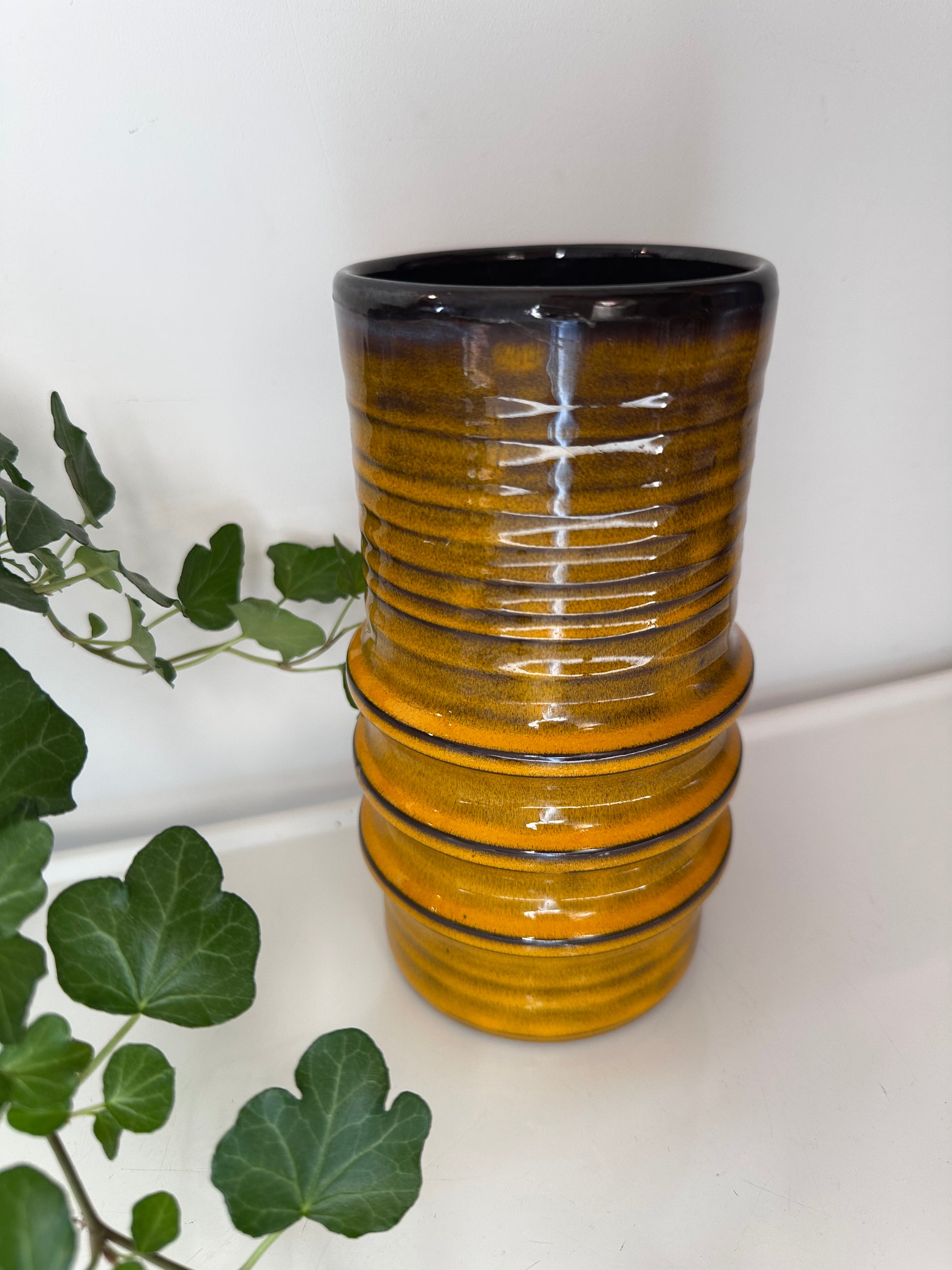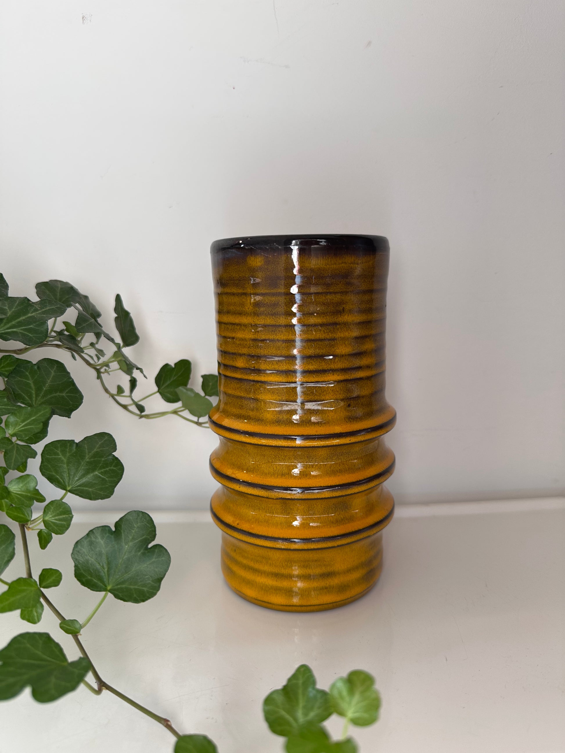Een supermooie keramieken vaas. Heeft een gele kleur met zwarte accenten. Dateert jaren 70 en is afkomstig uit Duitsland. Mooi lijnen design.