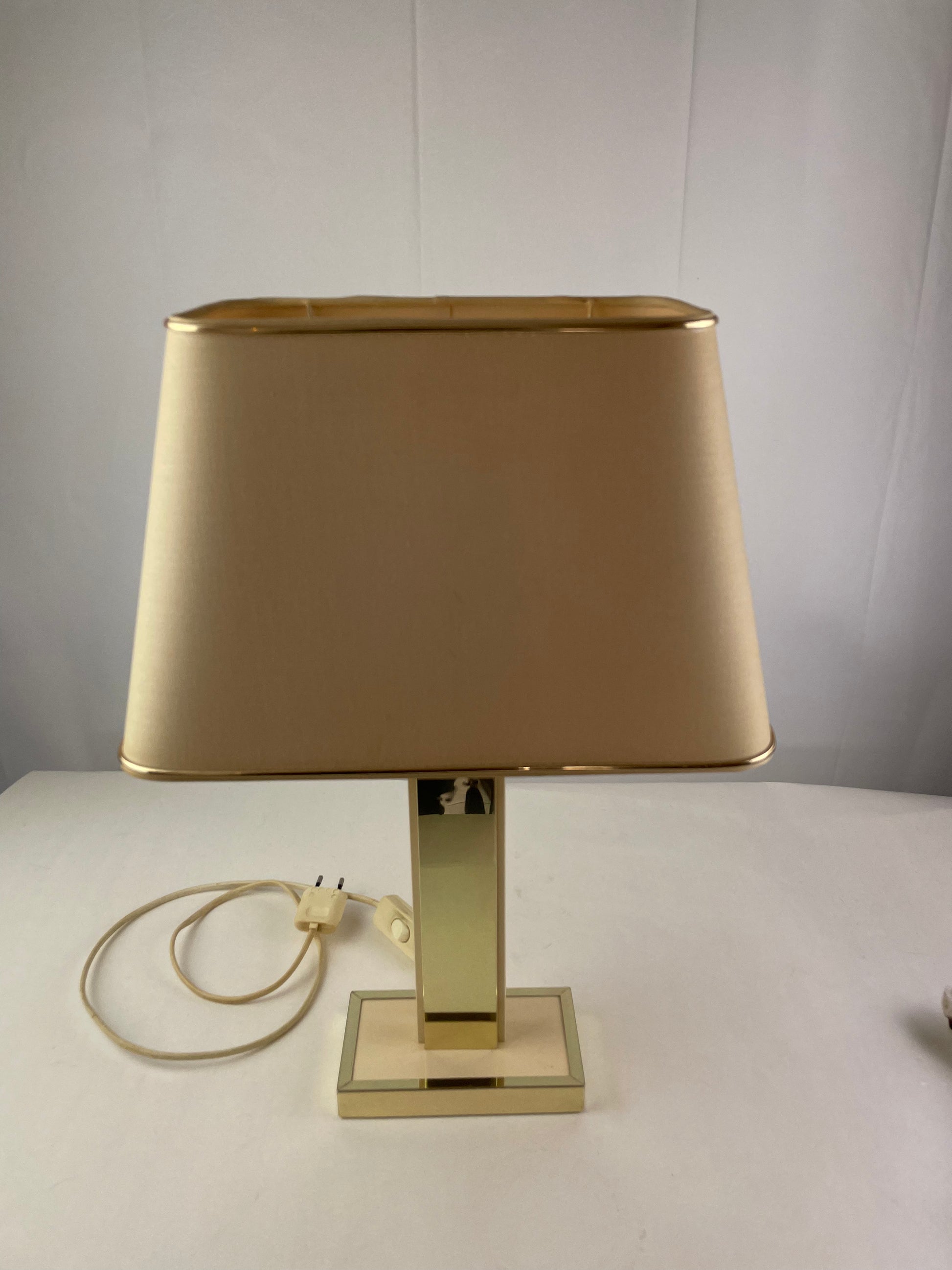 Prachtige Hollywood Regency lamp van het Franse designbedrijf Robert de Schuytener. De lamp is gefabriceerd rond de jaren ‘70. Gemerkt met een label op de fitting en onder. De voet is spiegelend goudkleurig met roomwit. De kap is roomwit met een goudkleurige omlijsting. Met originele stekker.