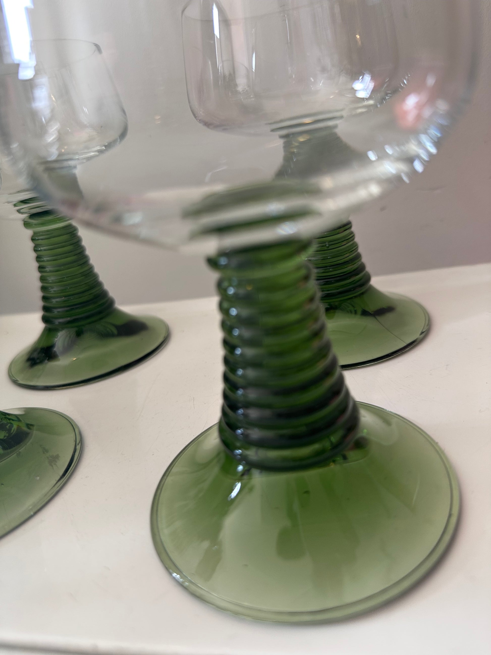 Toffe set Roemer glazen met die herkenbare groene voet en gedraaide steel — helemaal jaren 70. Lekker stevig glas, ideaal voor wijn of een ander drankje. In mooie vintage staat, klaar voor gebruik. Inhoud 0,2 ltr. Afmetingen hoog ca 13 cm breed ca 8 cm.