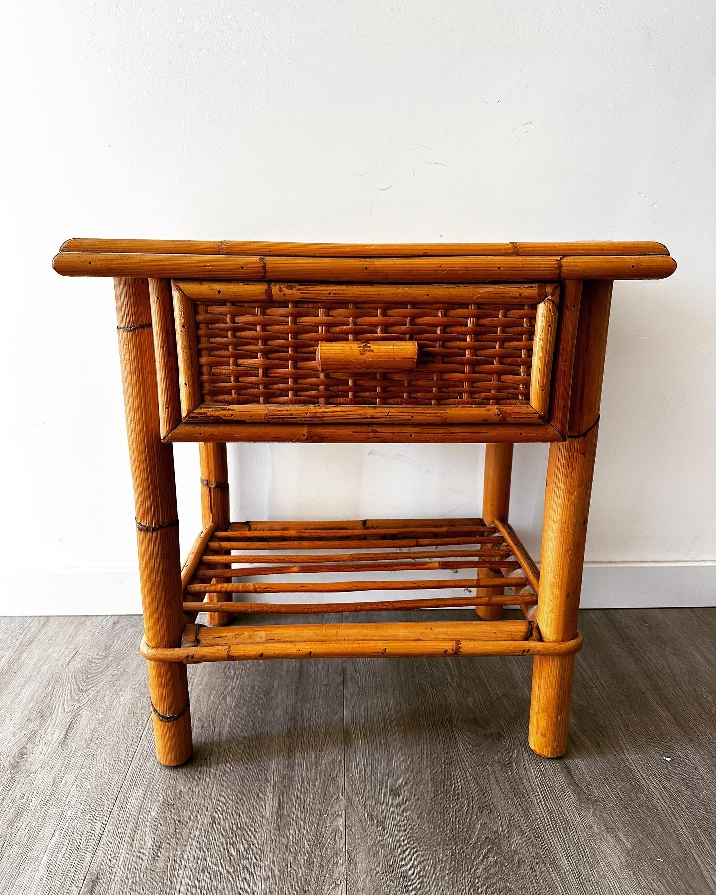 Een heel mooi vintage bijzettafeltje van rotan. Het tafeltje heeft een laatje voor. Onder is nog een rotan plankje. Dit vintage tafeltje is afkomstig uit Frankrijk en is in een hele mooie vintage staat. Het is een stevig tafeltje, zwaar en robuust model. Afmetingen hoog 55 cm breed 49 cm diep 35 cm