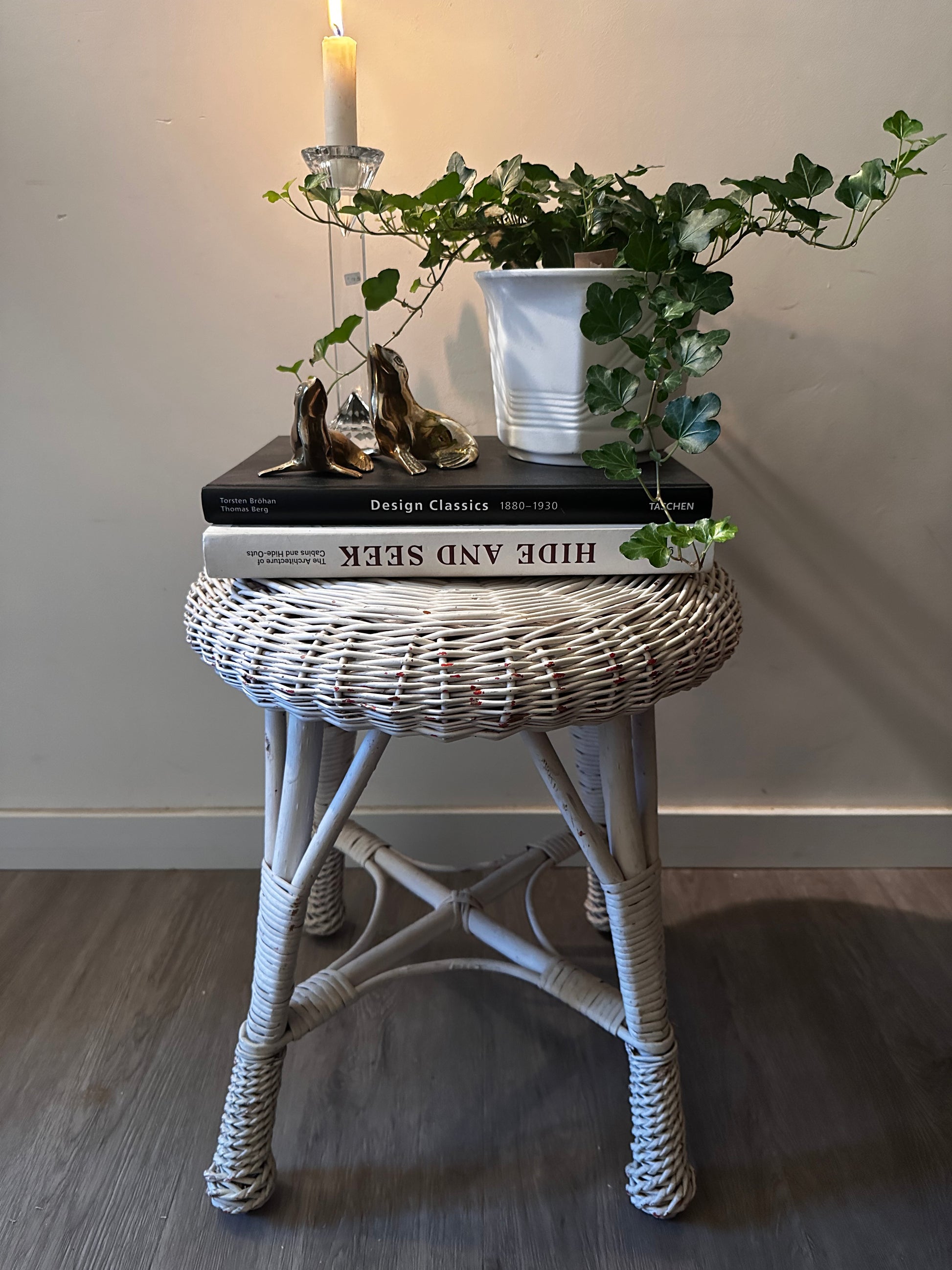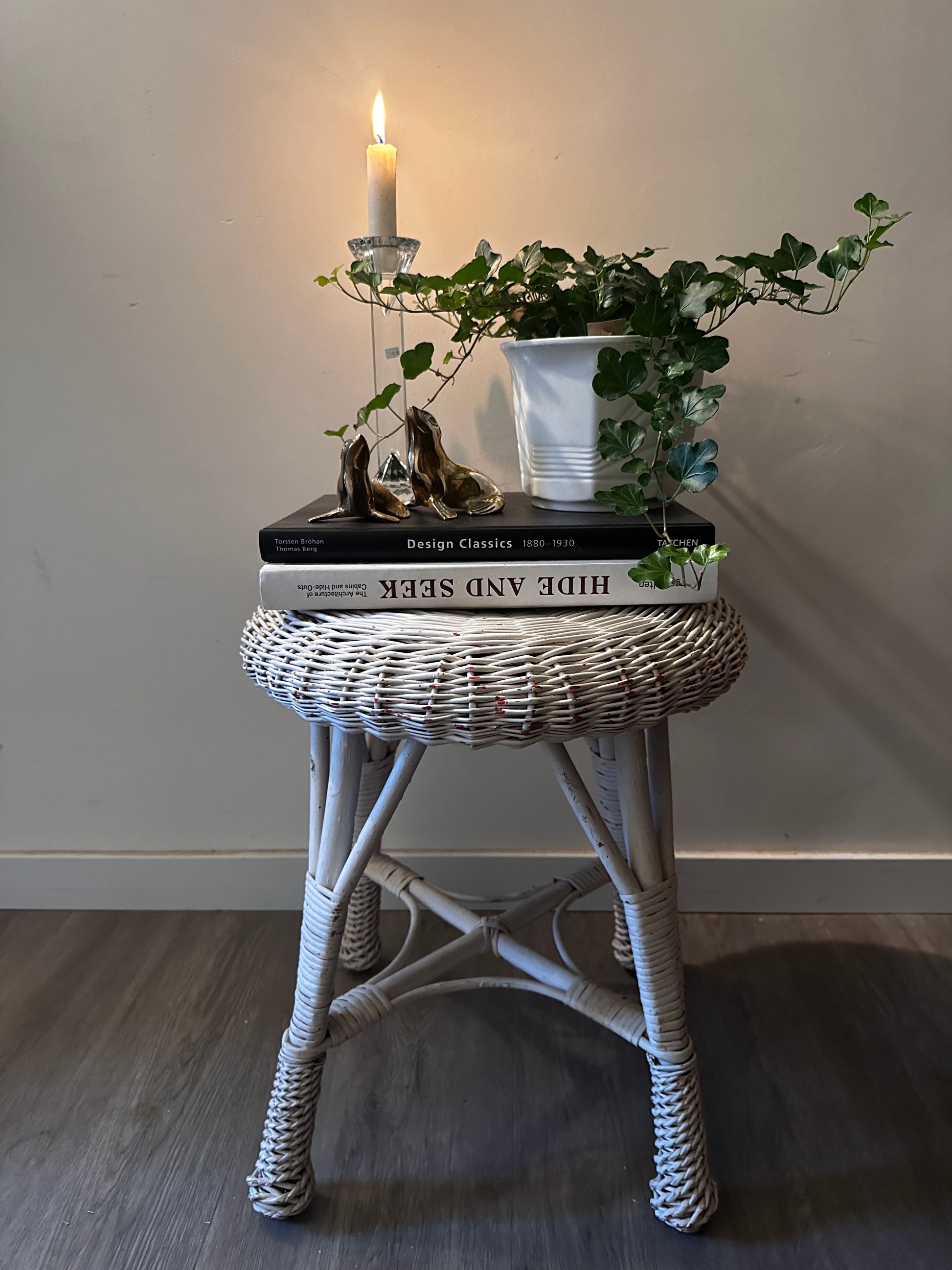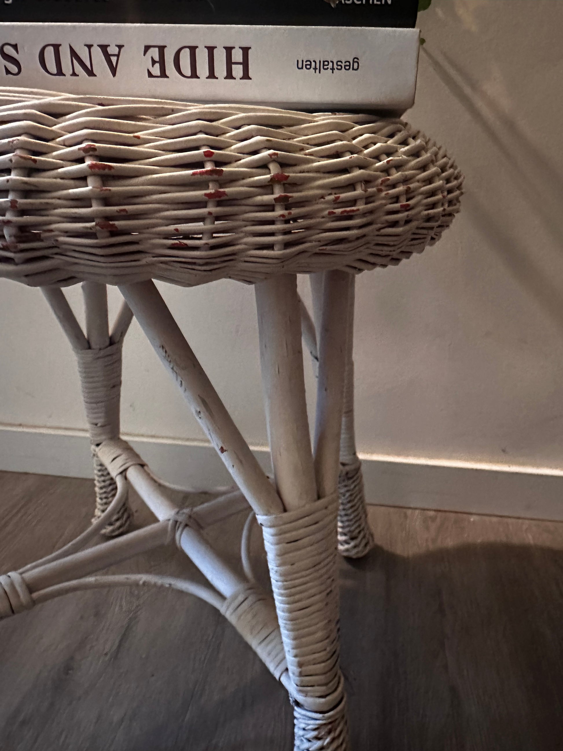 Dit is toch een te leuk krukje?! Gemaakt van rotan met een witte kleur waar hier en daar een bruine kleur doorheen komt. Krukje staat op 4 pootjes en is in een mooie vintage staat. Hoog 47 cm breed 38 cm