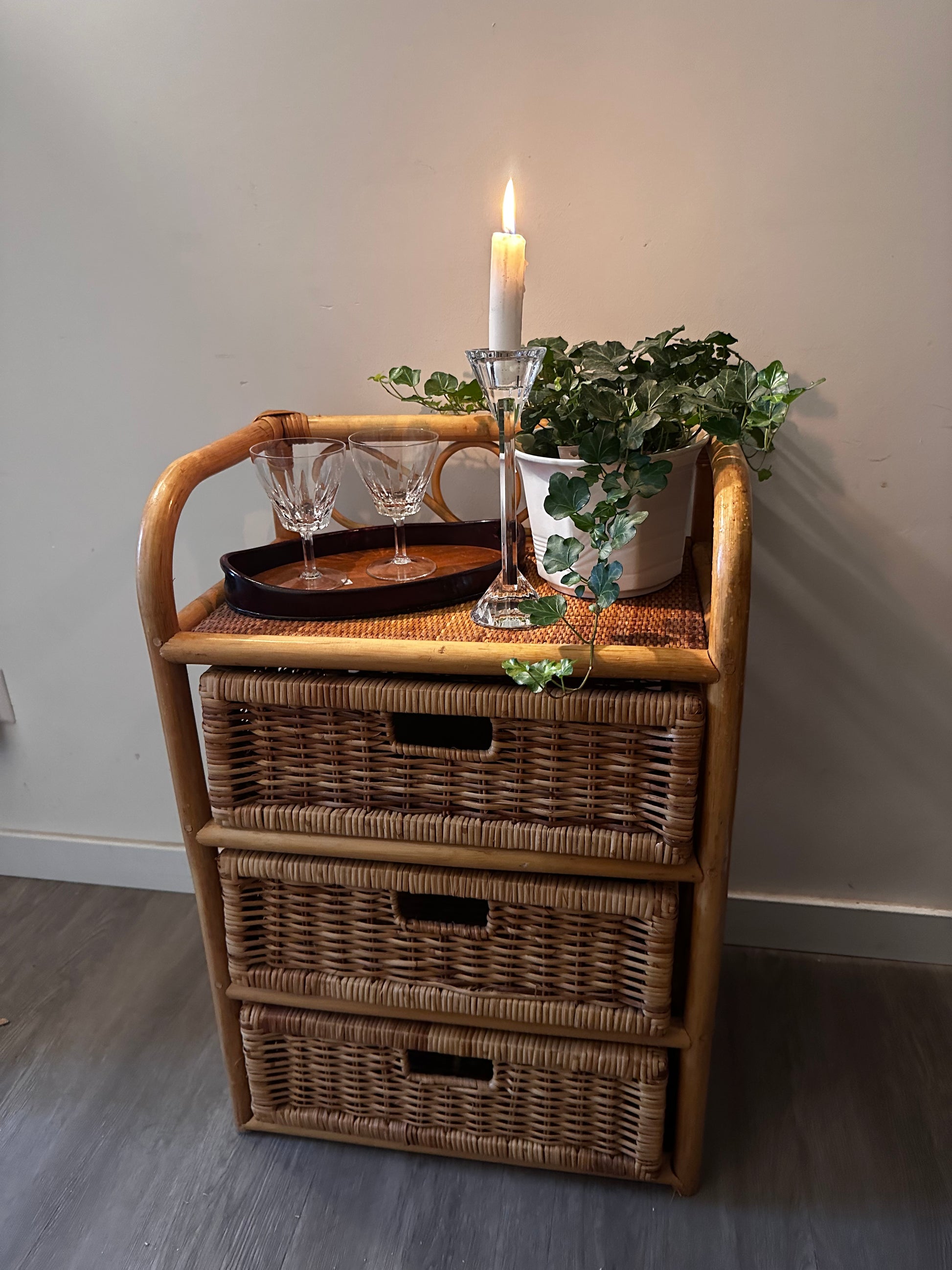 Een te gek rotan ladekastje. Het kastje het drie lades. In een mooie vintage staat. De etage boven is mooi afgewerkt met sierlijke boogjes