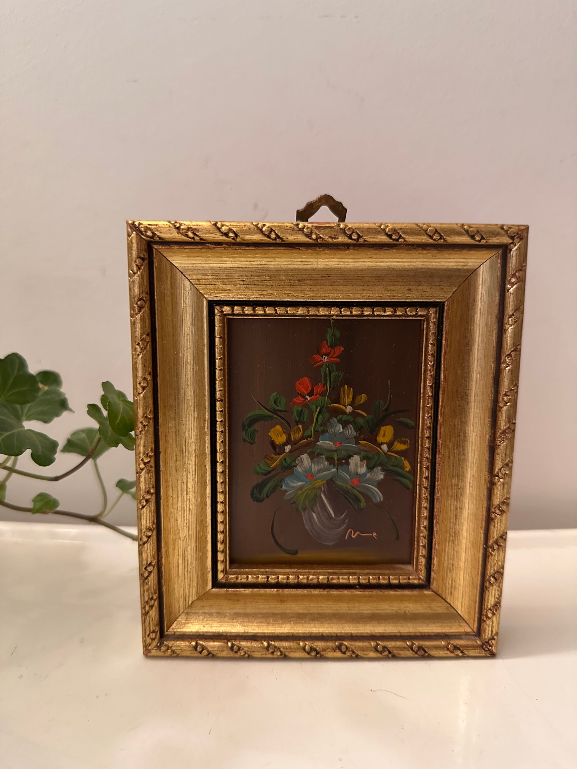 Superleuk mini schilderijtje met een kleurrijk boeketje op donkerbruine achtergrond. De penseelstreken zijn mooi gedetailleerd , en het geheel zit in een goudkleurig, sierlijk lijstje en dateert uit de jaren 60/70. Q624