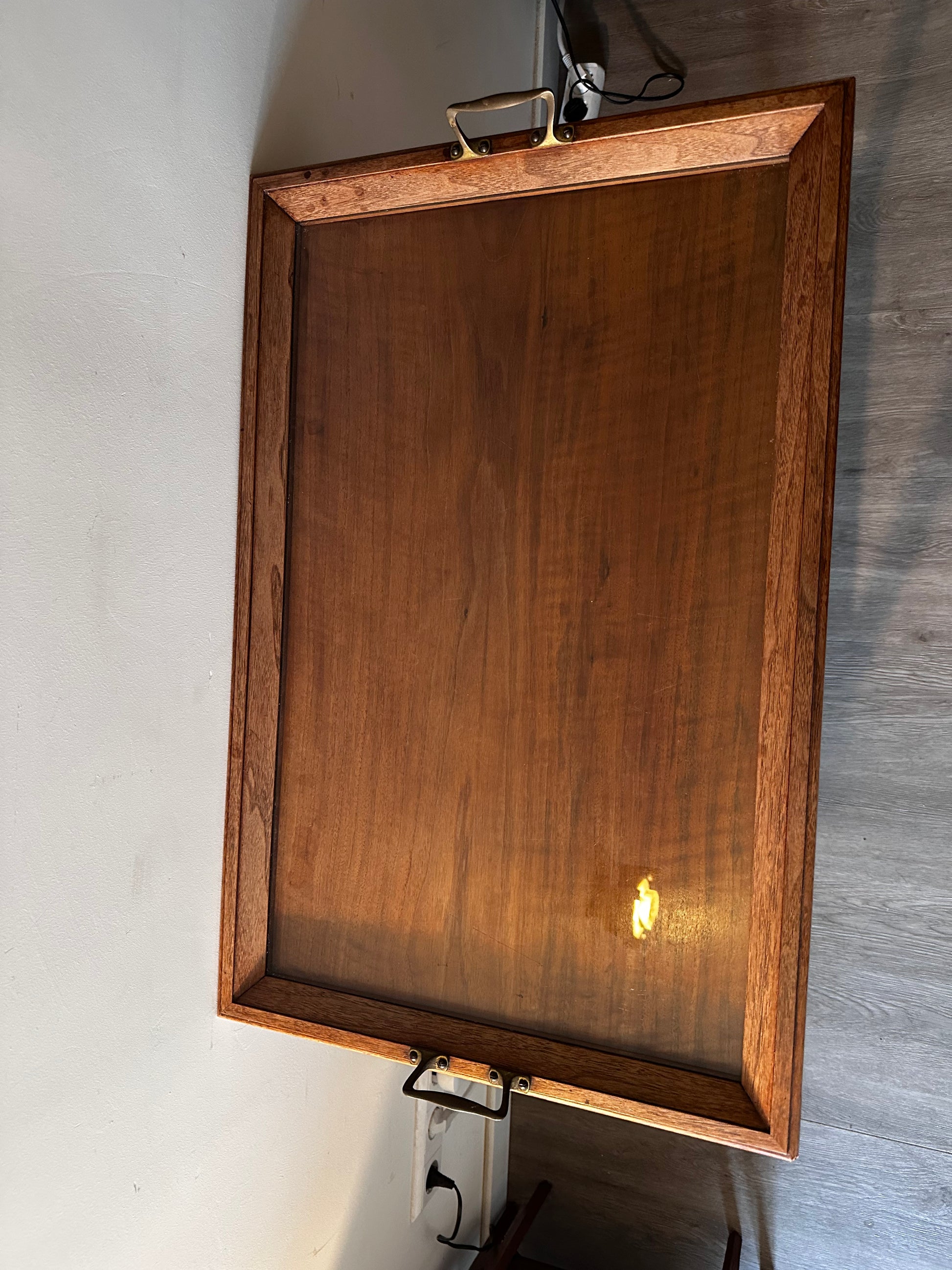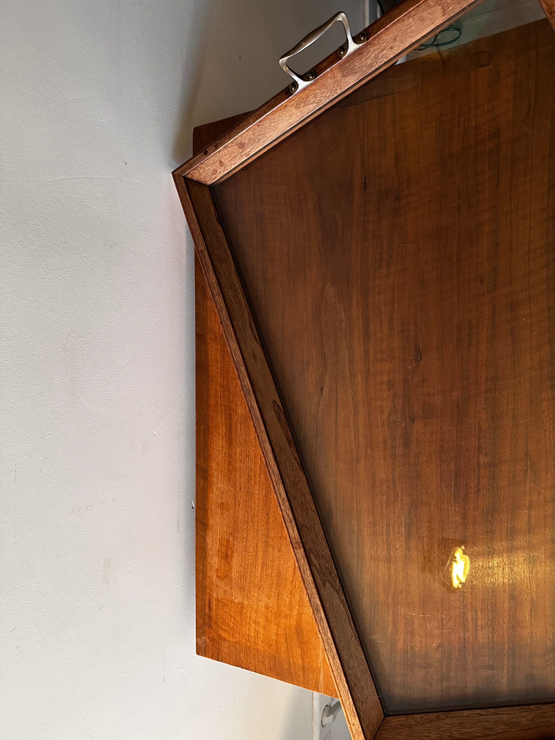 Wat een leukerd is dit. Een serveertafeltje met dienblad met glasplaat. In een mooie vintage staat. Tafeltje heeft liefdevolle sporen van gebruik. Er ligt een los dienblad op met twee koperen handgreepjes en een glazen plat. Heeft onder ook nog een plank om spulletjes op te decoren. Aan de linkerkant van het tafeltje kan je een plankje eruit trekken voor nog meer ruimte. Tafeltje is mooi vormgegeven.