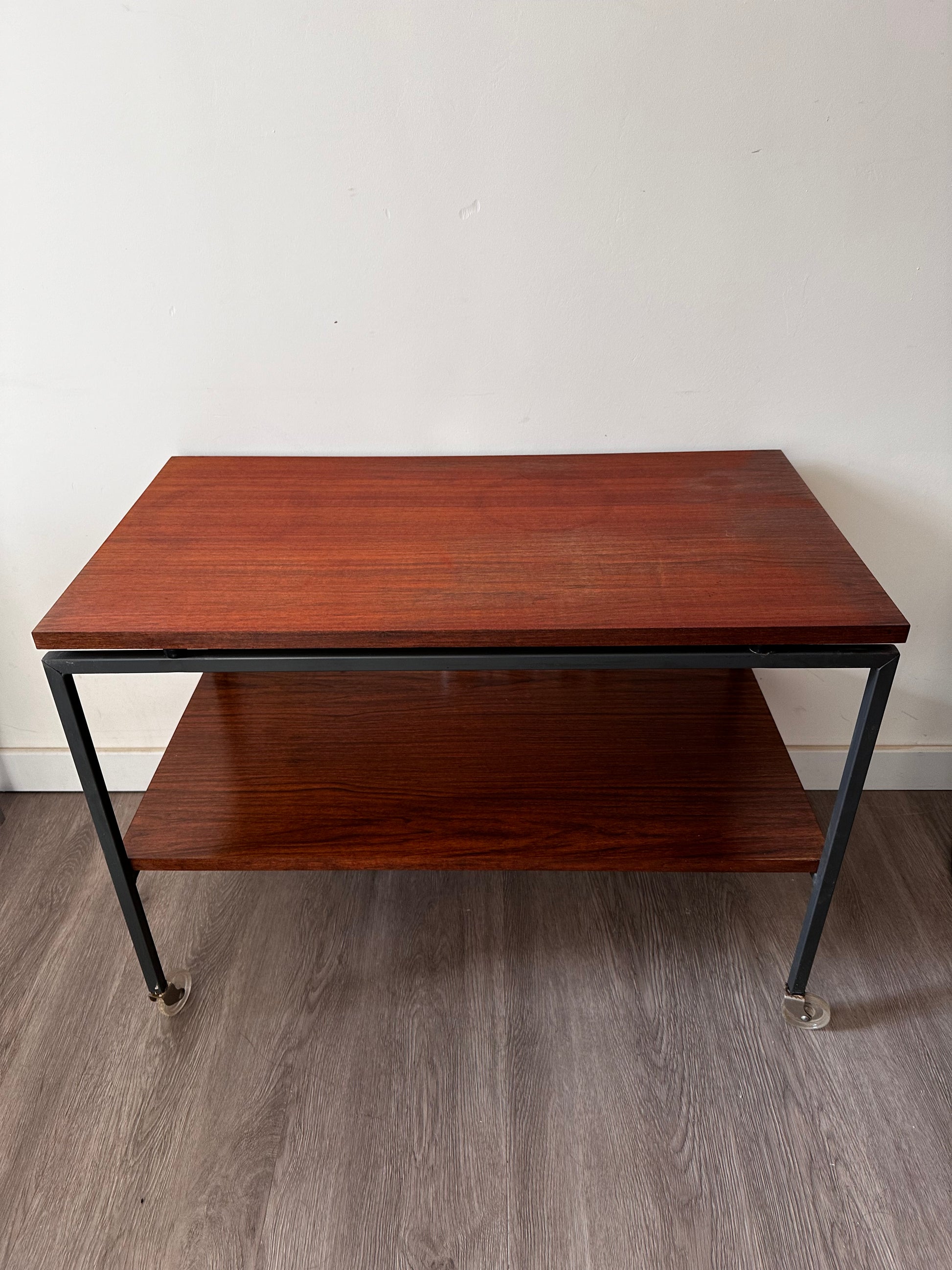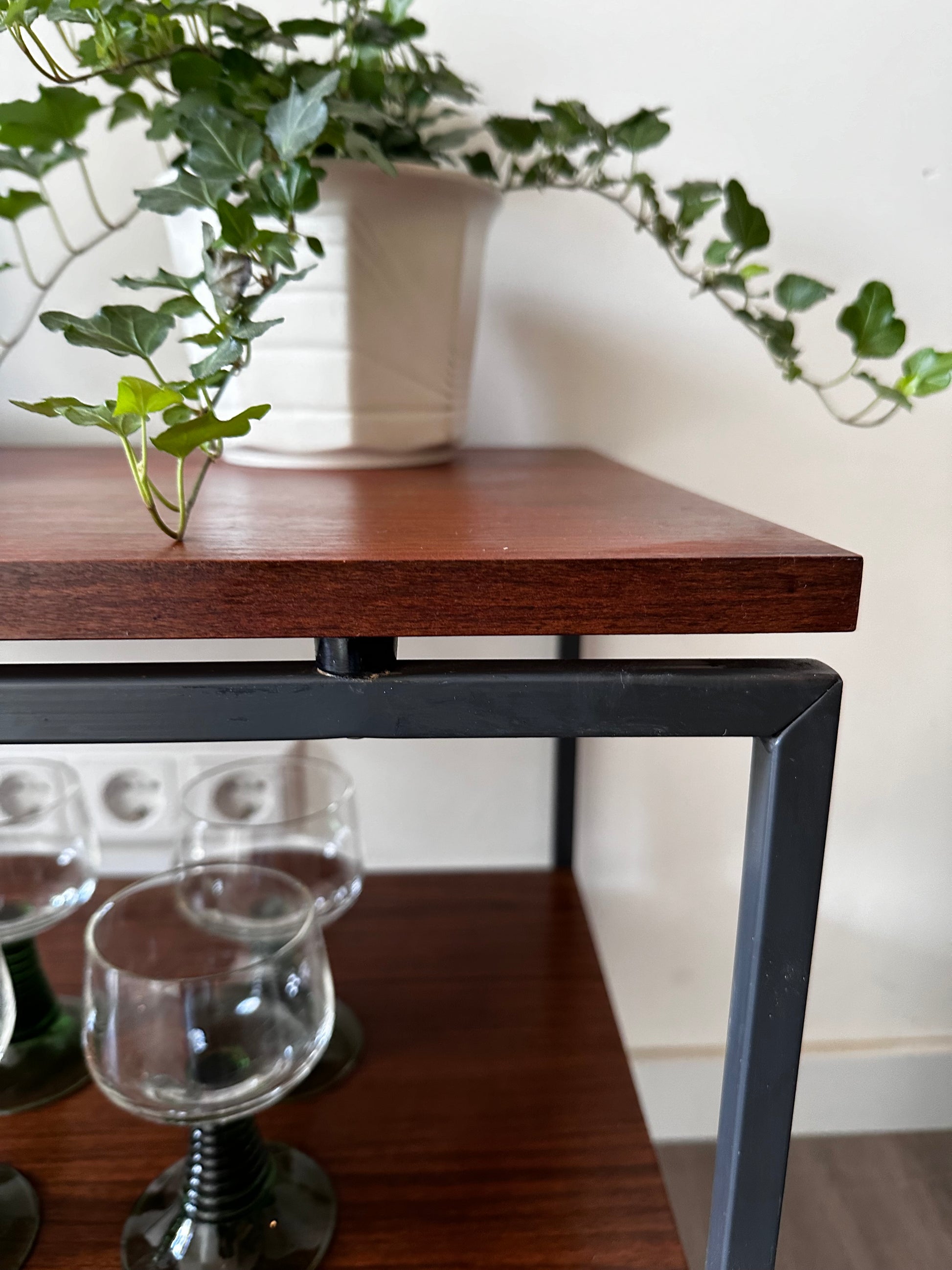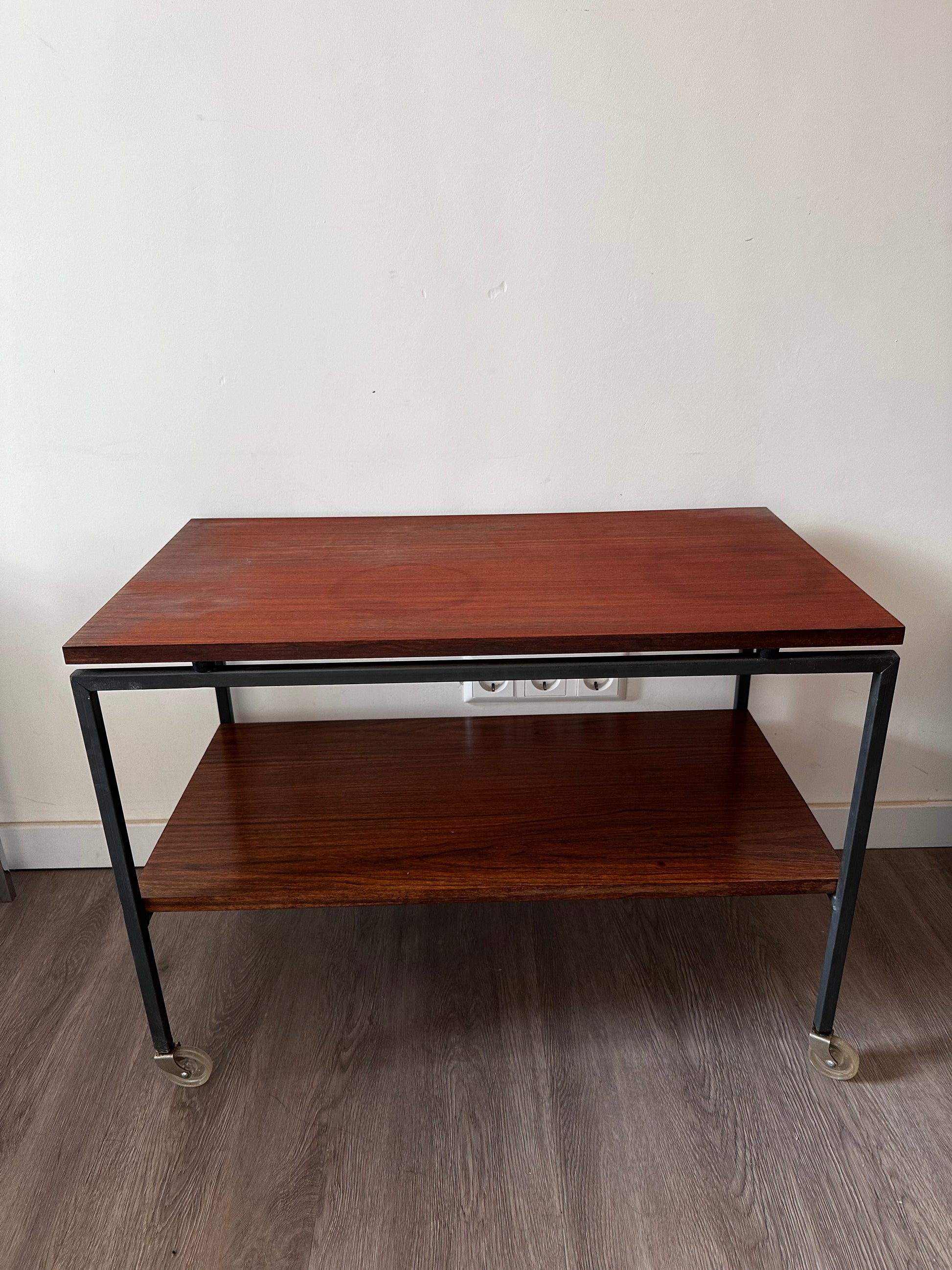 Hele gave serveerwagen, bijzettafel in de stijl van het ontwerp van Cees Braakman. Deze pastoe stijl tafel is in een mooie vintage staat met lichte liefdevolle gebruikssporen, zie fotos van het bovenblad. De tafel is voorzien van wieltjes, heeft houten bladen en een mat zwart frame. Dateert uit de jaren 60 en afkomstig uit Nederland