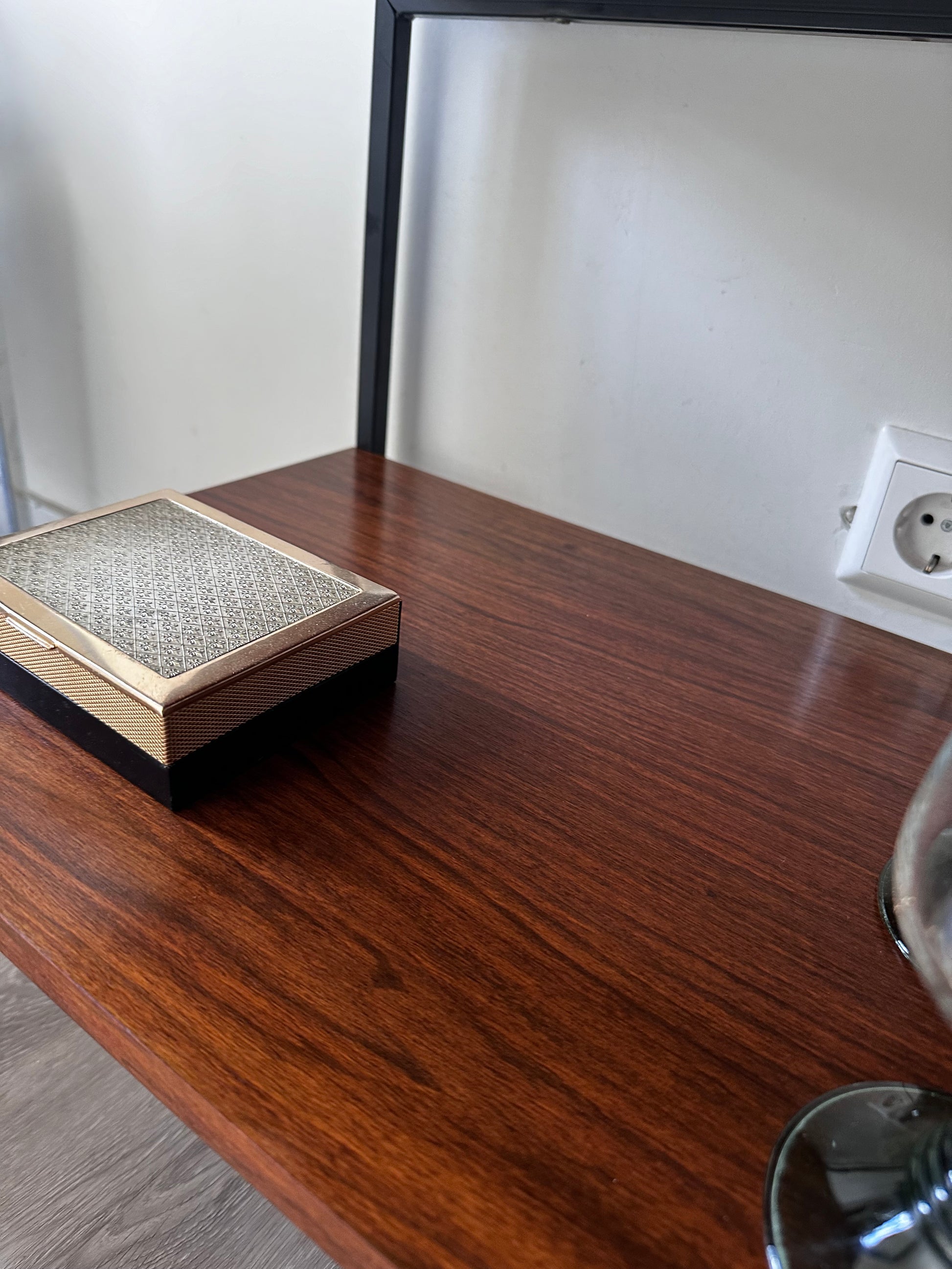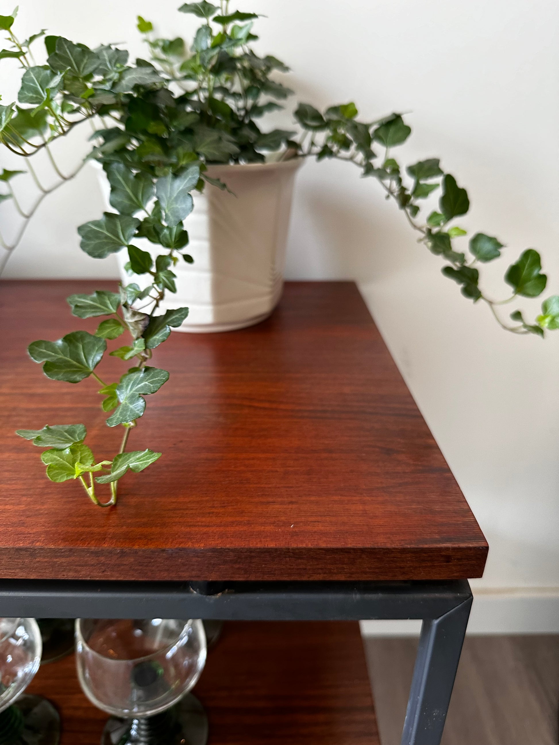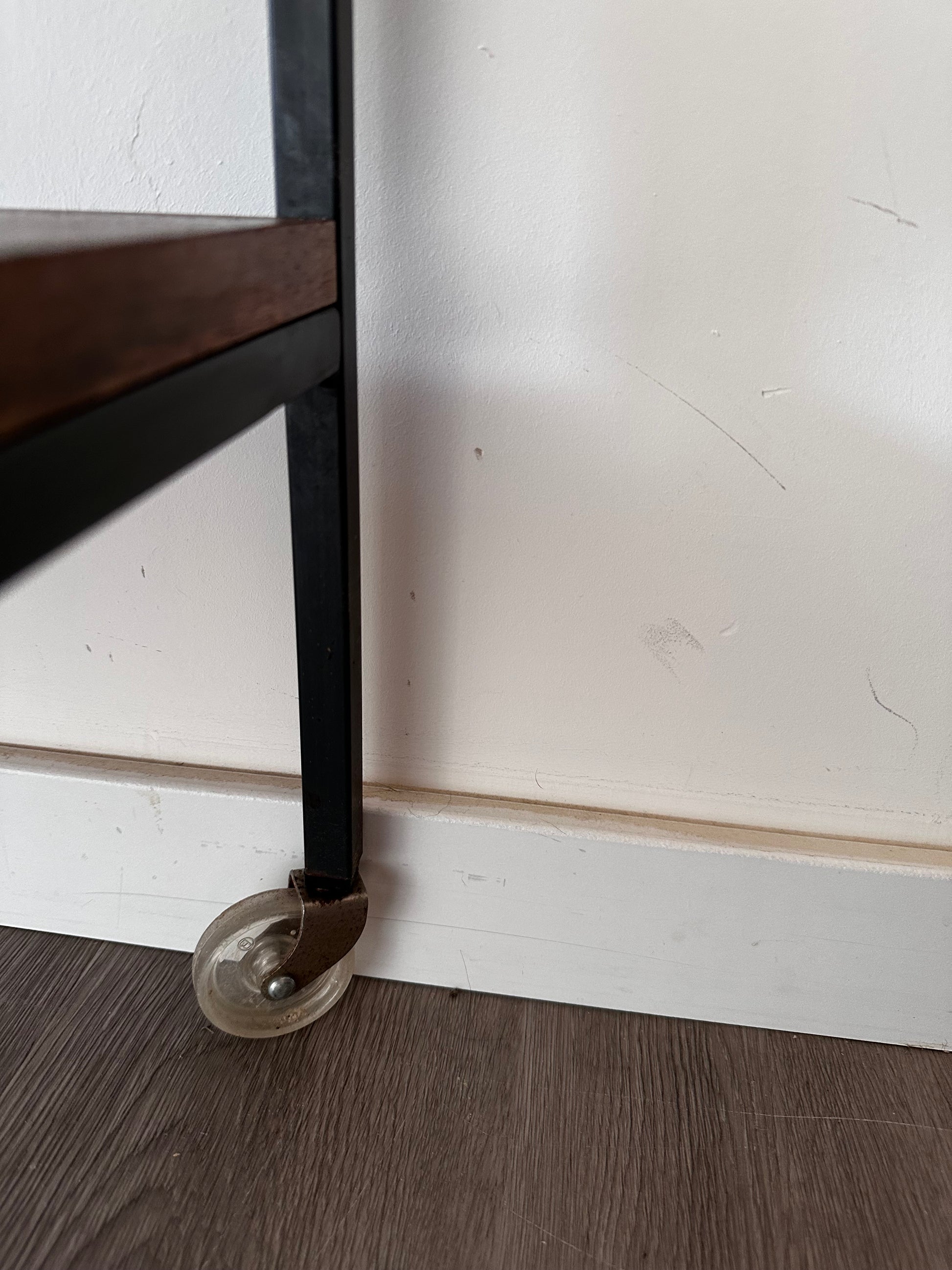 Hele gave serveerwagen, bijzettafel in de stijl van het ontwerp van Cees Braakman. Deze pastoe stijl tafel is in een mooie vintage staat met lichte liefdevolle gebruikssporen, zie fotos van het bovenblad. De tafel is voorzien van wieltjes, heeft houten bladen en een mat zwart frame. Dateert uit de jaren 60 en afkomstig uit Nederland