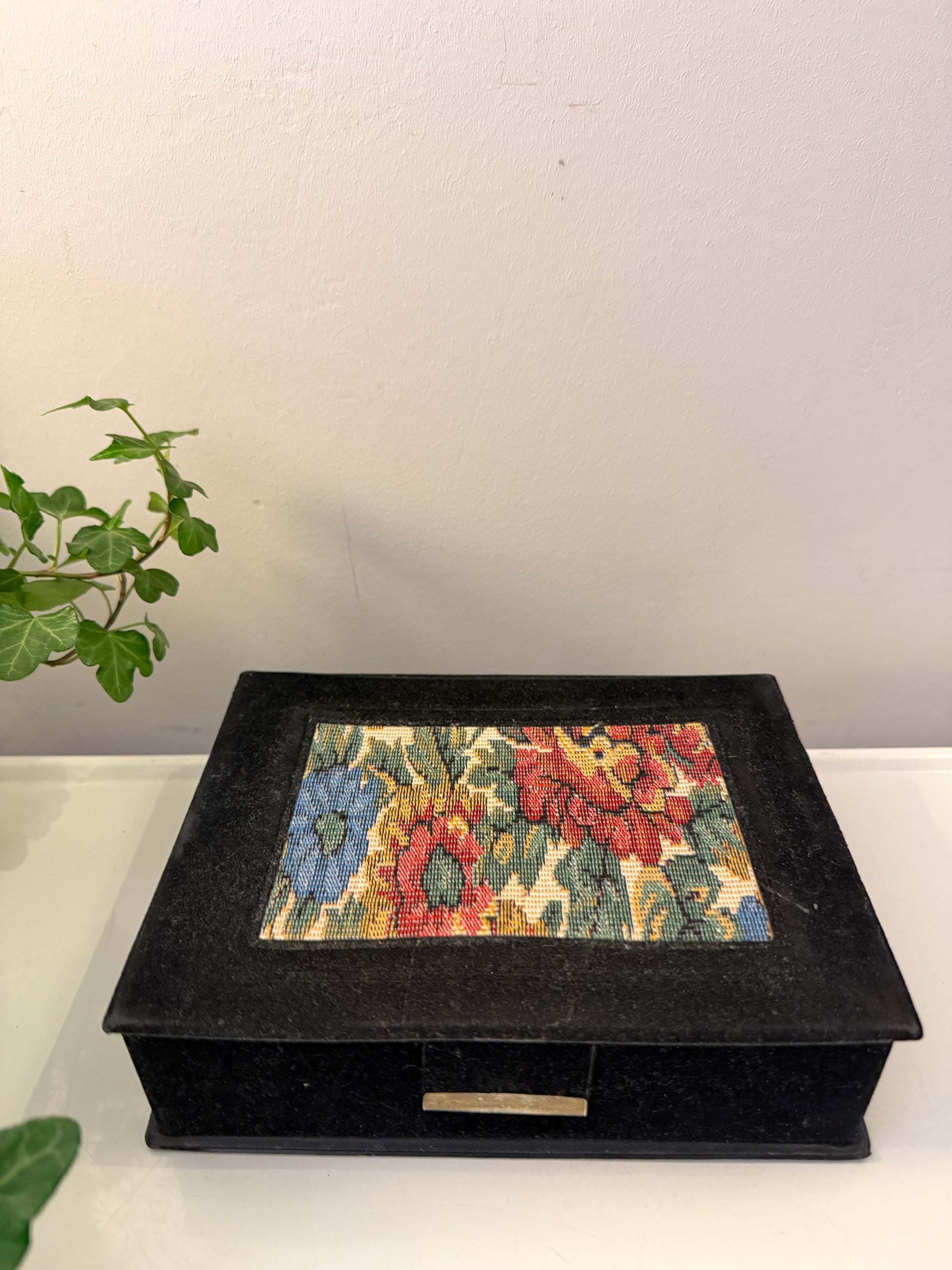 Hele mooie zwarte sieradendoos met ingelegd bloemmotief bovenop. De deksel heeft een geborduurd paneel in rood, blauw, geel en groen. Binnenkant bekleed met rood fluweel en voorzien van vakverdeling en ringrollen. In de deksel zit een spiegel. Sluit met een druksluiting aan de voorzijde. Q875