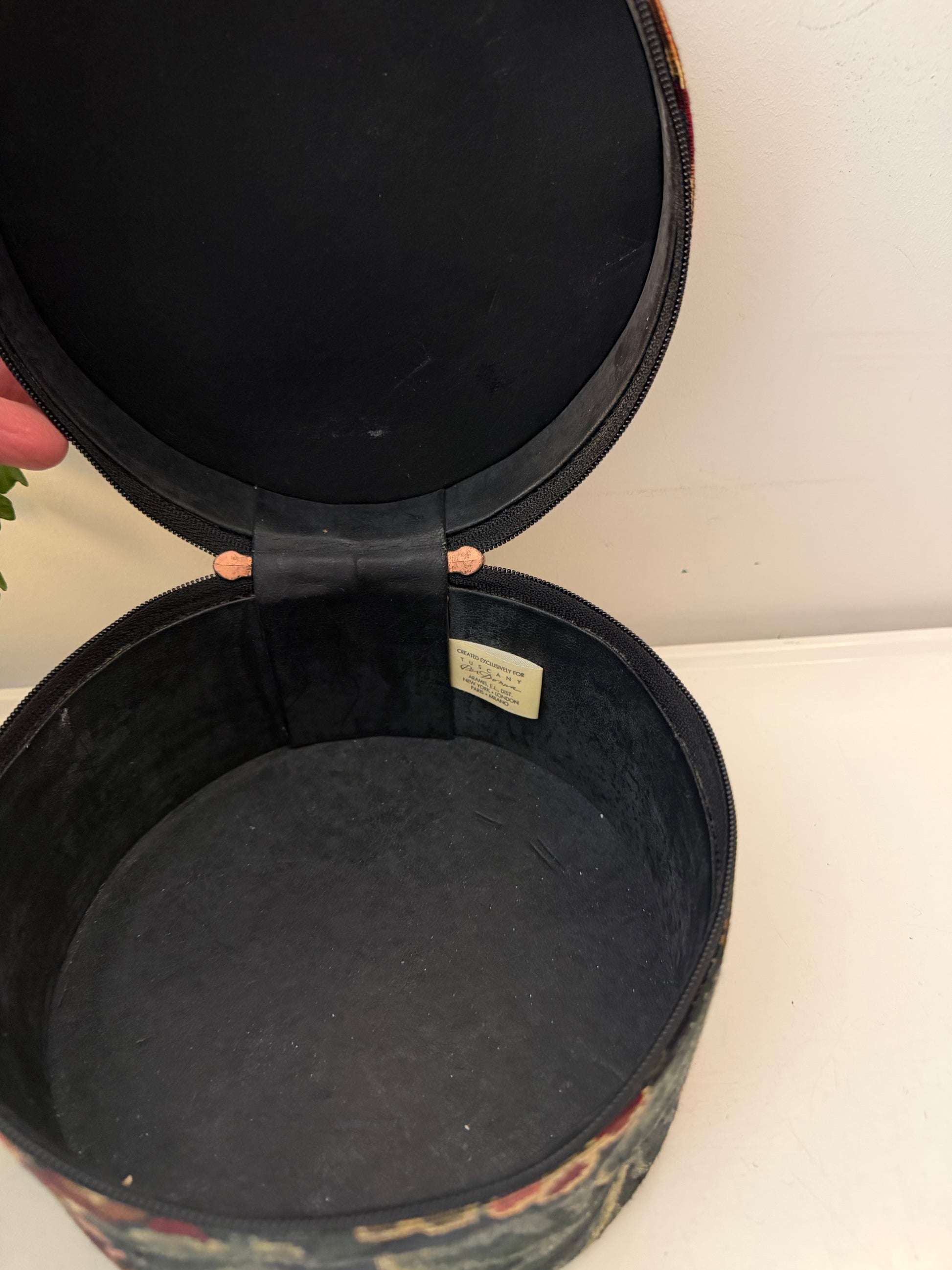 Dit is echt zo’n heerlijke sieradendoos. Rond model met een supermooie gobelin-achtige stof in donkerblauw/groen met warme bloemenkleuren. En de rits heeft twee stervormige hangers 😍 Binnenkant is zwart gevoerd. Q876